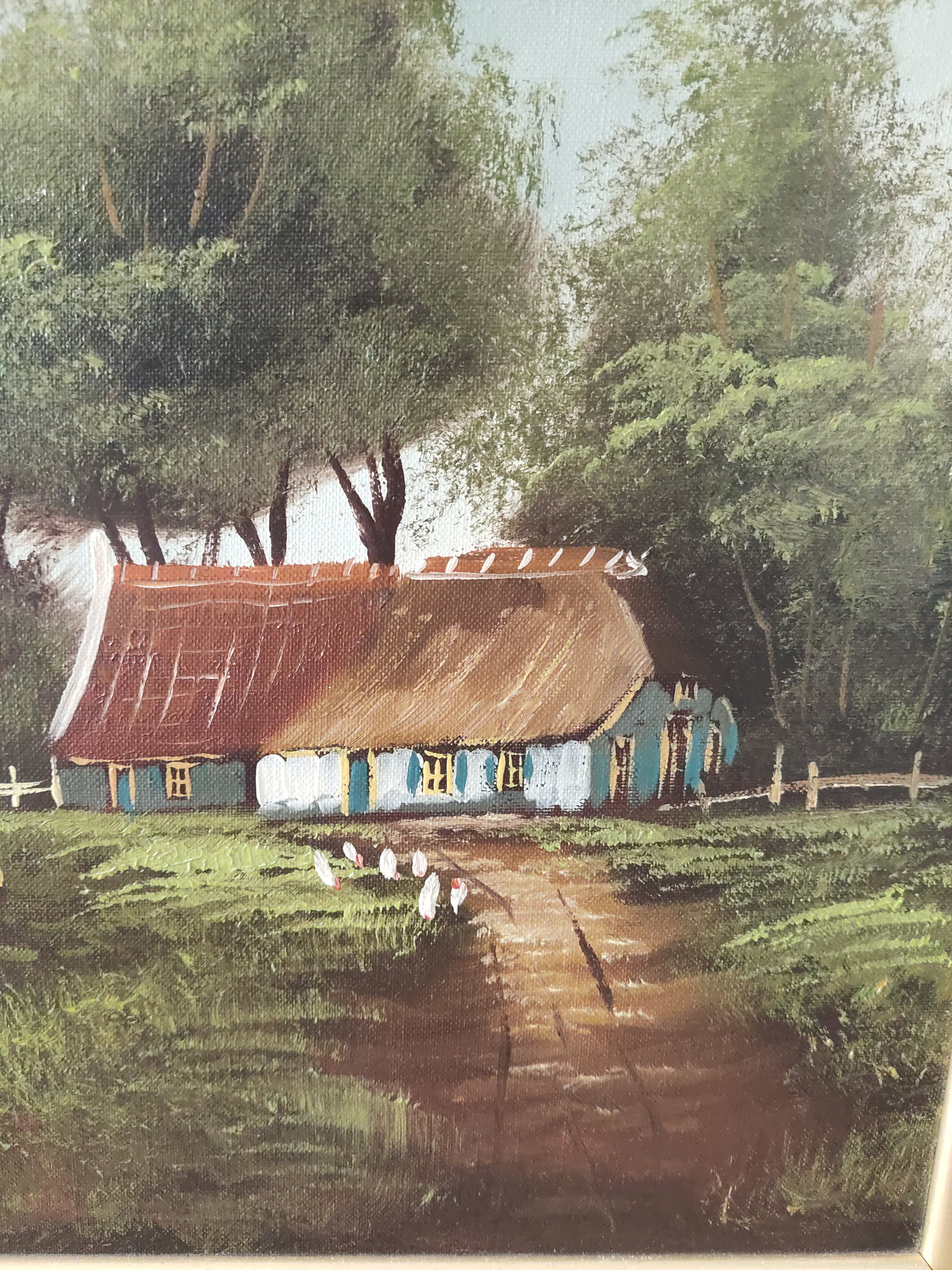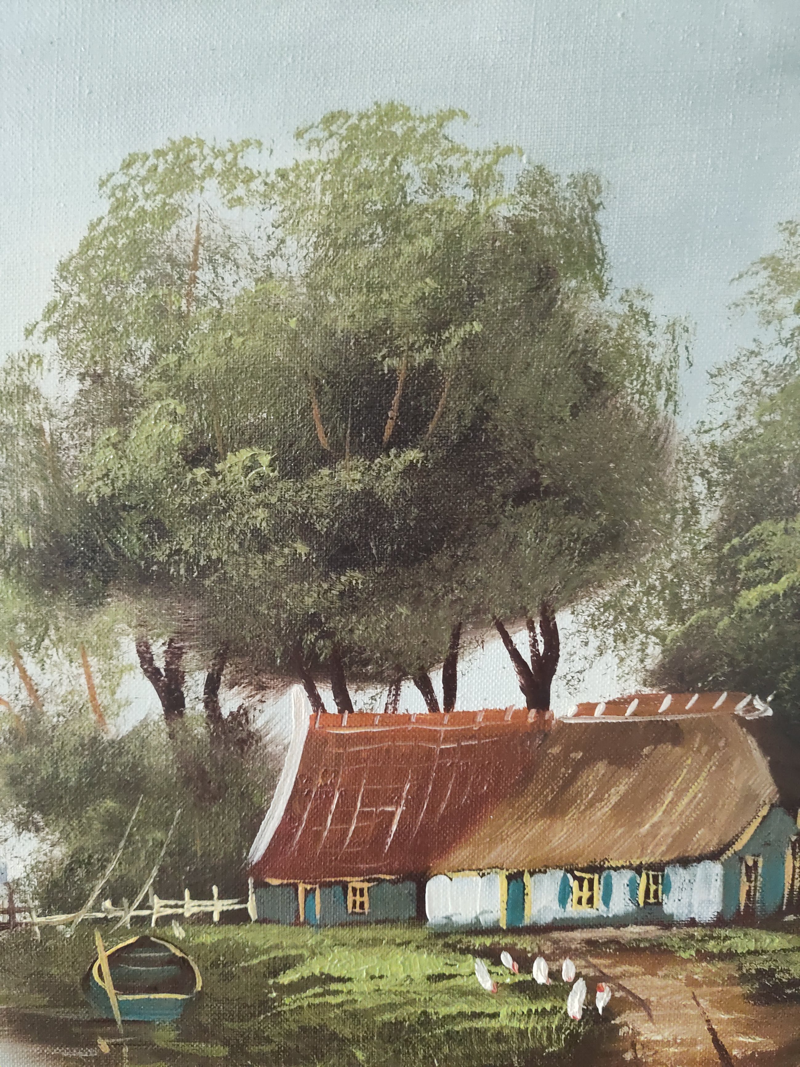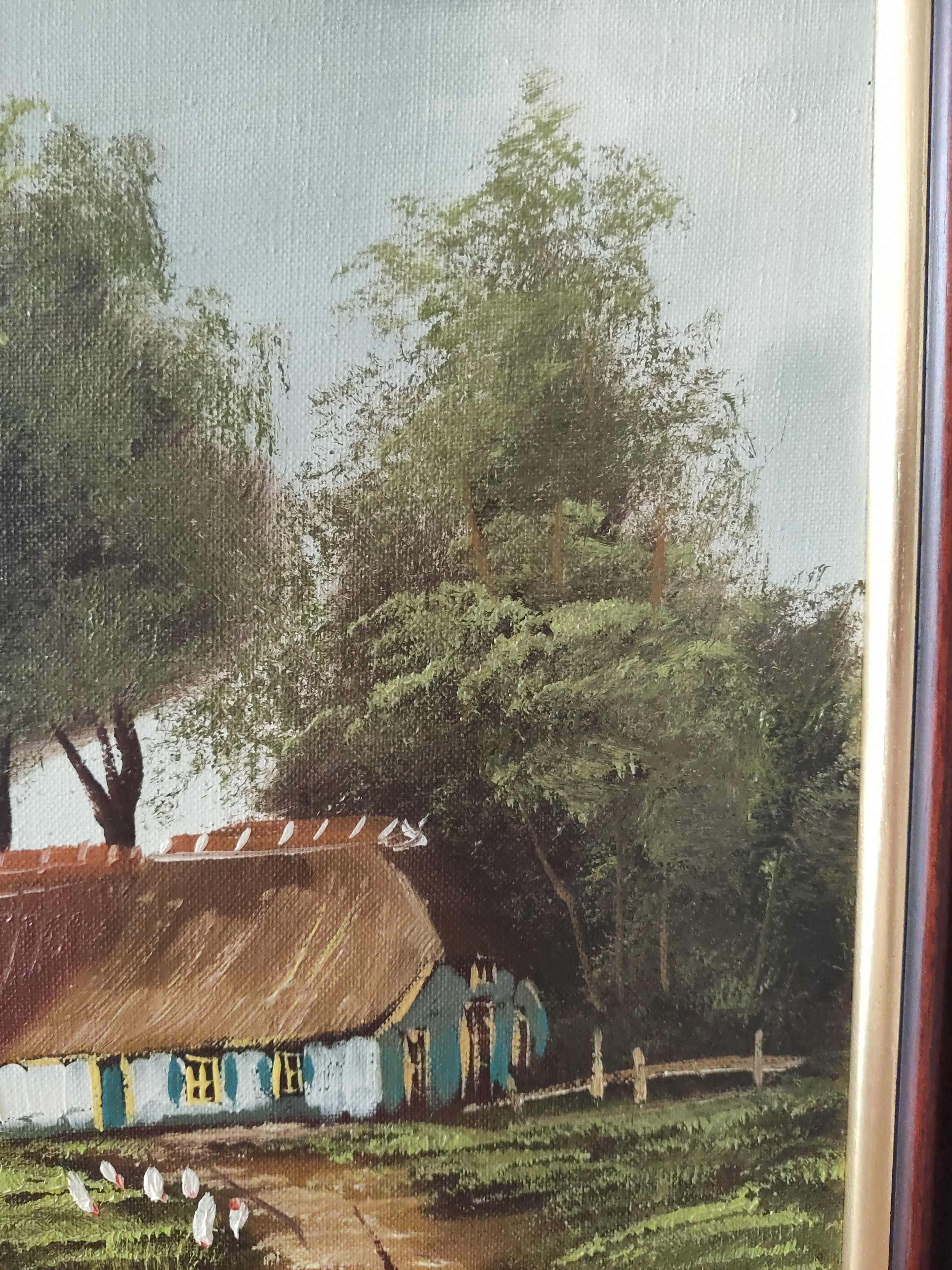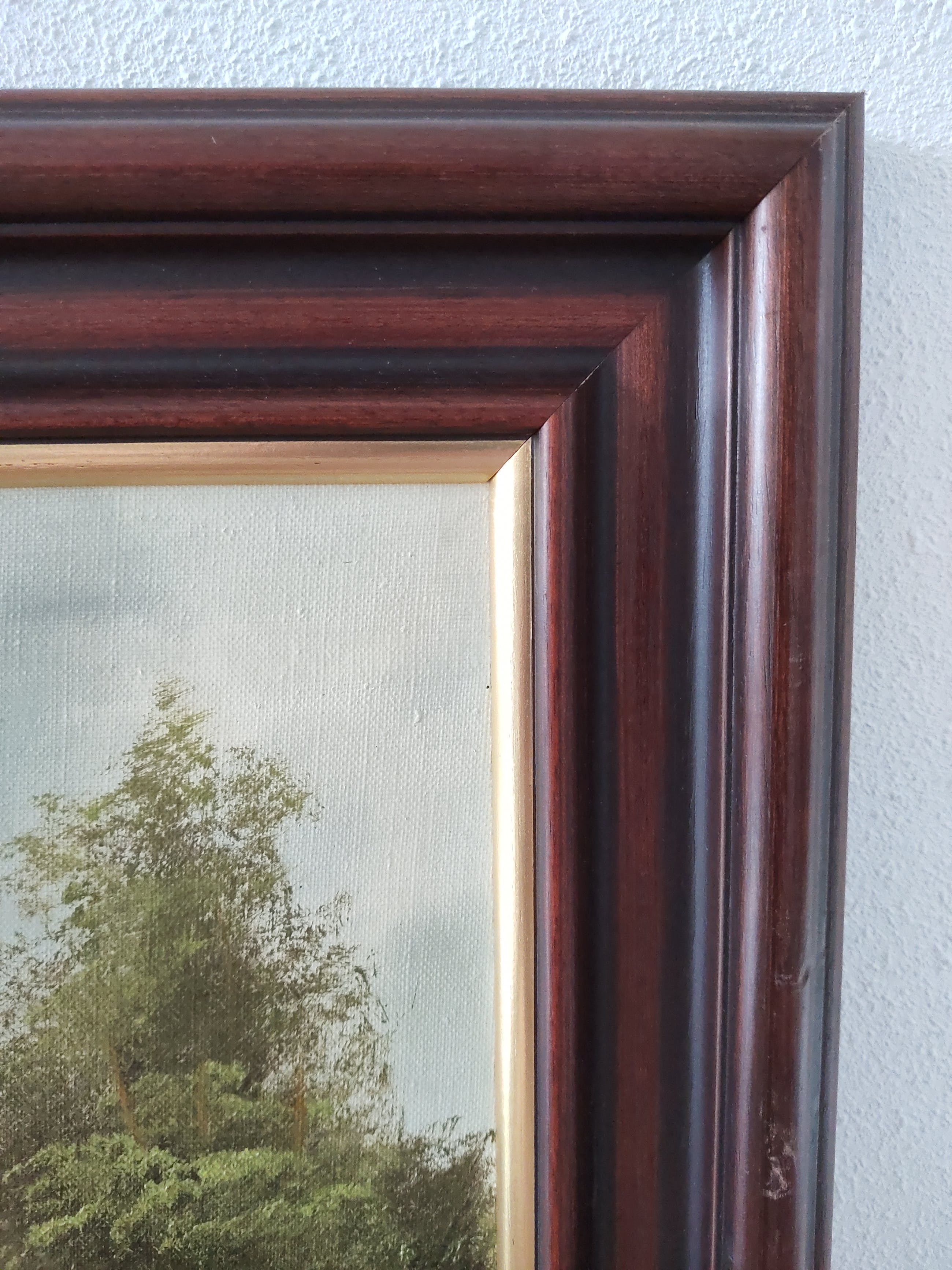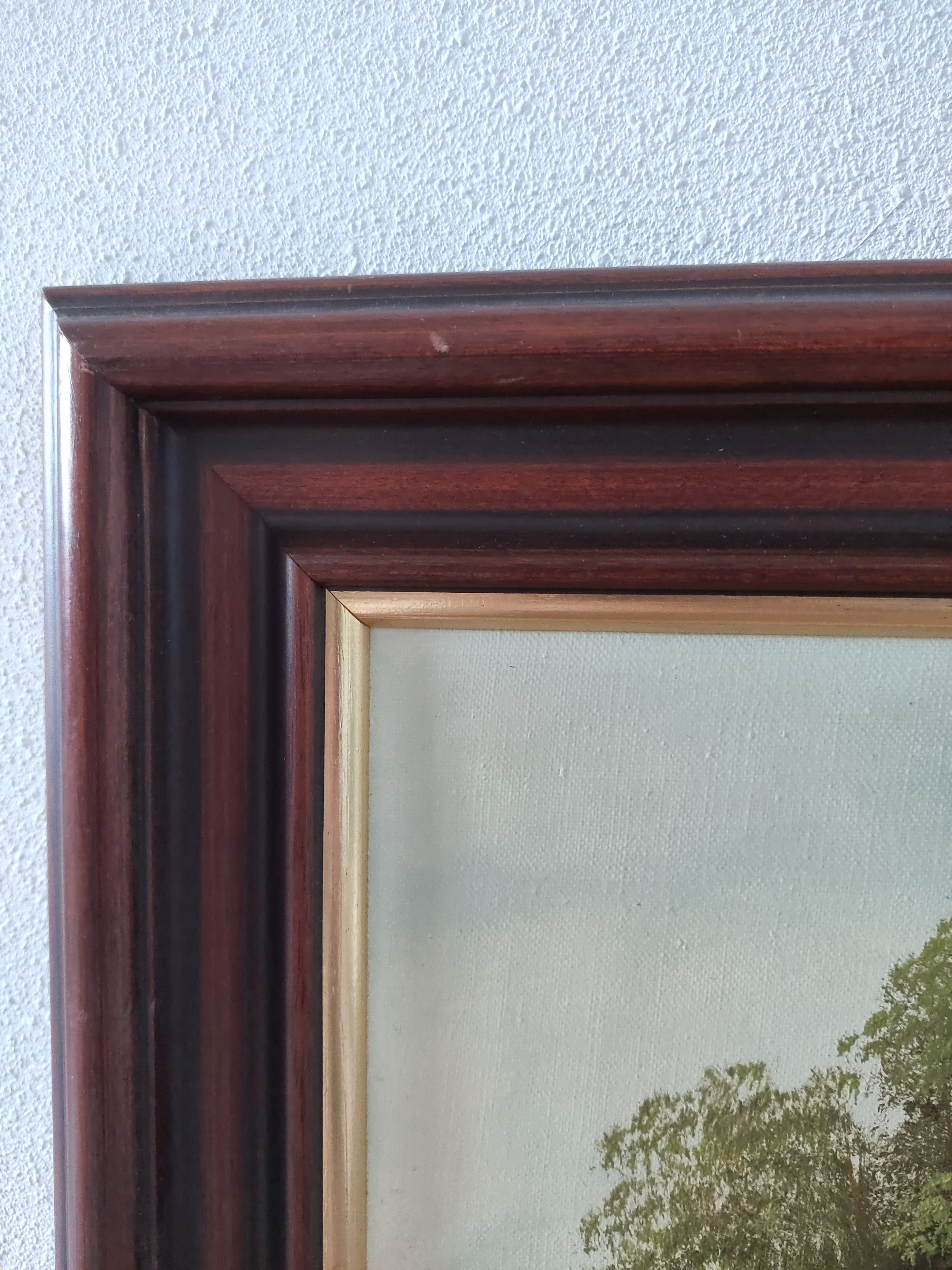 Prachtig schilderij met een landweg en boerderij op de voorgrond. Bootje in het water en in de verte een molen. Waarschijnlijk een Fries landschap, waar Bartha ook woonde. De lijst is in redelijke staat, één echte beschadiging. Zie foto's