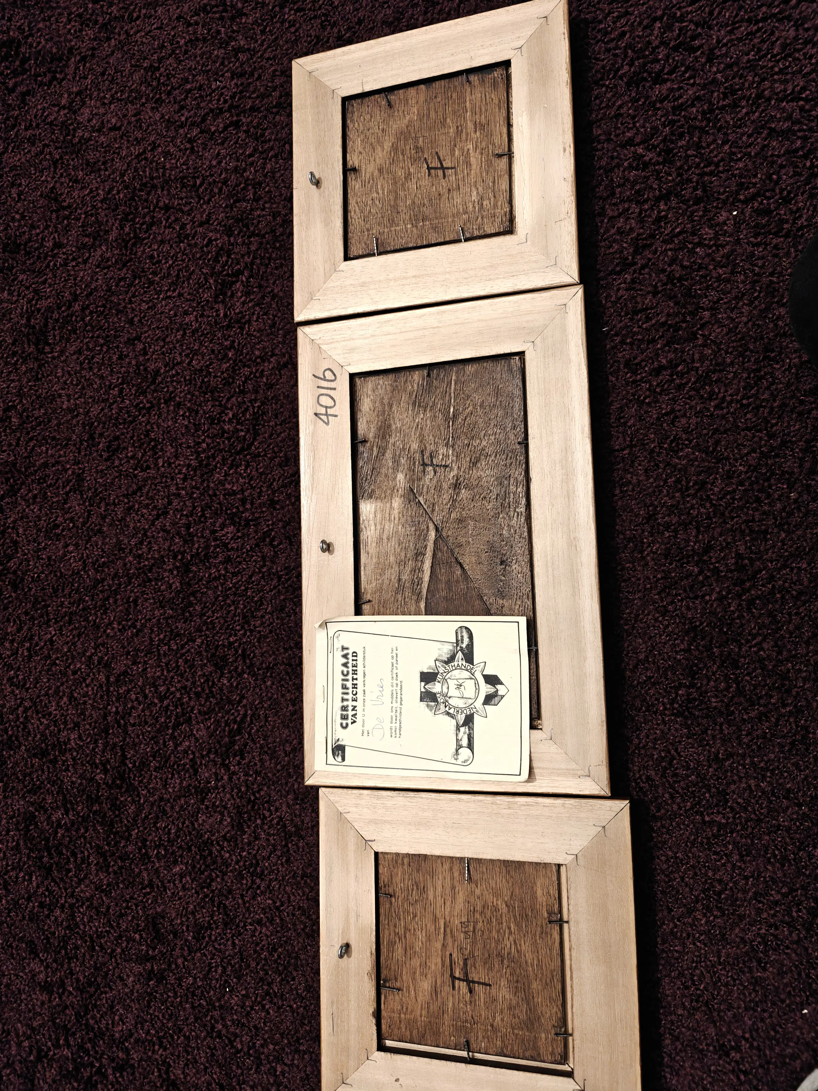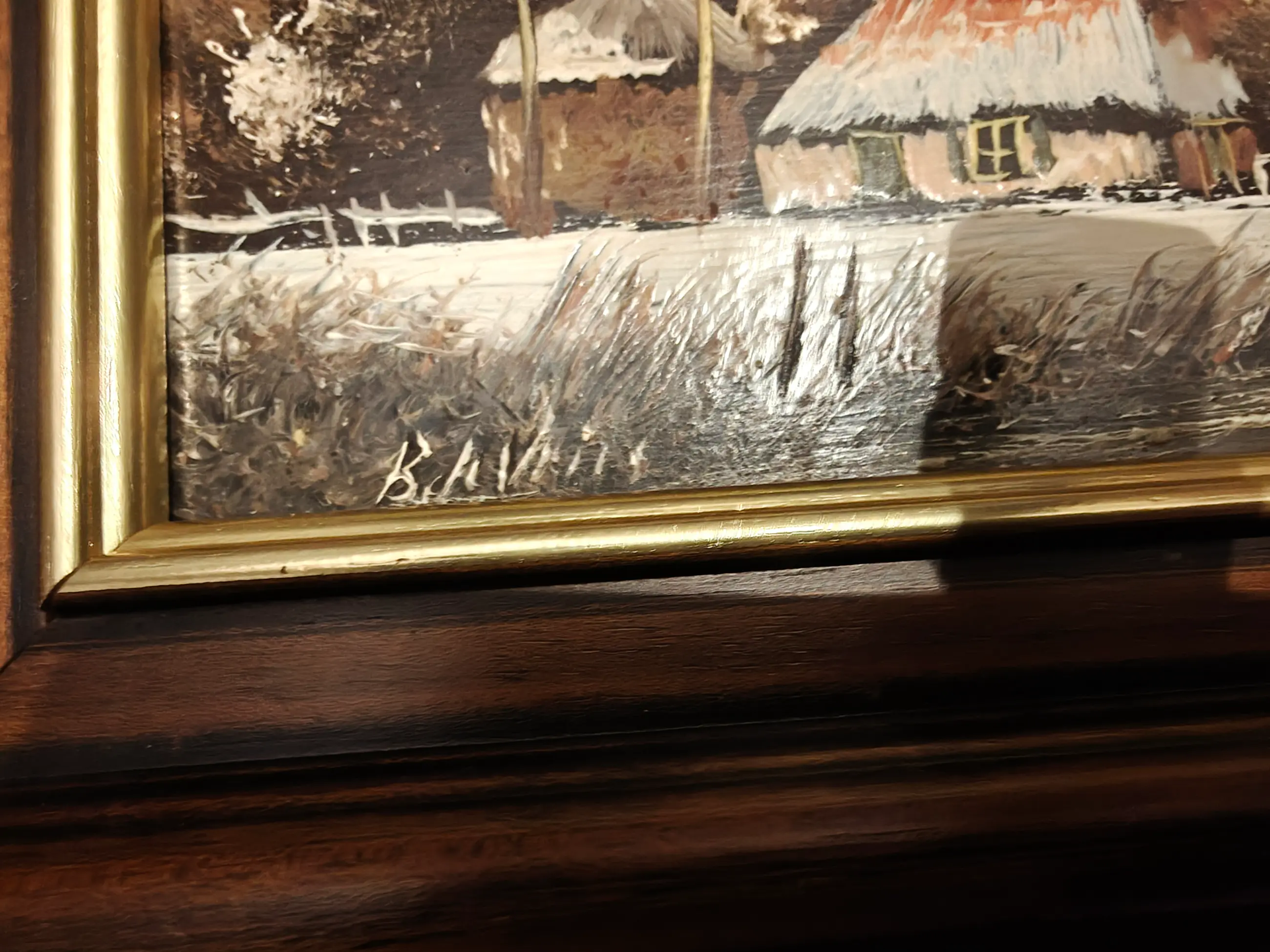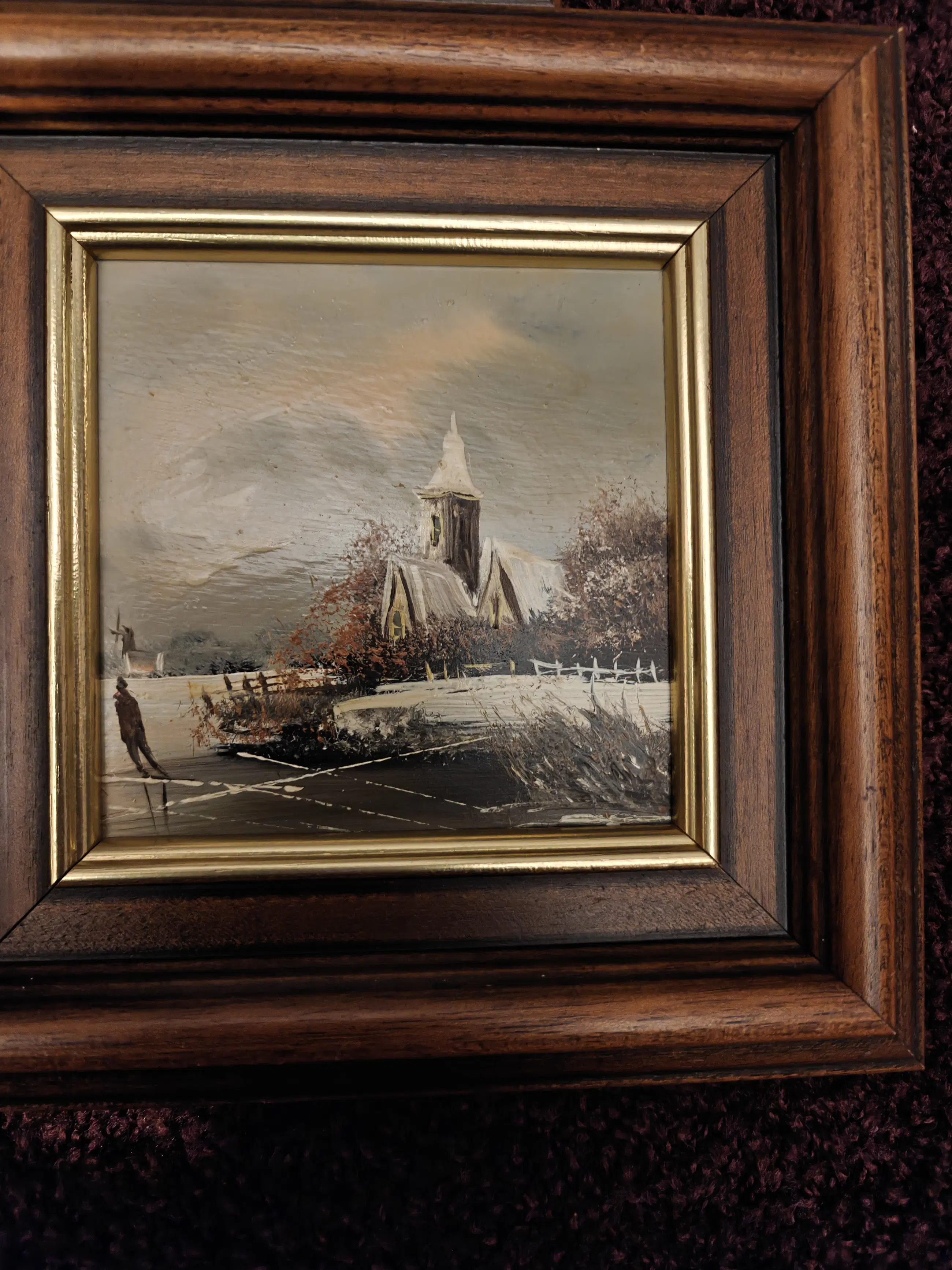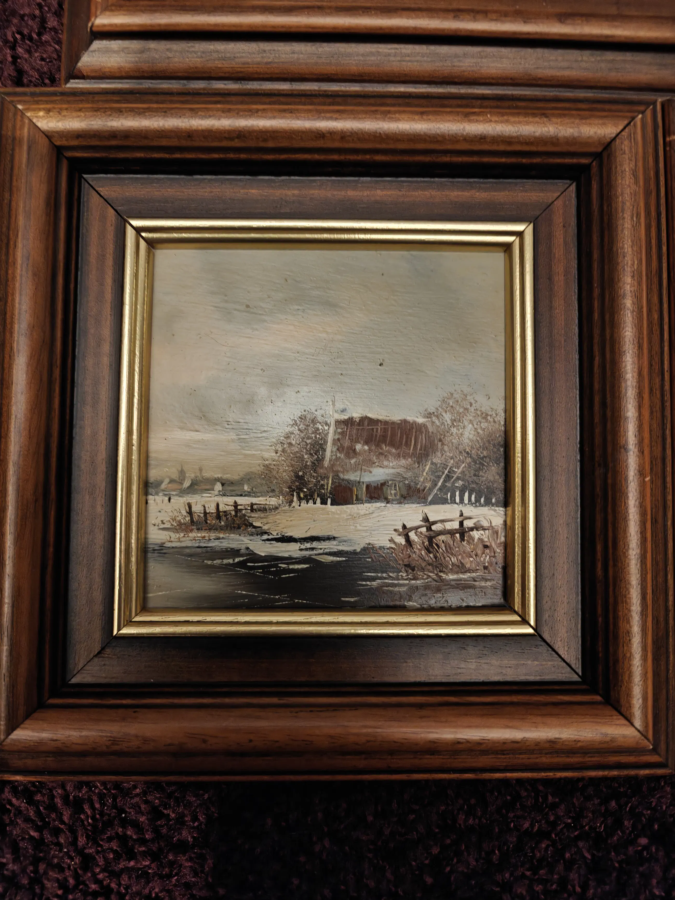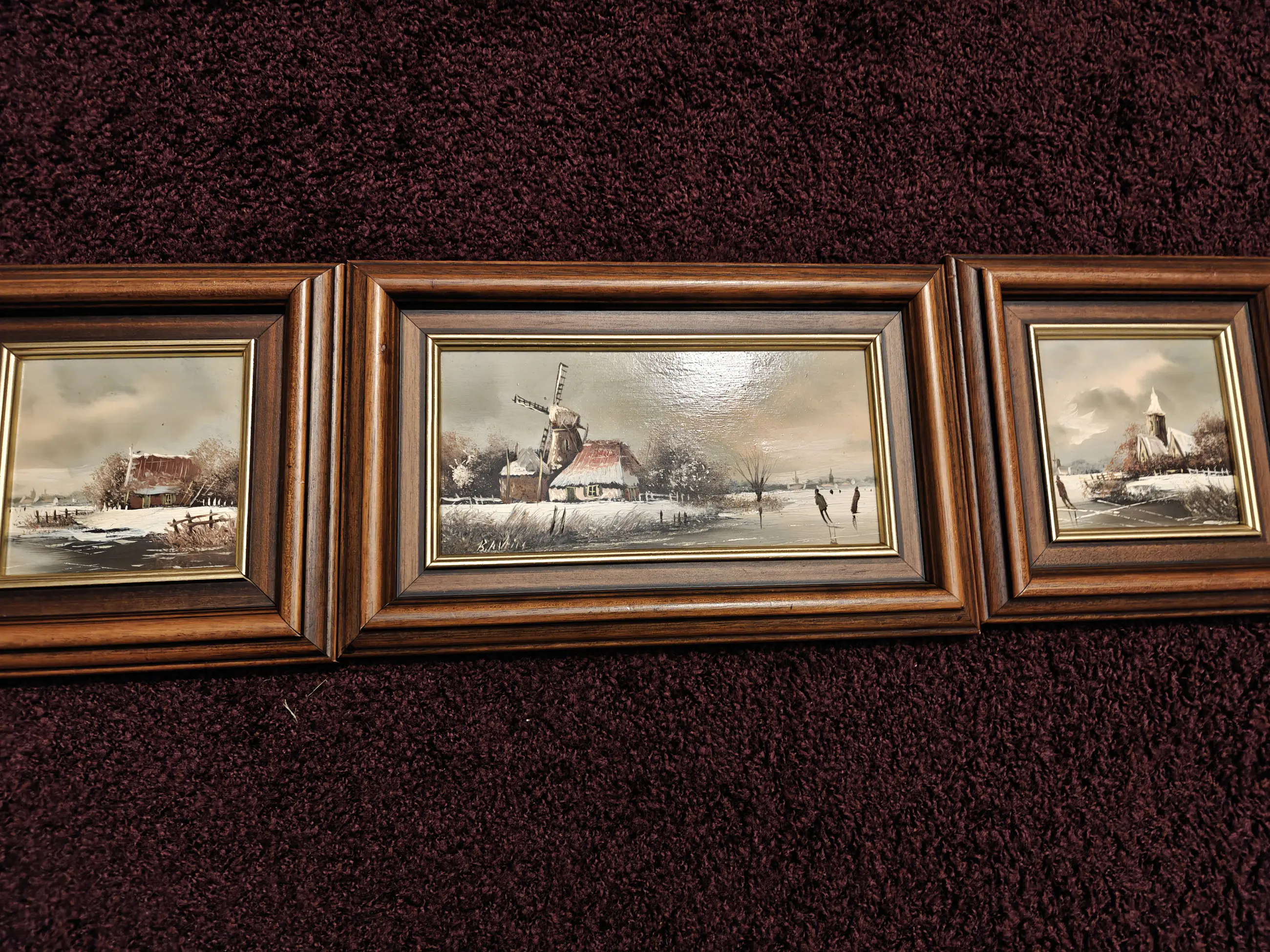 Het drieluik toont een harmonieus winters tafereel met boerderijen, een kerk en een molen, uitgevoerd in warme aardetinten en met duidelijke penseelstructuur. De schilderijen zijn met de hand geschilderd op hout, wat zorgt voor een robuuste en authentieke uitstraling.