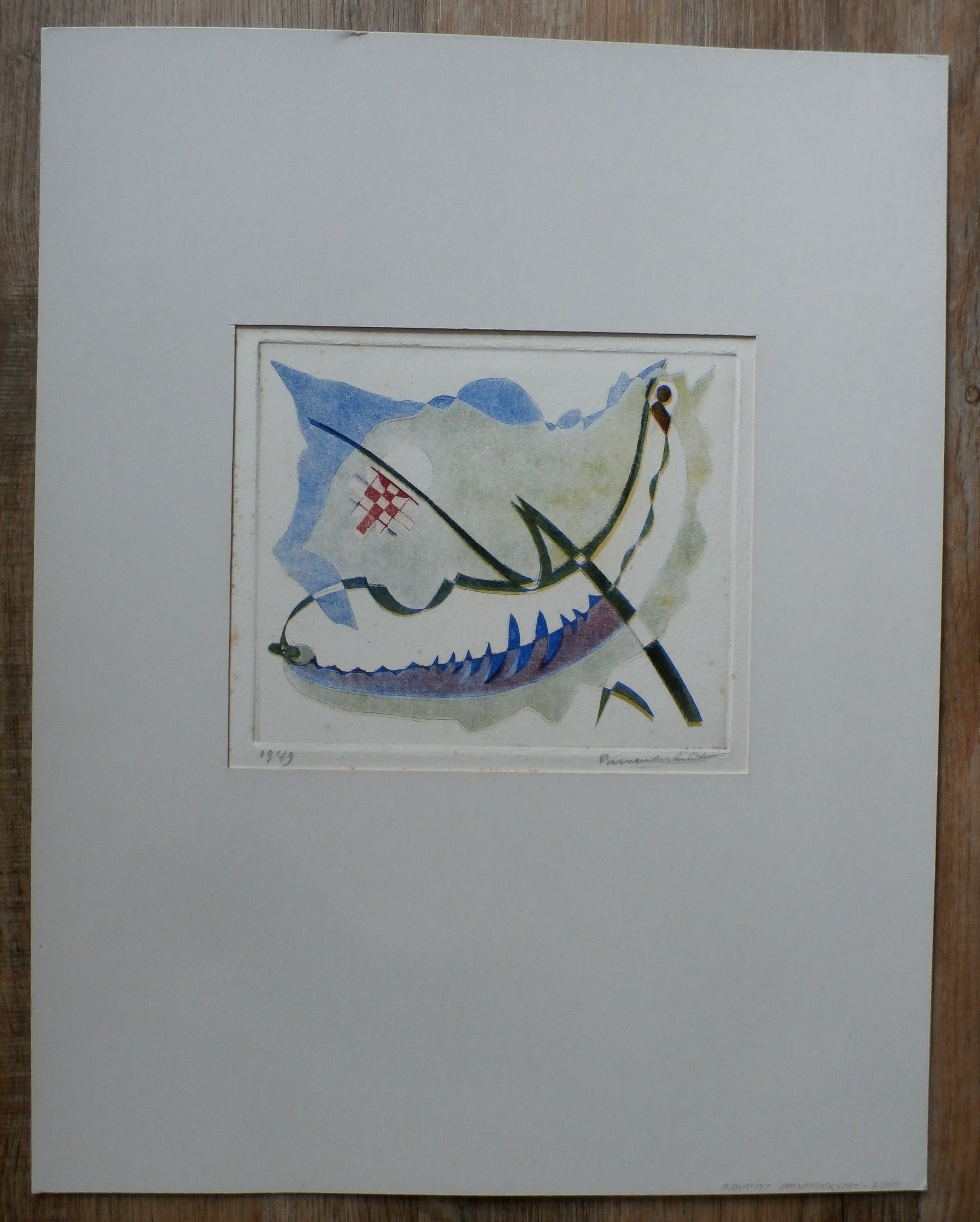 Ets/aquatint van Bas van der Smit. Jaar: 1949. Afmetingen blad incl passepartout: H50.5 x b40 cm. Afmetingen voorstelling: H17.5 x b21 cm. Het werk is rechtsonder, met potlood, gesigneerd door de kunstenaar. De authenticiteit van het, aangeboden, werk wordt volledig gegarandeerd. Een certificaat van echtheid kan, op aanvraag, worden gemaild.