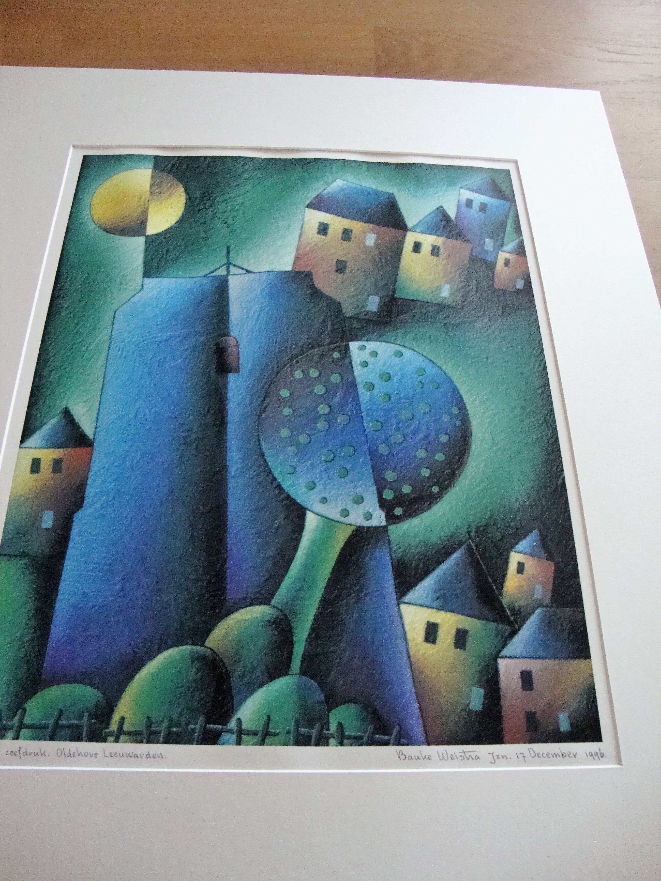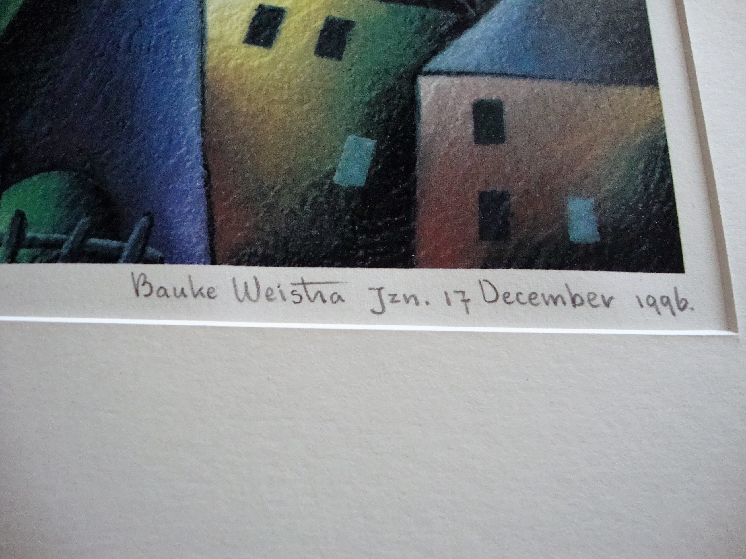 Met potlood gesigneerde zeefdruk 53/100 van Bauke Weistra Jzn. Deze zeefdruk is gesigneerd op 17 december 1996. De druk is gerealiseerd op zwaar kunstdrukpapier en met keurige passe-partout, achter glas ingelijst in stevige aluminium lijst.