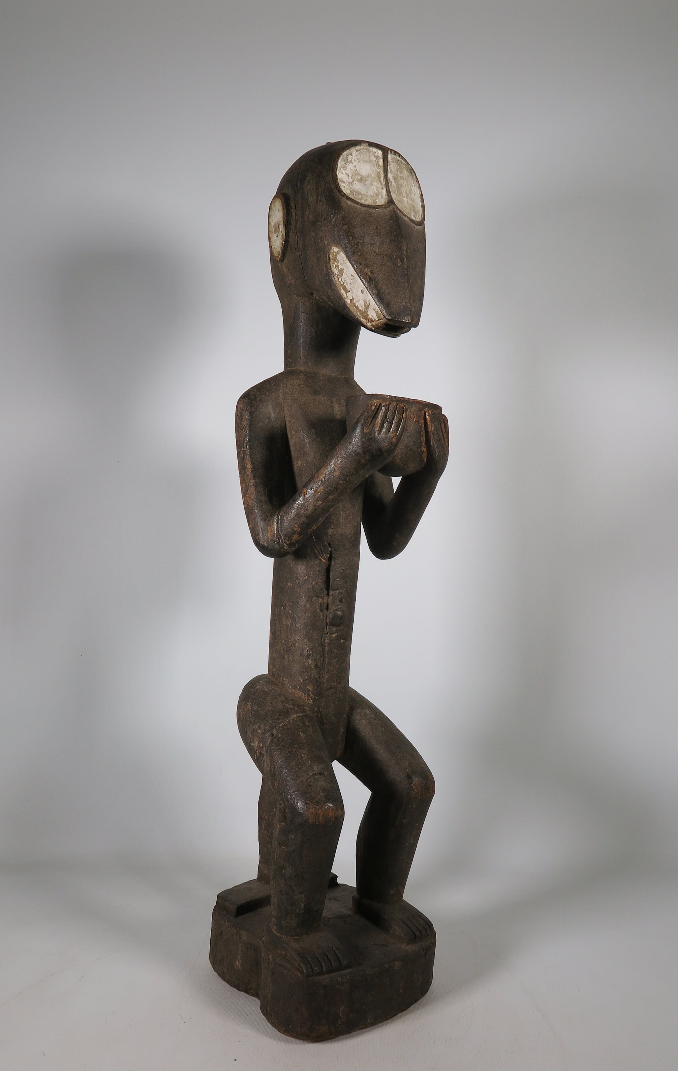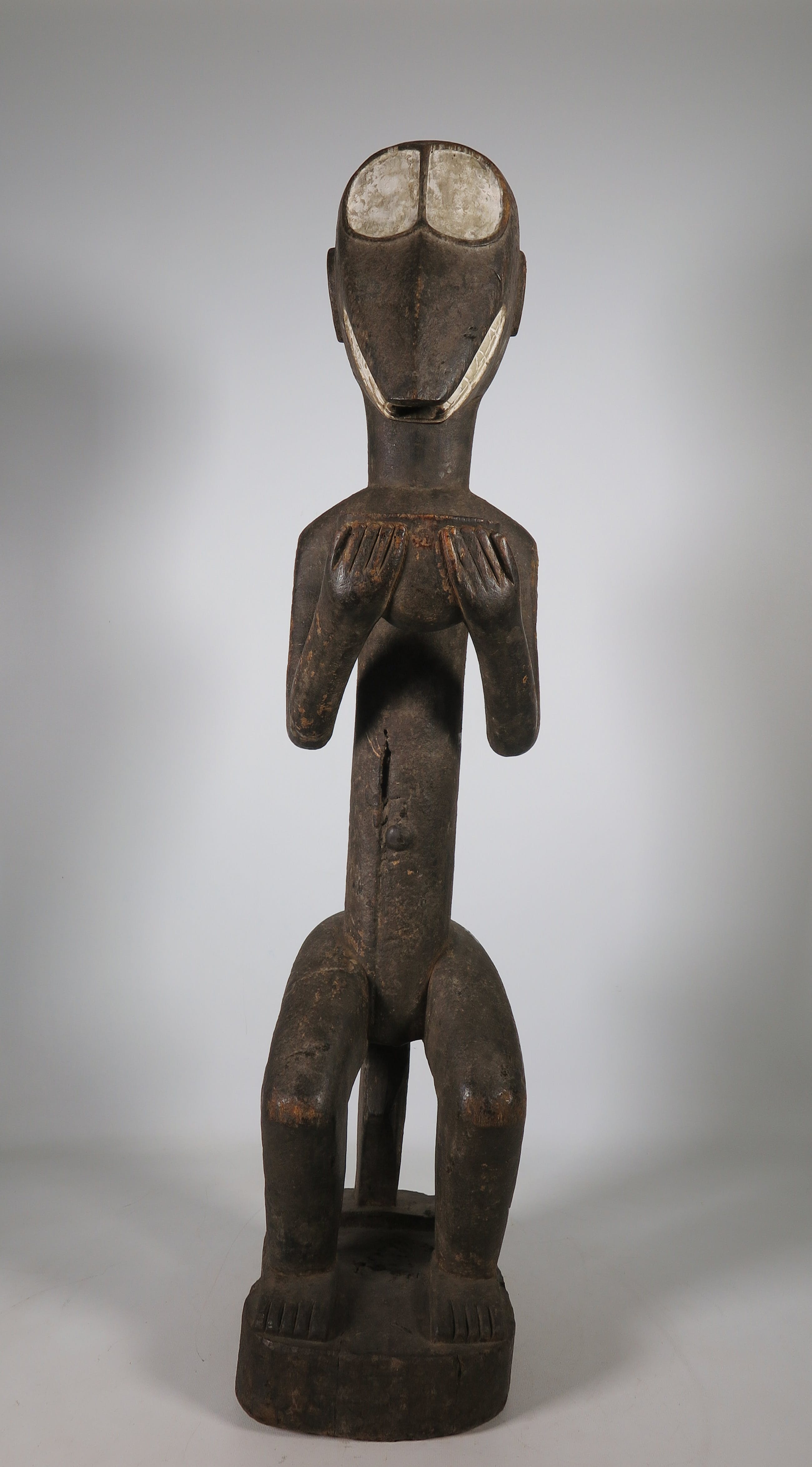 Houten gestoken Baule figuur van een zittende aap met witte ogen, mond en oren.
