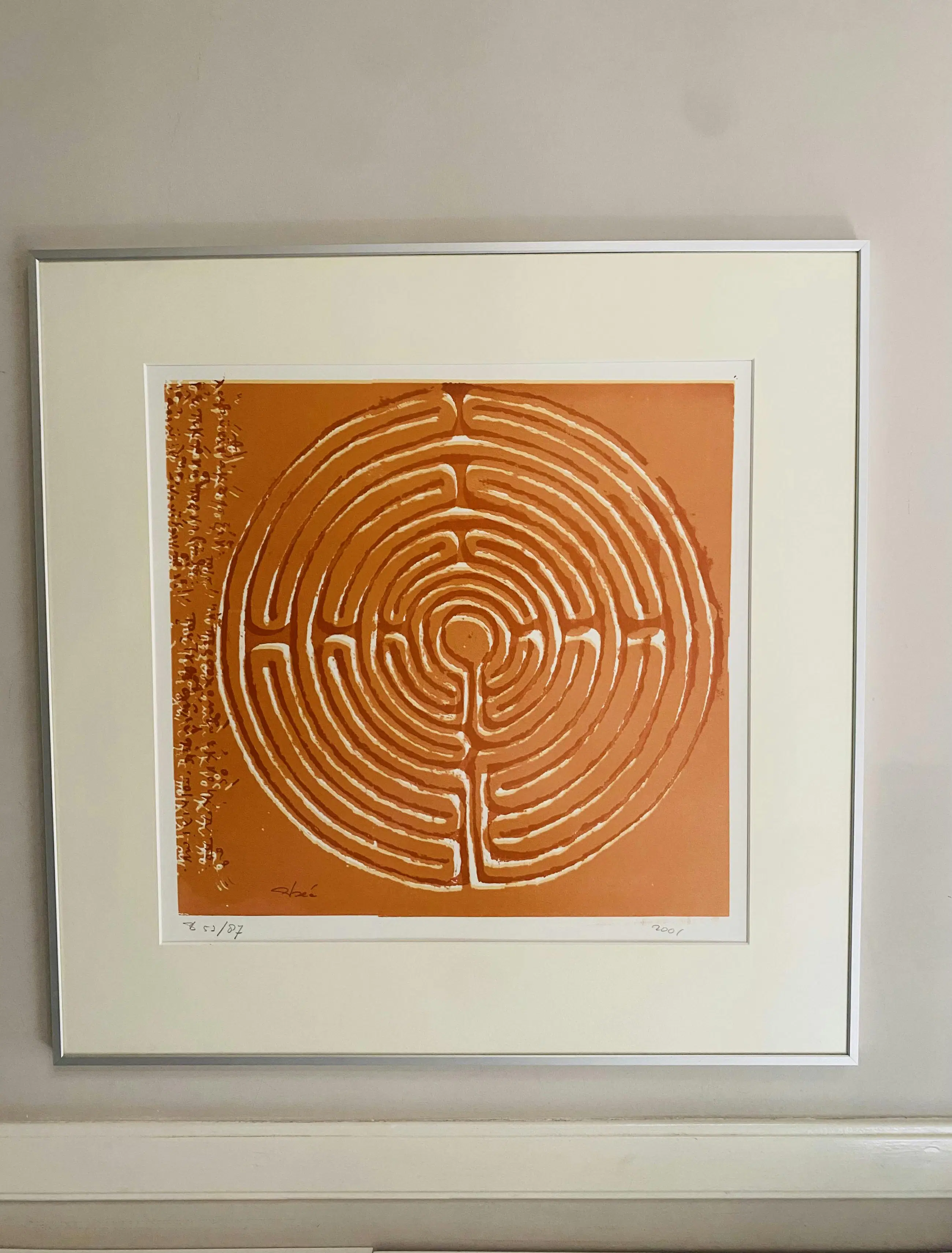 Béa Verheul werkte vanaf haar laatste jaar aan de kunstacademie (1993 AKI – Enschede) aan het thema labyrint met als basis de grote doolhof in Ruurlo. “Maar een doolhof is geen labyrint. In een doolhof is de weg minder belangrijk dan het doel, het vinden van de uitgang of het middelpunt met vaak een attractie. In een labyrint is het belangrijkste doel de weg; als je het pad volgt, met alle verwarrende bochten, kom je vanzelf bij de uitgang”, zo vertelt zij, in haar galerie die ‘vernoemd’ is naar het kenteken van de auto van haar schoonvader uit de jaren vijftig van de vorige eeuw (de letter M stond voor de provincie Gelderland). Het wezenlijke verschil tussen een doolhof en labyrint wordt duidelijk in Verheuls grote verzameling boeken en publicaties over het labyrint en die ook in haar galerie terug te vinden is. De Ruurlose laat tijdens KunstOogst een aantal etsen zien die geïnspireerd zijn op het labyrint en men kan haar labyrint-archief inzien. Bezoekers kunnen zelf ook druktechnieken uitproberen.