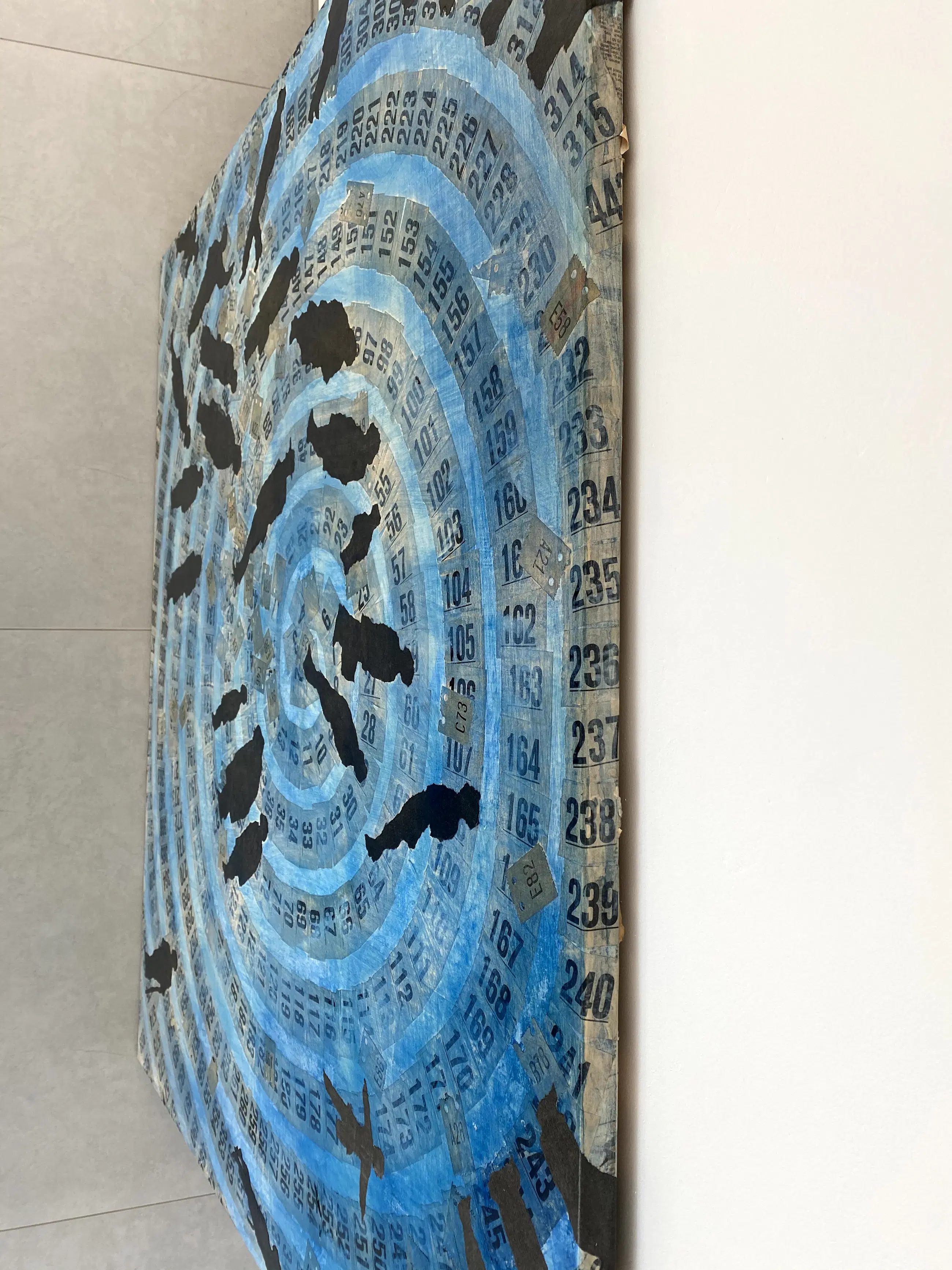 Deze is gemaakt met krantenpapier en tombola lotnummer blaadjes. Op de foto's kan je duidelijk de gebruikte materialen, signatuur.. zien.