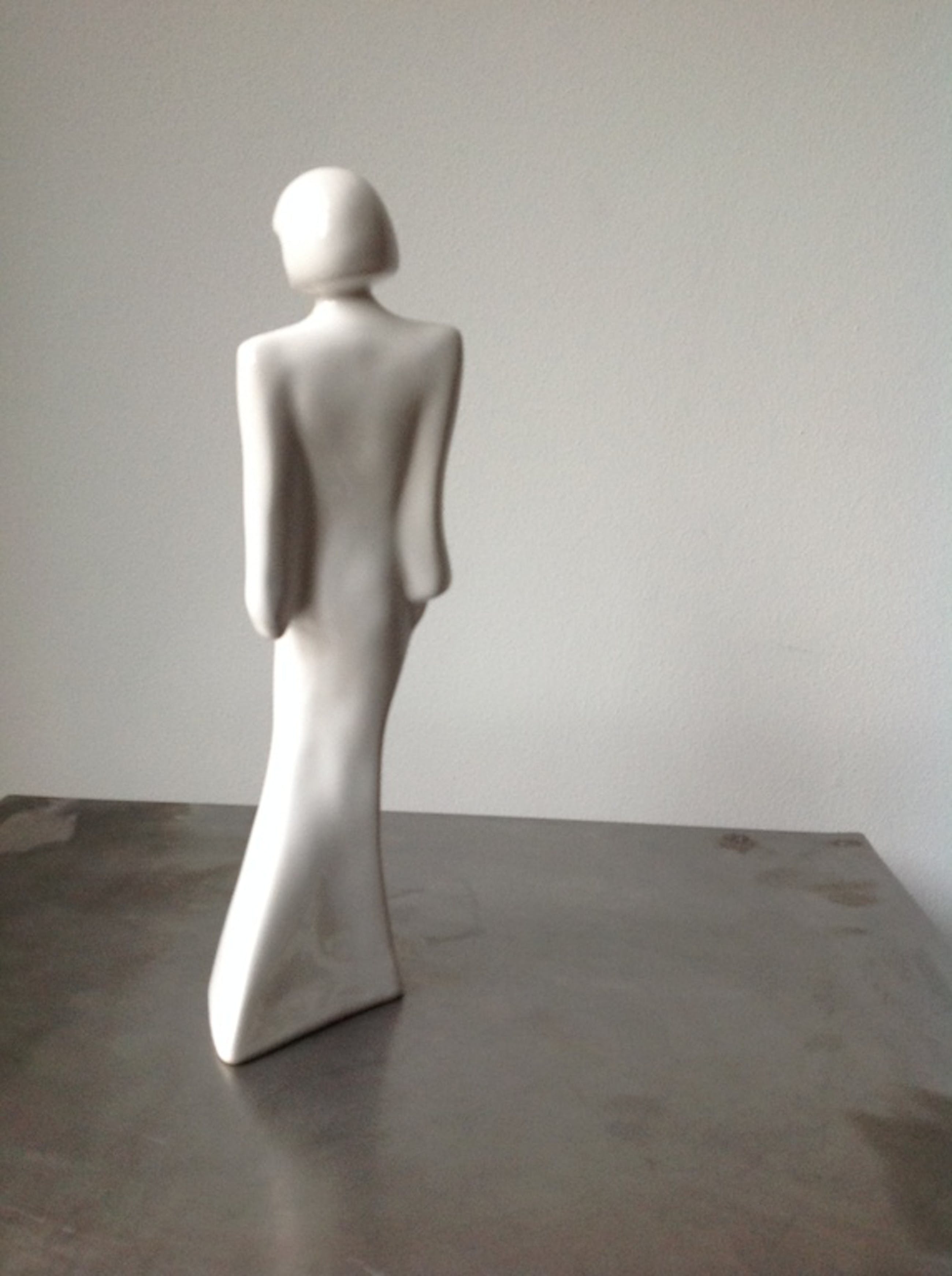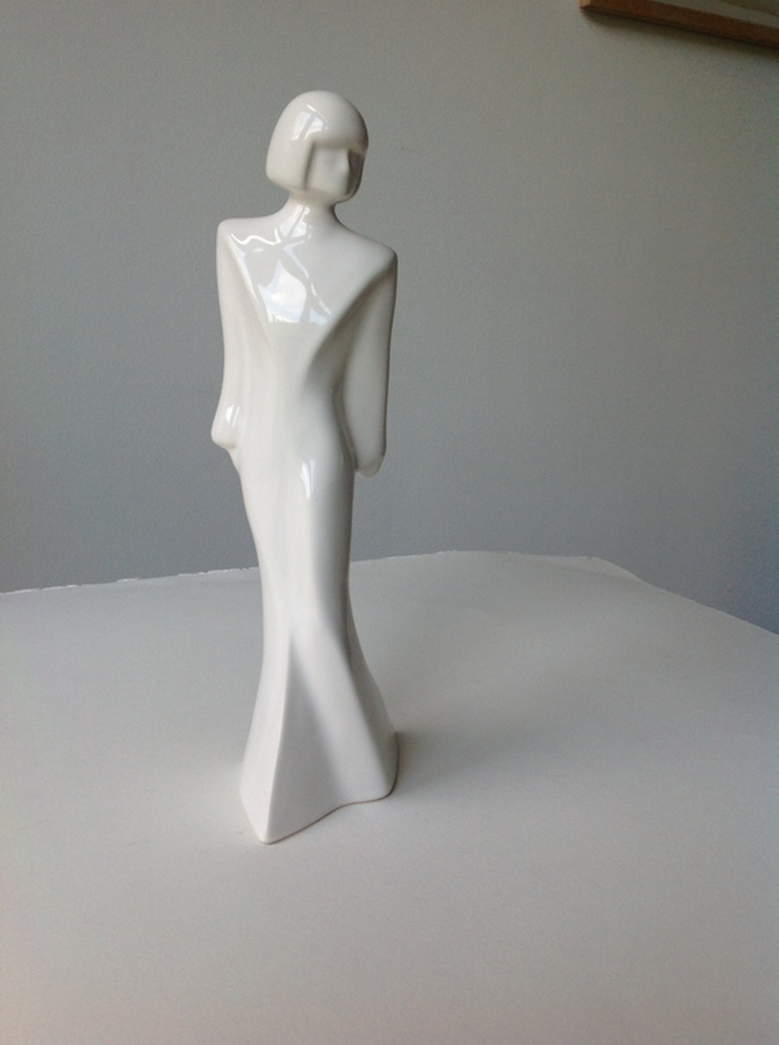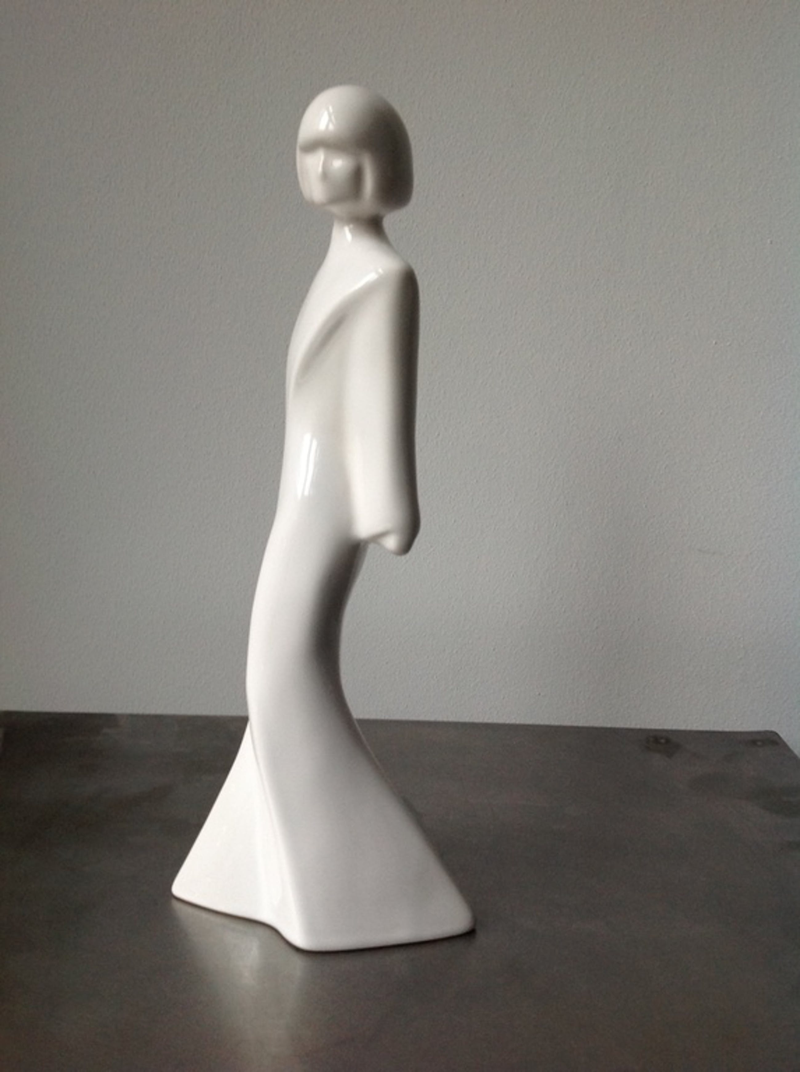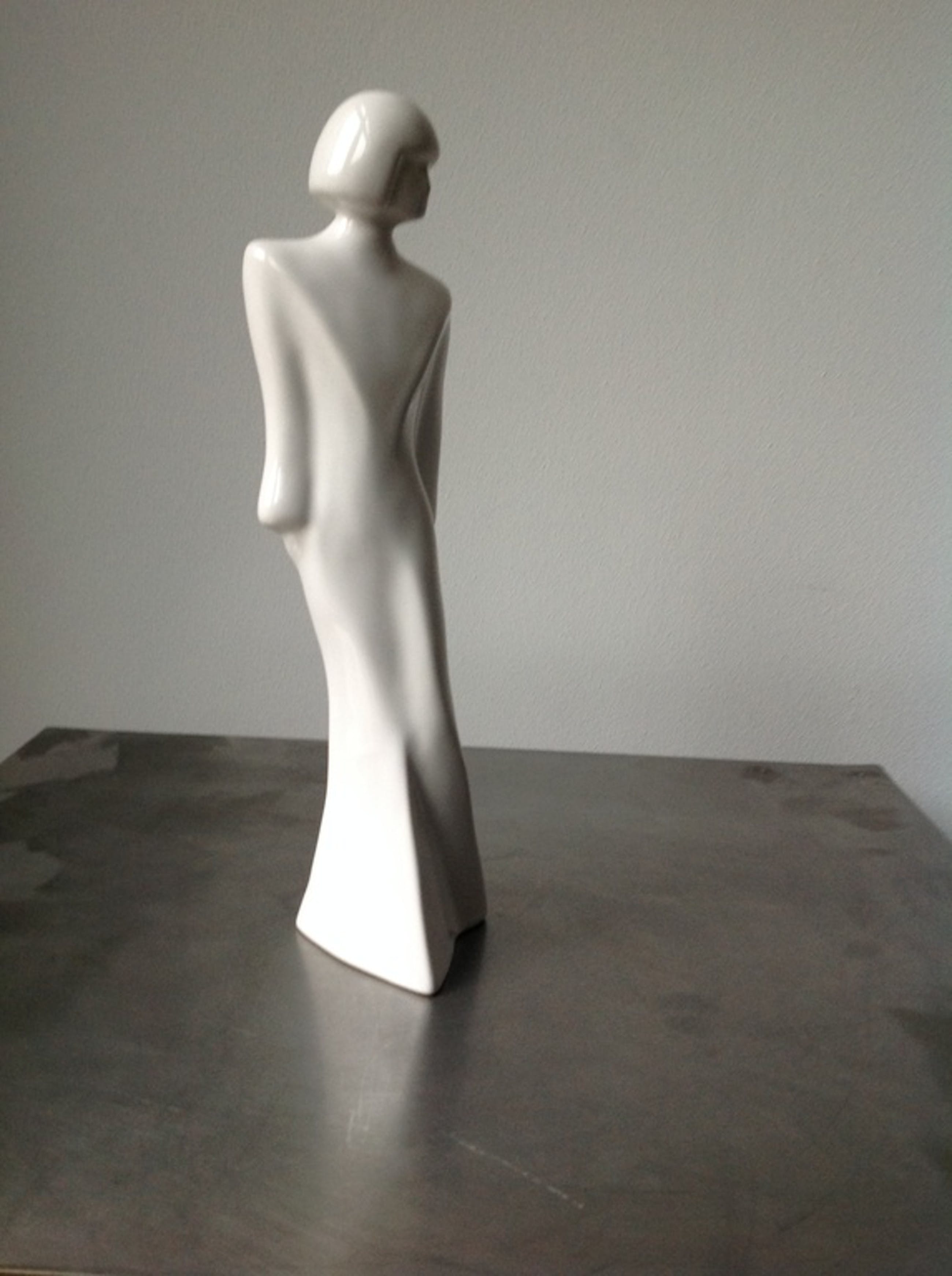 Beeld in Art Déco stijl van Yvonne Niessen voor Flora Keramiek. Hoogglans glazuur. Kleur roomwit.