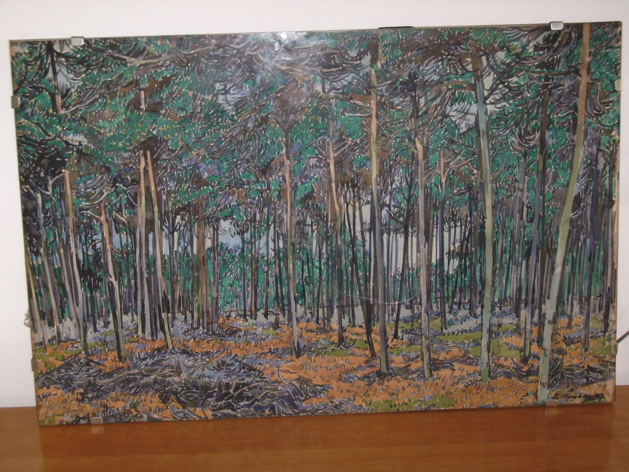 Beint Mankes was getrouwd met een jeugdvriendin van mijn moeder. Zij waren heel arm, en mijn moeder heeft dit werk voor Hfl 100 van hem gekocht, om hen financieel te steunen. Dit van haar verpleegsterssalarisje! (De lijn over het werk is beschadiging van het glas!)