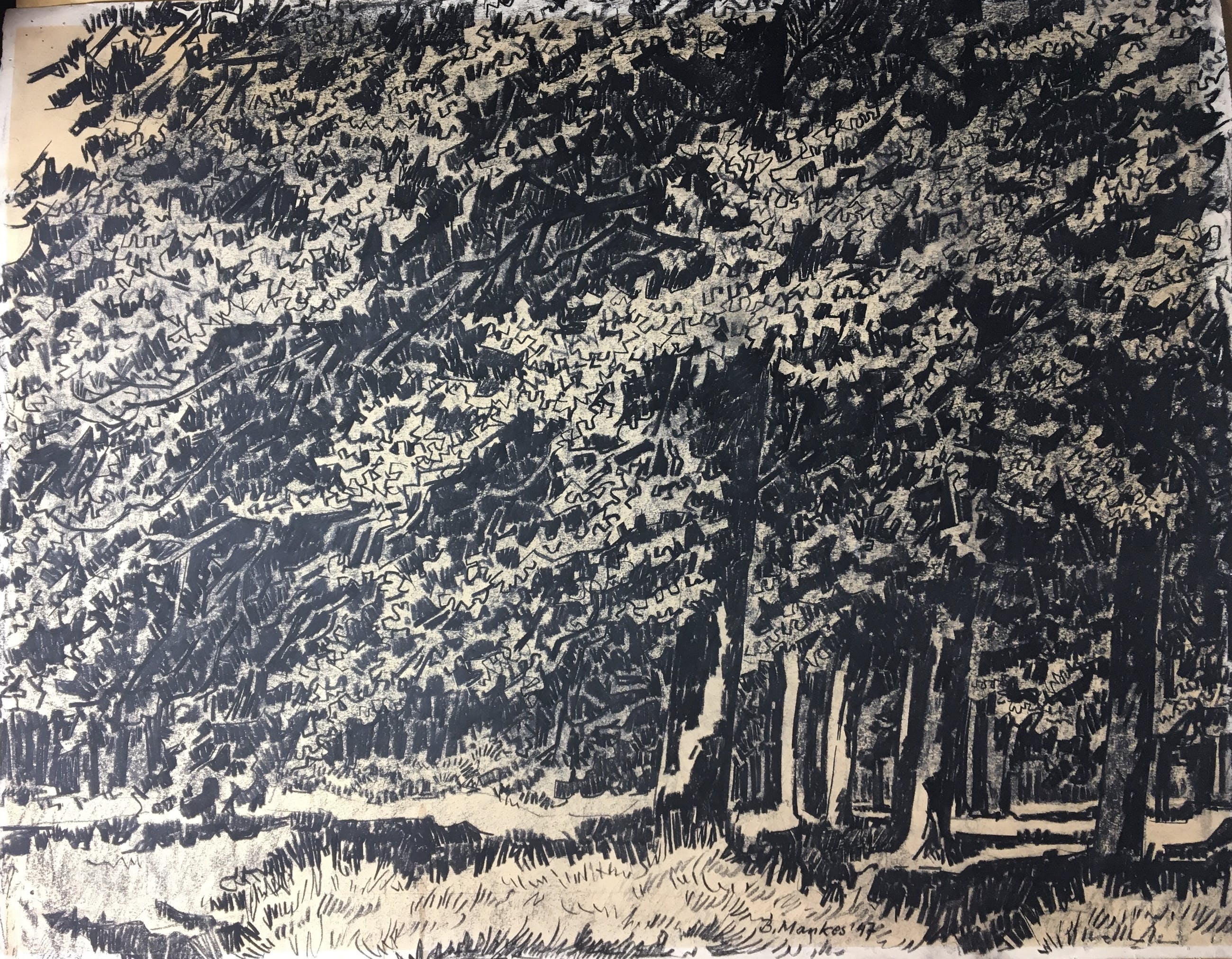 Houtskooltekening door B Mankes op okergele achtergrond. Zoon van Jan Mankes. Werkte veel in Laren en Rotterdam. Er is een boek geschreven over zijn tekeningen.