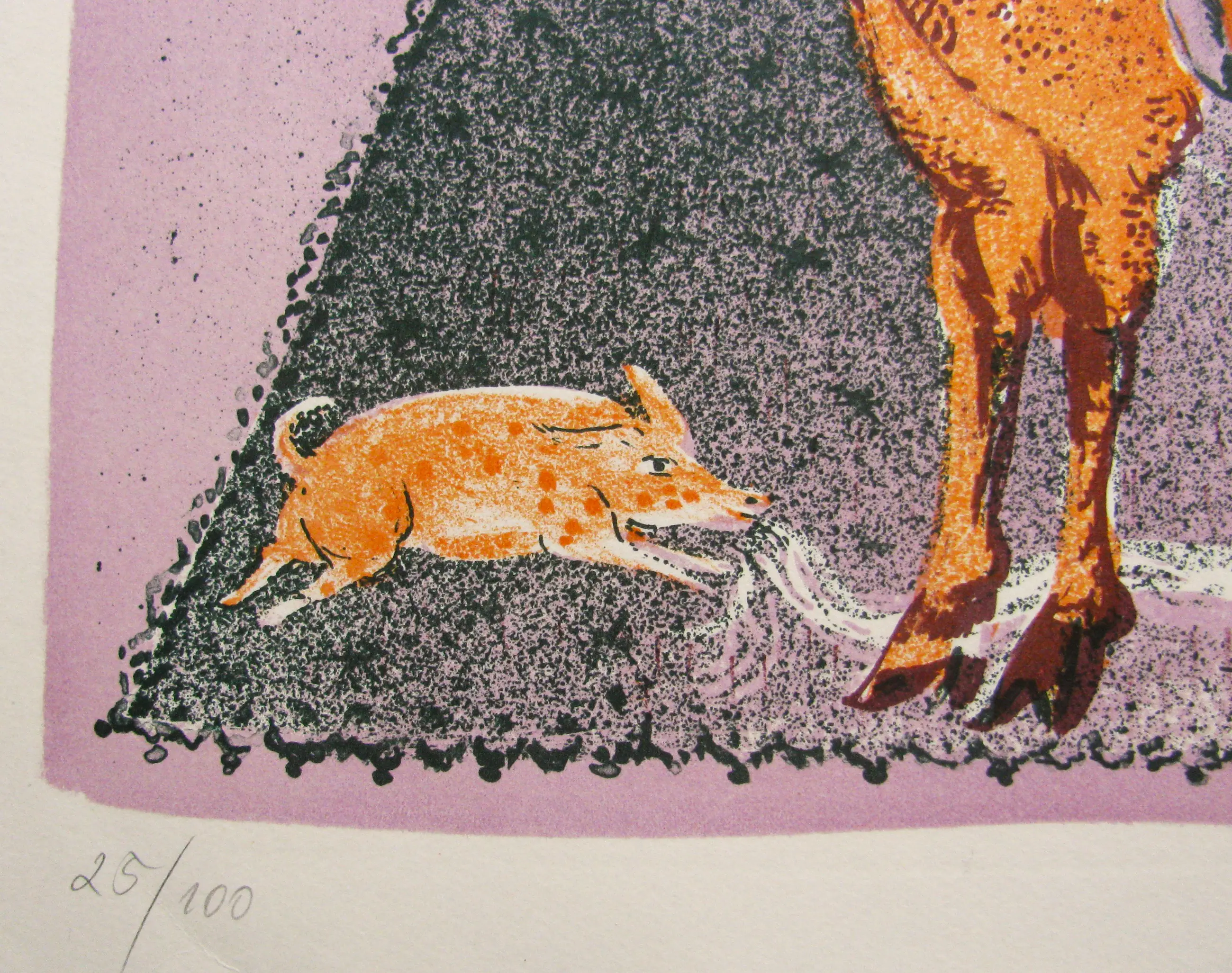 Kleurenlithografie, 50 x 63 cm (58 x 76 cm per vel) op geschept papier. Met potlood gesigneerd. Getiteld en gedateerd op de achterzijde. Kreukels van 2 cm aan de onderkant.