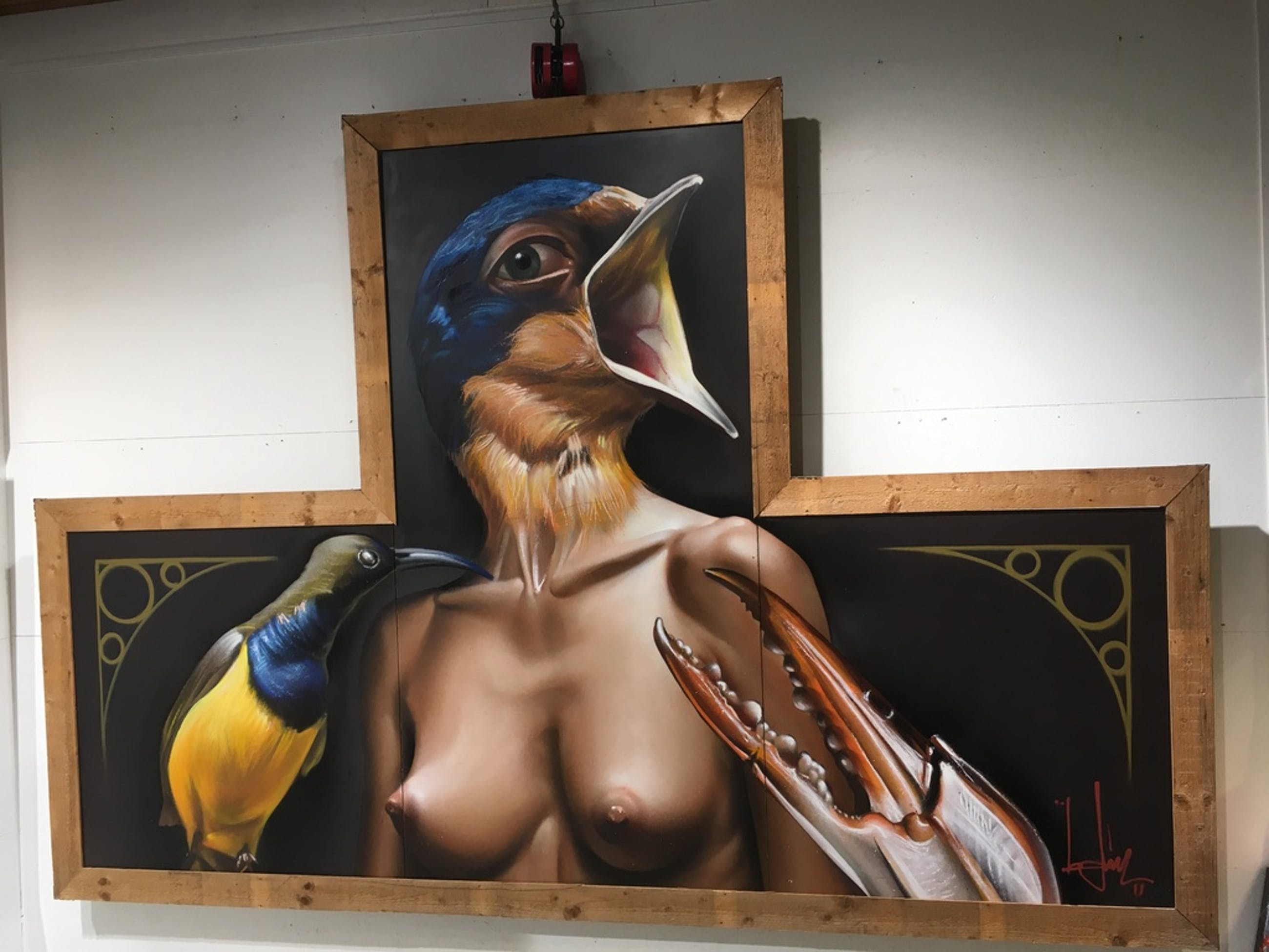 Belin is een van 's werelds beste graffiti kunstenaars en dit werk is dan ook volledig met spuitbussen gemaakt. Het werk is gemaakt op oude schoolborden/krijtborden met een afmeting van maarliefst 300 x 200 cm. Het geheel heeft dan ook een behoorlijk gewicht van waarschijnlijk ruim over de 100 kg. Vandaar dat het momenteel ook met een zware takel/katrol aan het plafond bevestigd is. Het geheel bestaat uit 3 delen die bij elkaar gehouden worden door een handgemaakt houten frame. Door de loop der jaren heeft het werk enkele lichte vervoersschade opgelopen, waaronder een lichte kras in de nek van de vrouw/vogel (zie foto's)