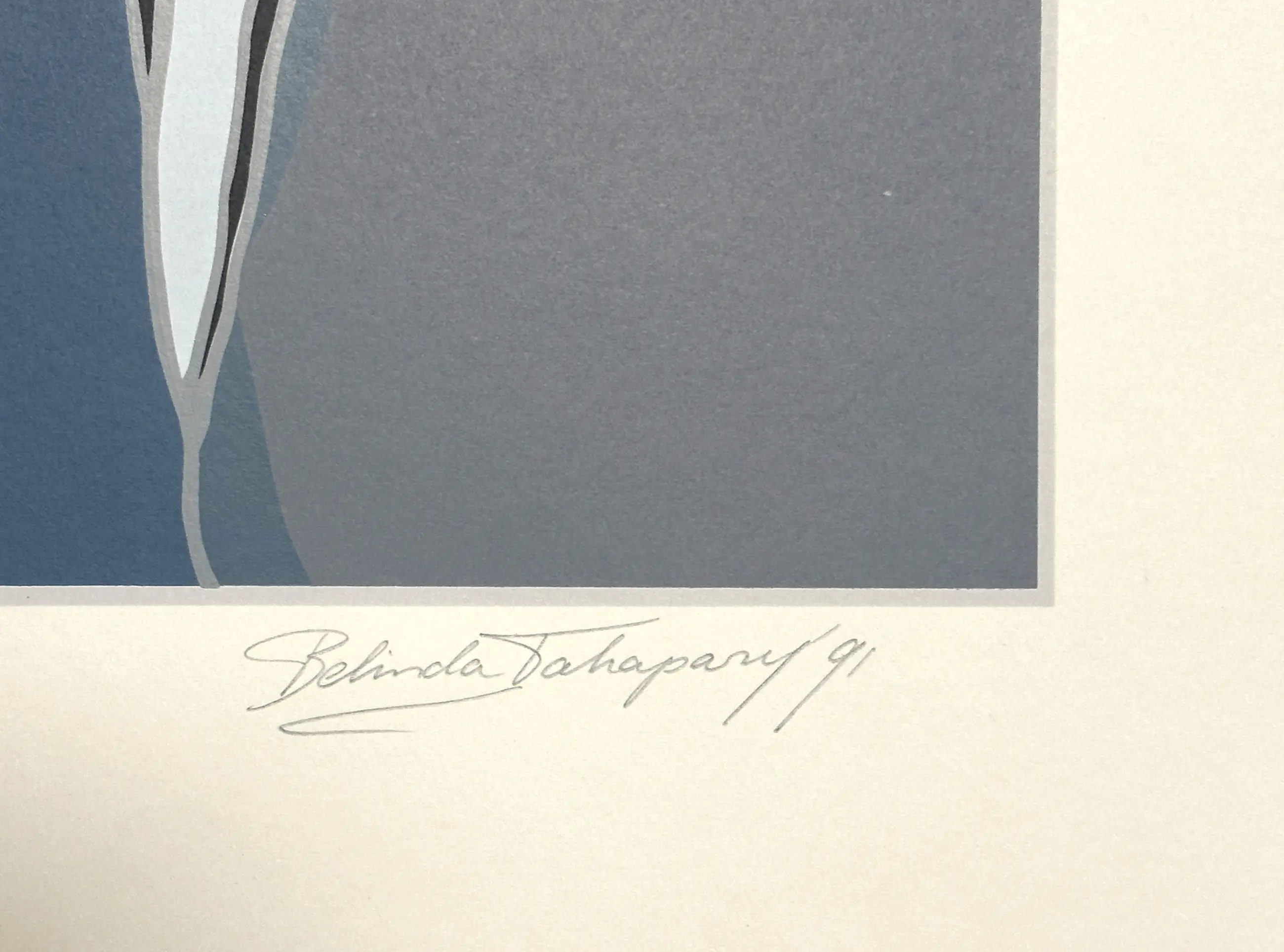Fraaie zeefdruk van Belinda Tahapary gemaakt in 1991, gemaakt in een oplage van 75. Dit betreft afdruk 58/75. Gedrukt op zuurvrij papier, papierformaat 81 x 69 cm, beeldformaat 46 x 70 cm. Handgesigneerd en genummerd door de kunstenaar. De zeefdruk is in uitstekende staat.