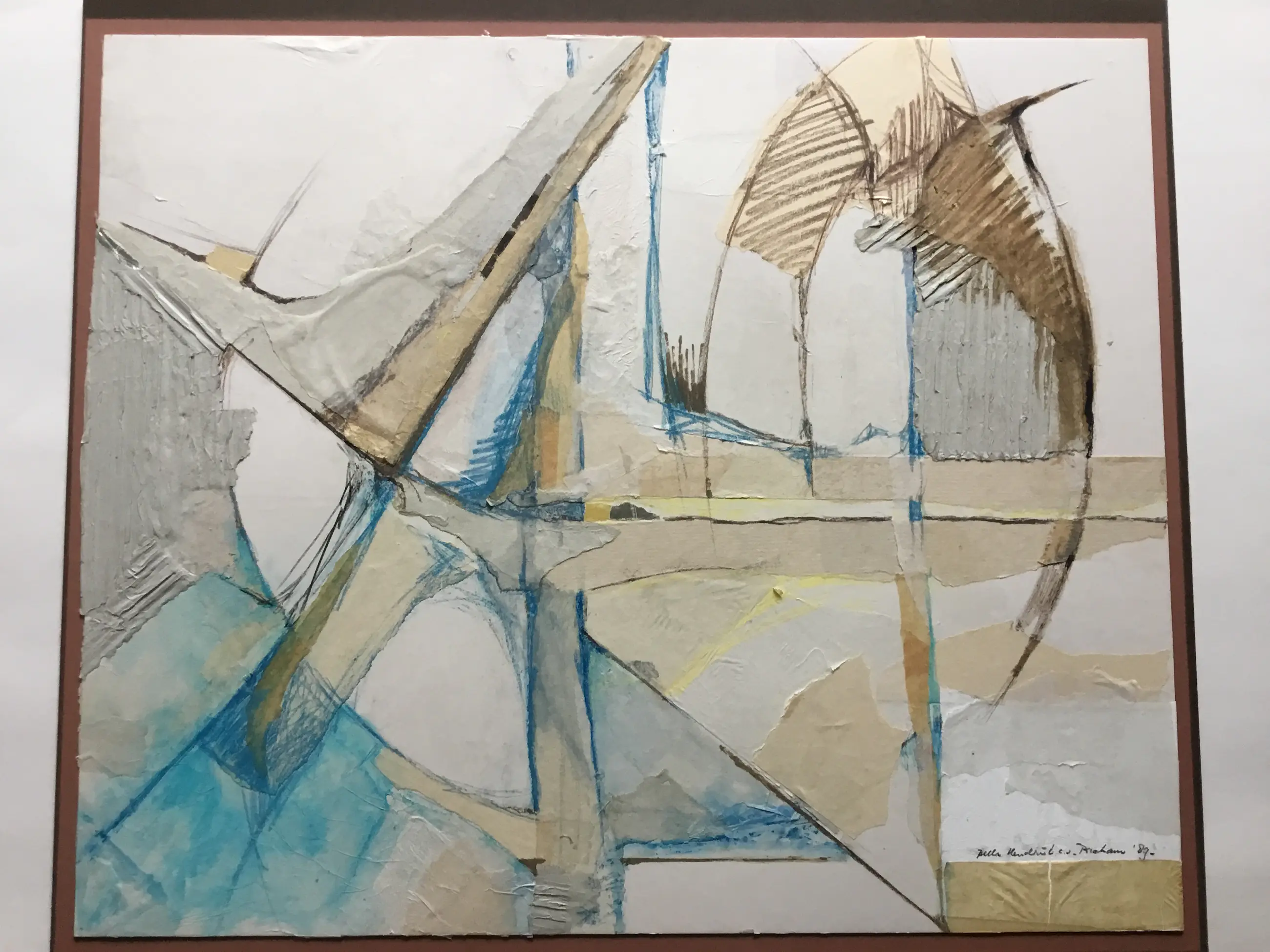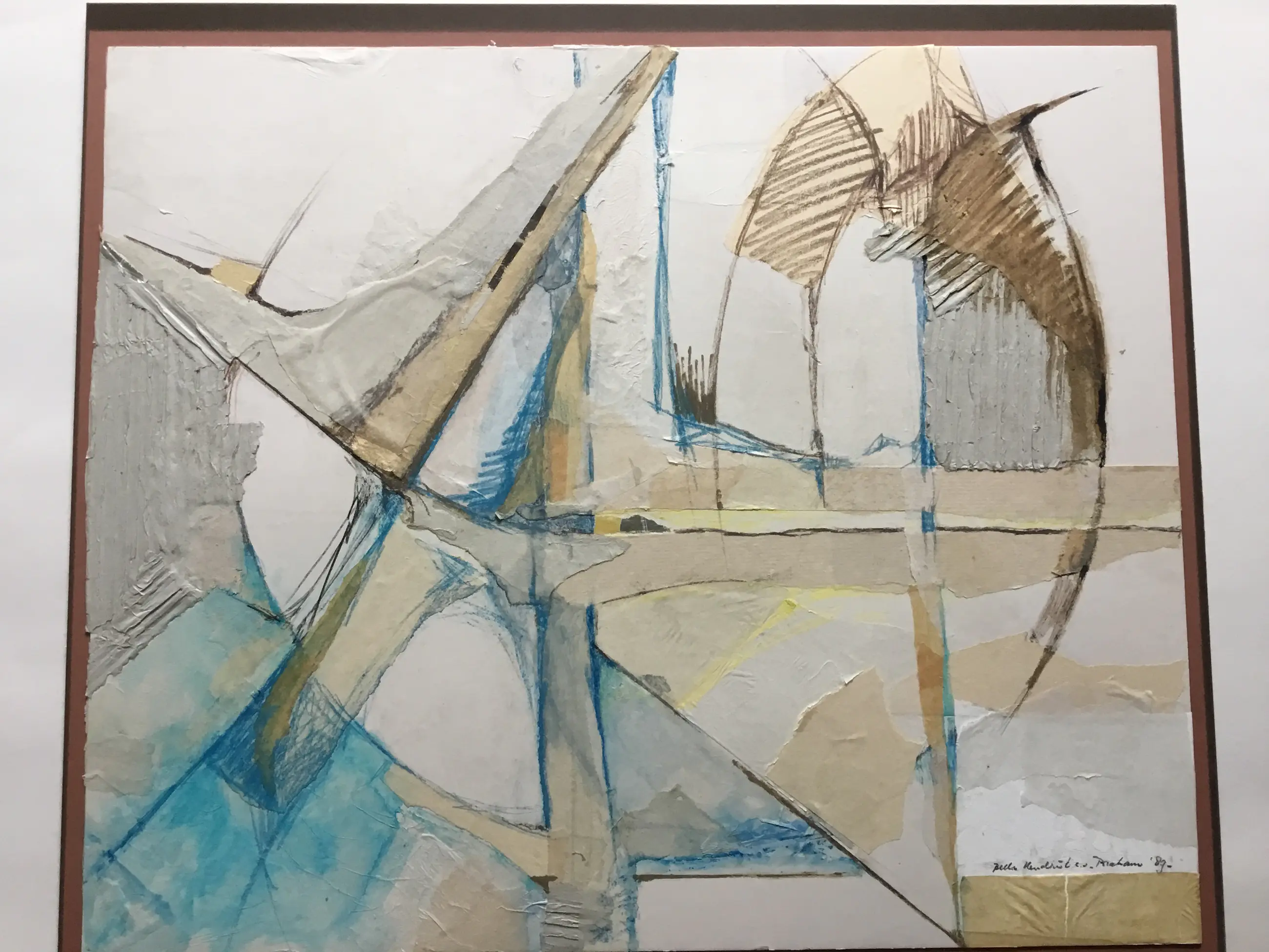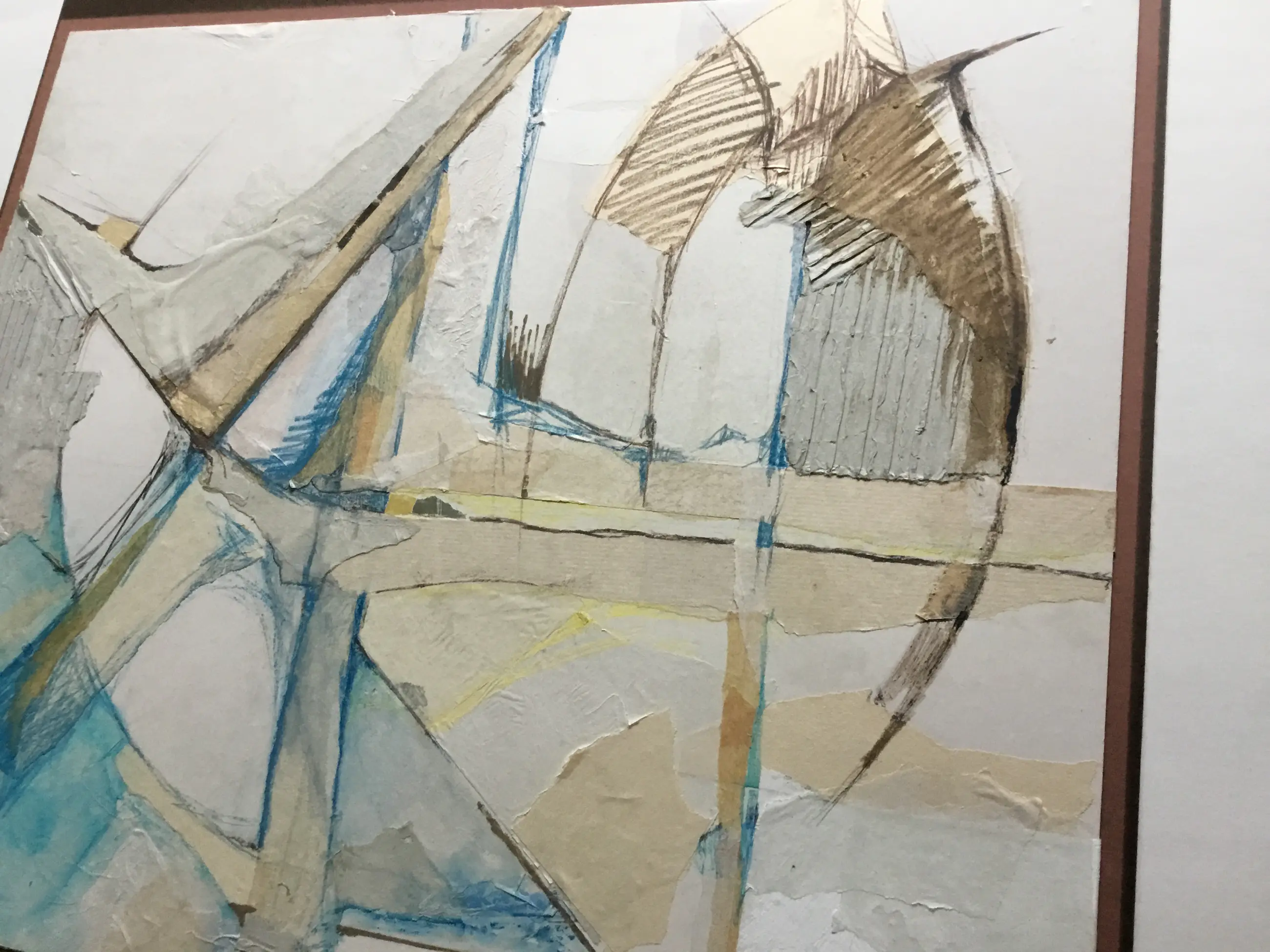 Mooie abstracte collage van diverse soorten papier en Gouache. Het werk is geplakt op bruin karton (55x63cm)
