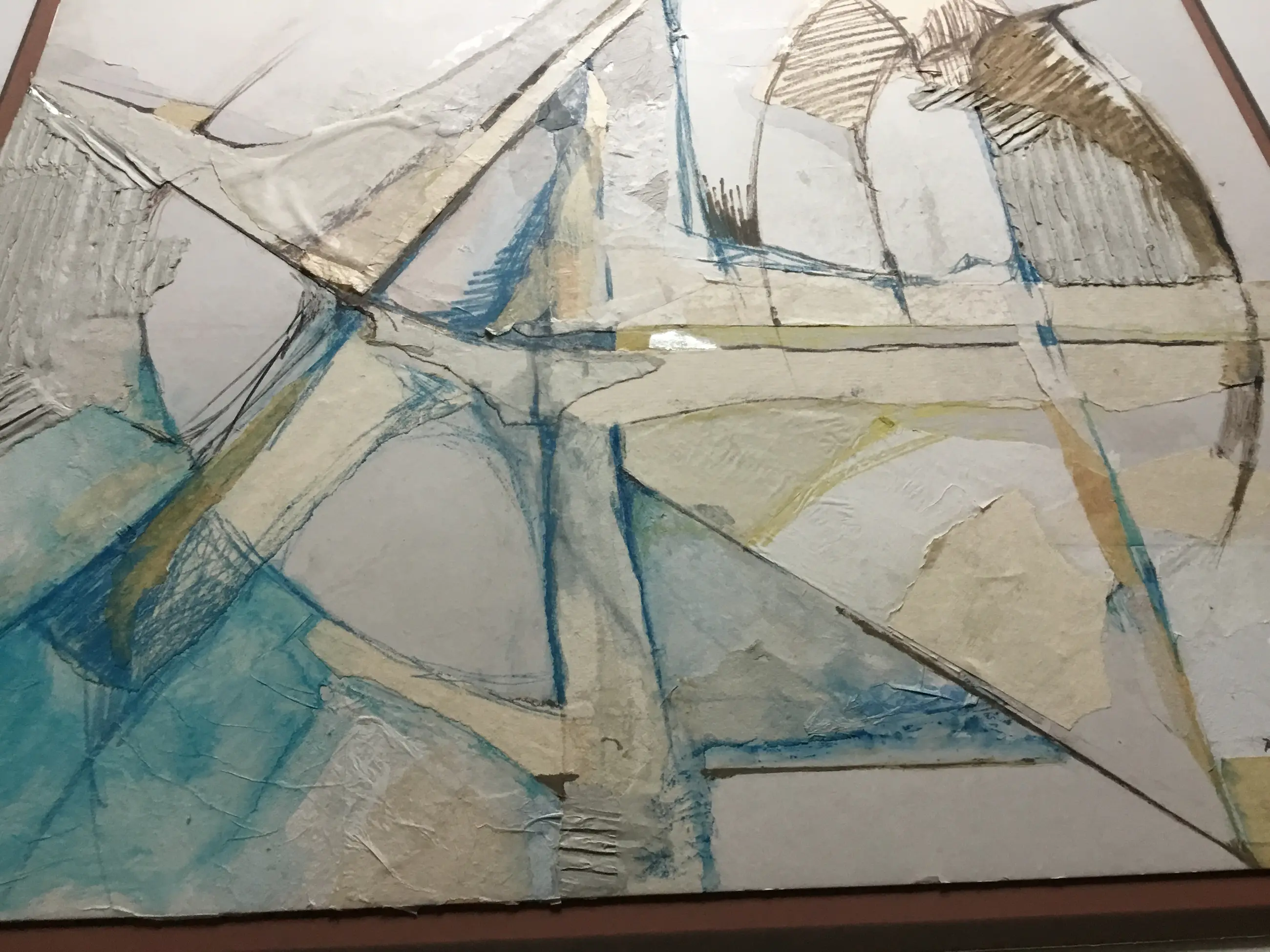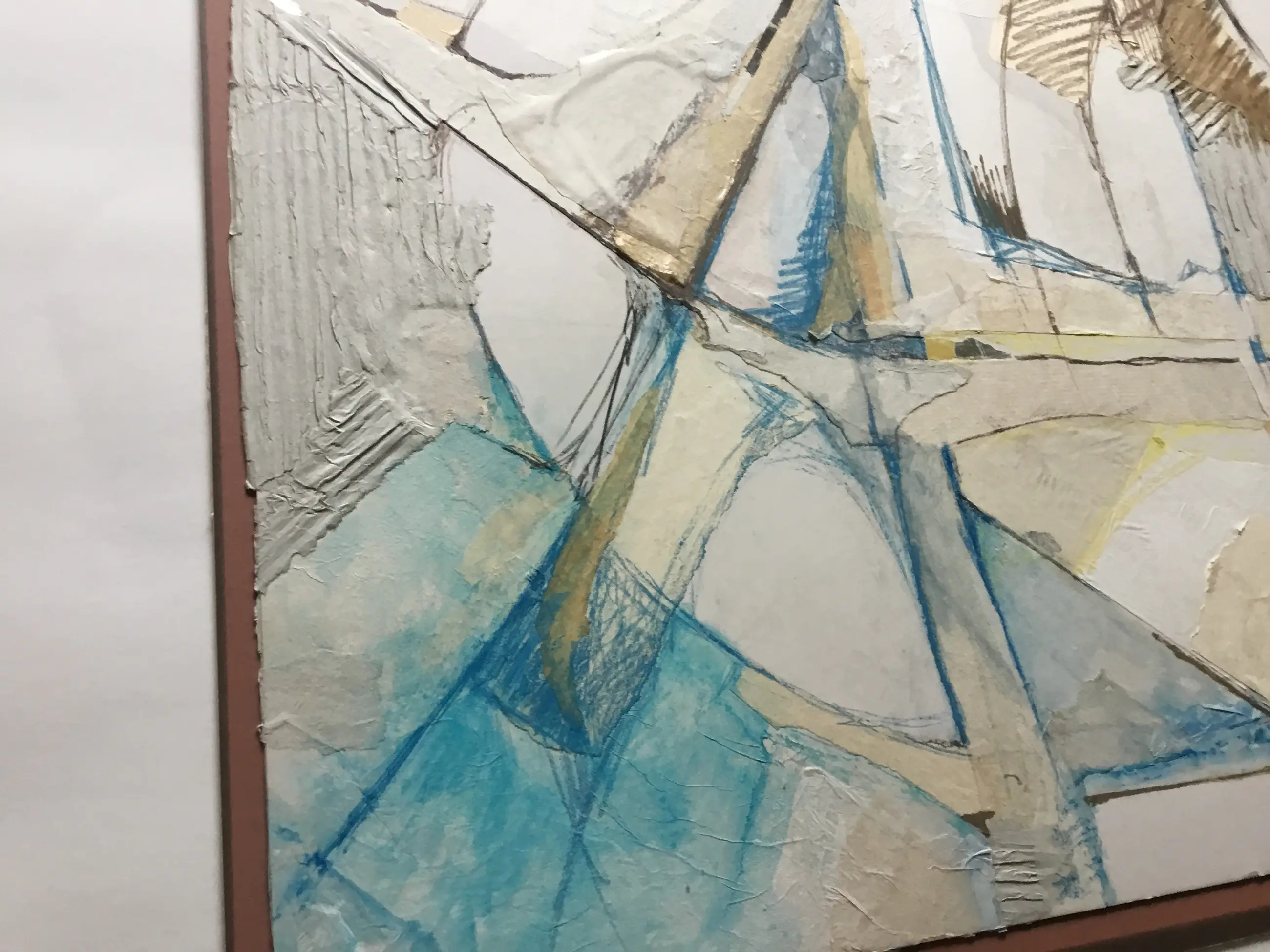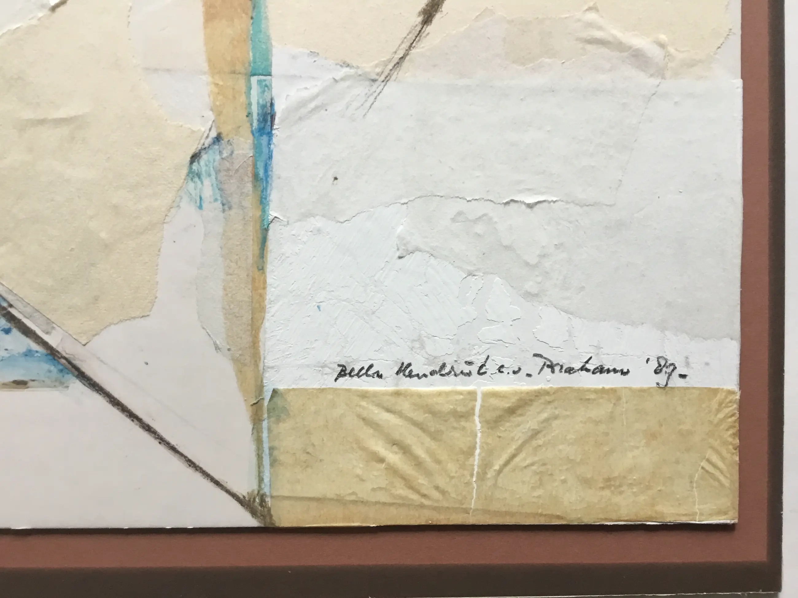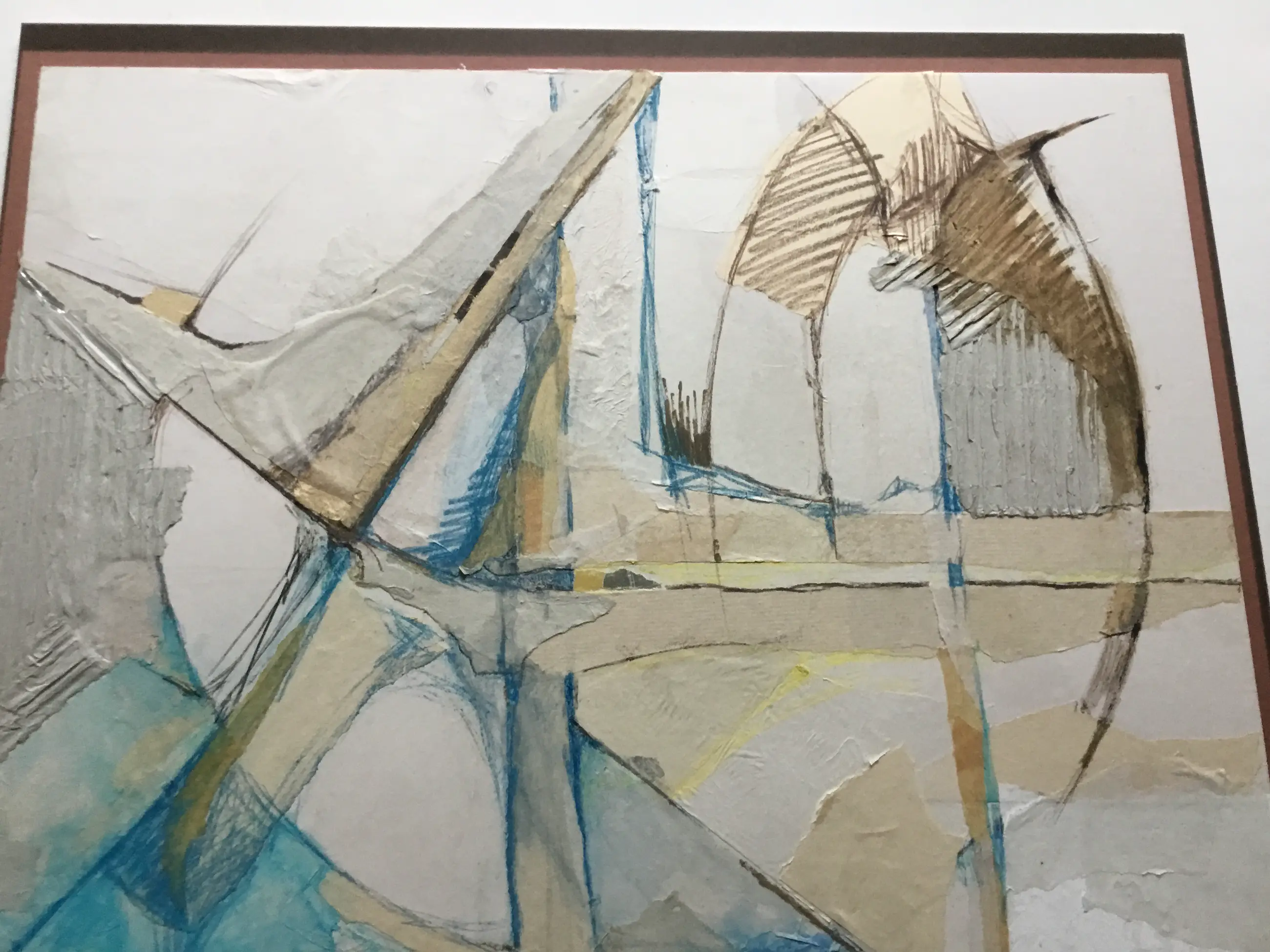 Mooie abstracte collage van diverse soorten papier en Gouache. Het werk is geplakt op bruin karton (55x63cm)