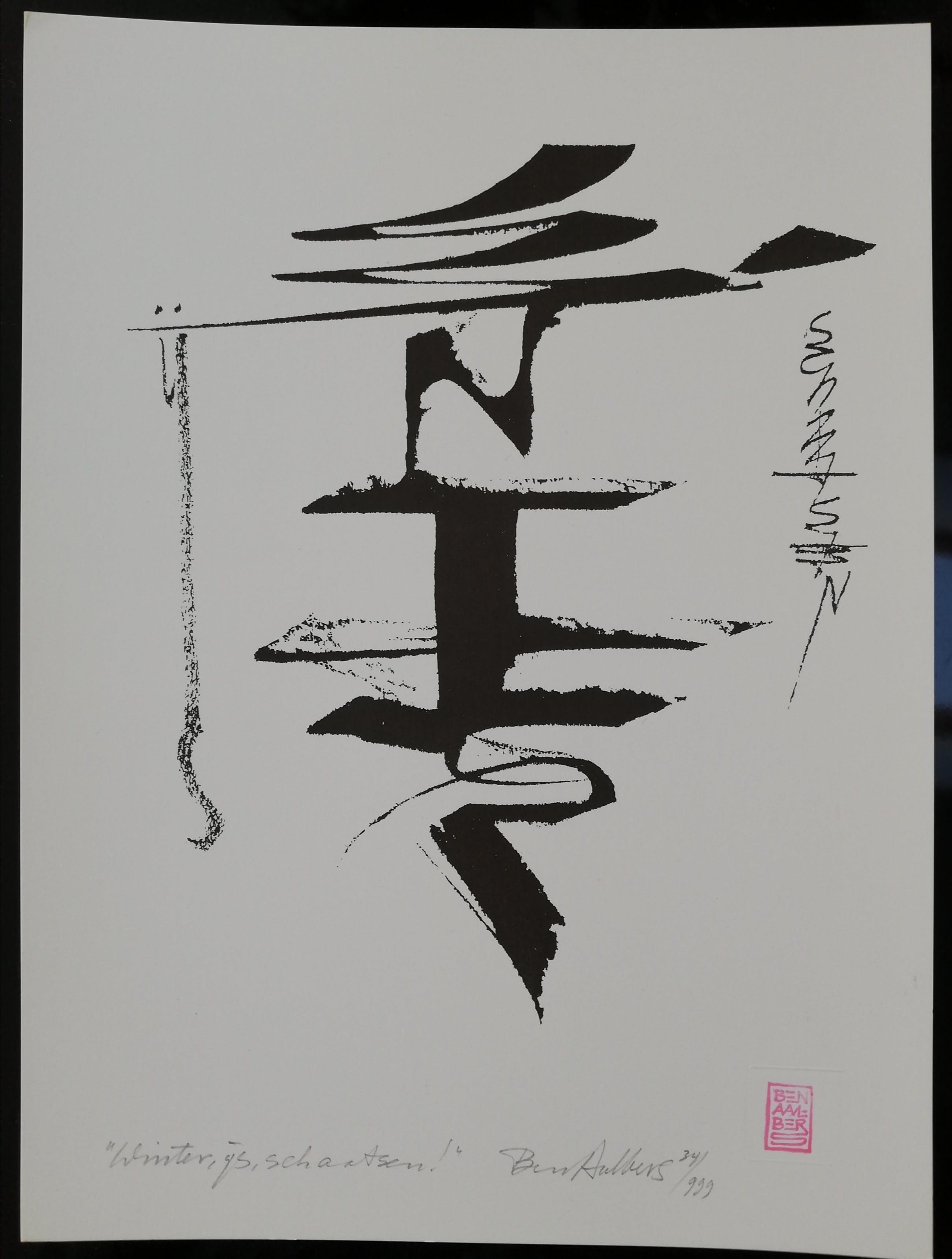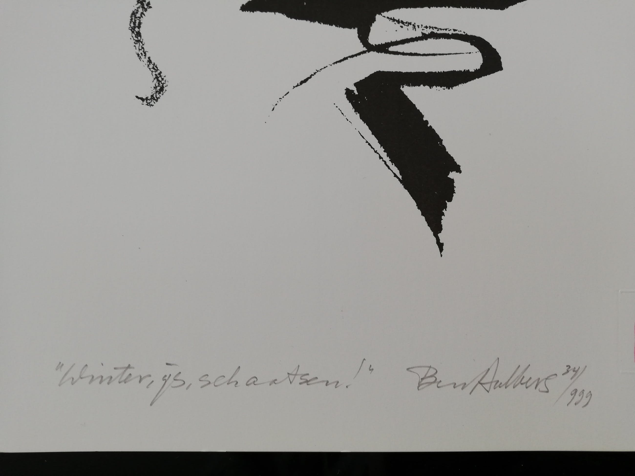 Typografisch abstracte zeefdruk van kunstenaar Ben Aalbers, handgesigneerd, genummerd no. 34 en voorzien atelierstempel.