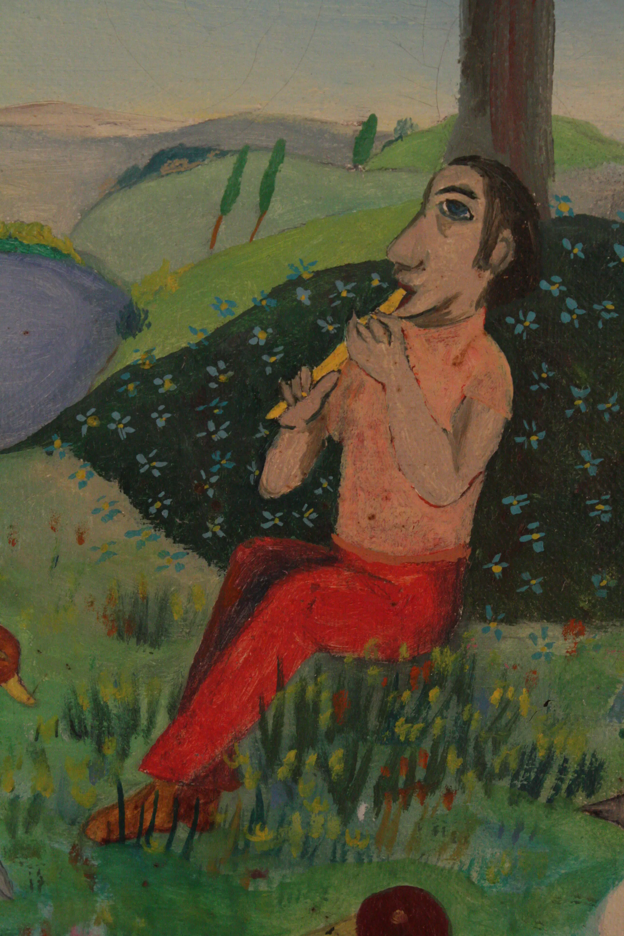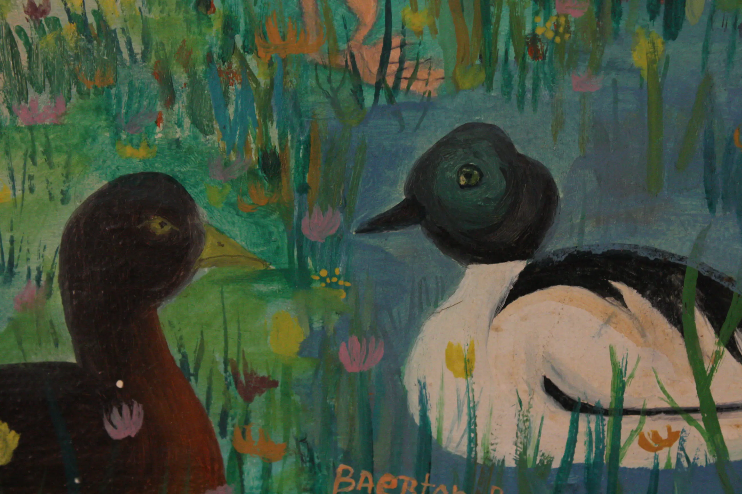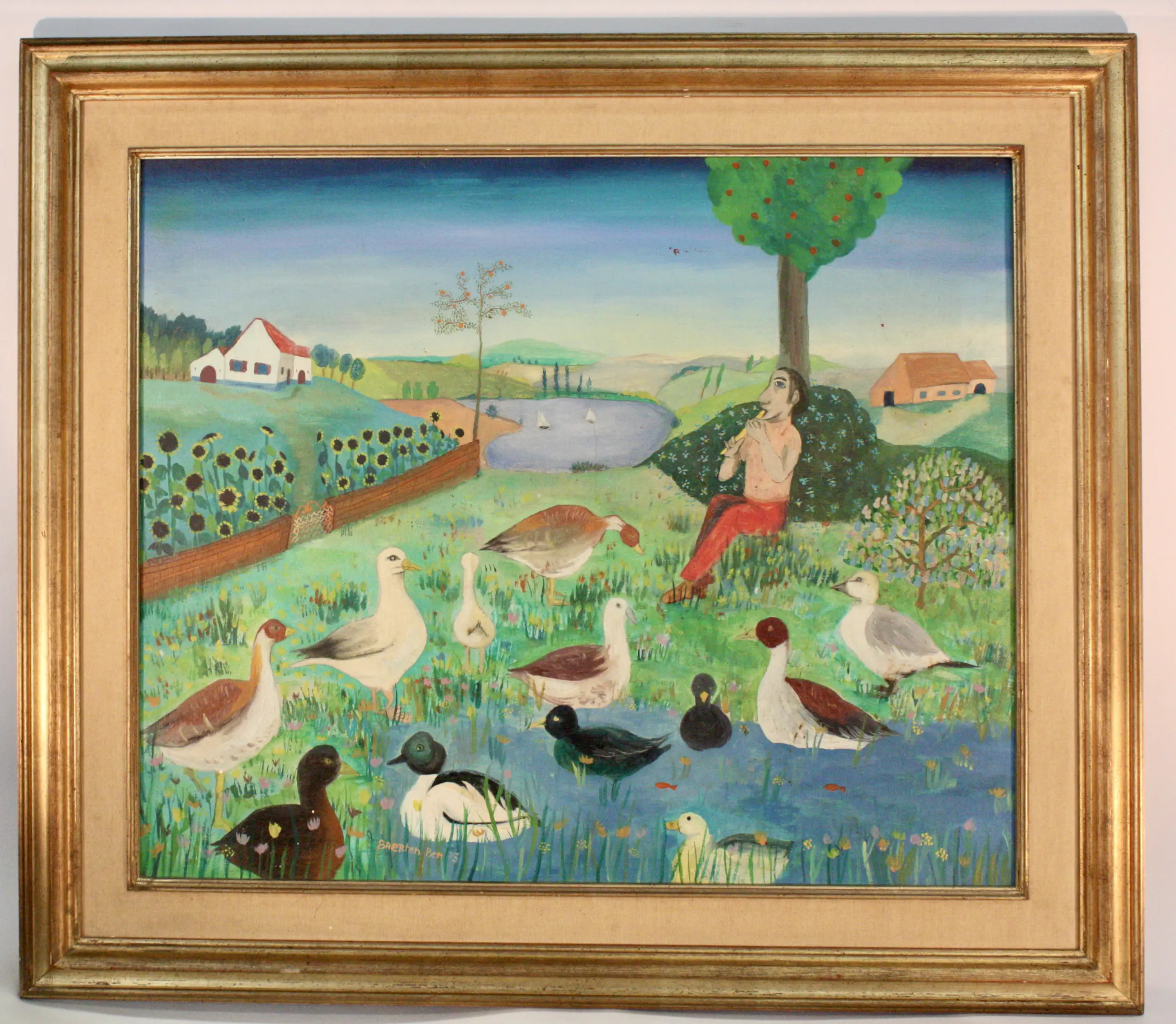 Ben Baerten is gespecialiseerd in naïeve schilderkunst op canvas en zijde. De Fluiter speelt in een bucolisch landschap en verzamelt allerlei vogels een ode waterkant.