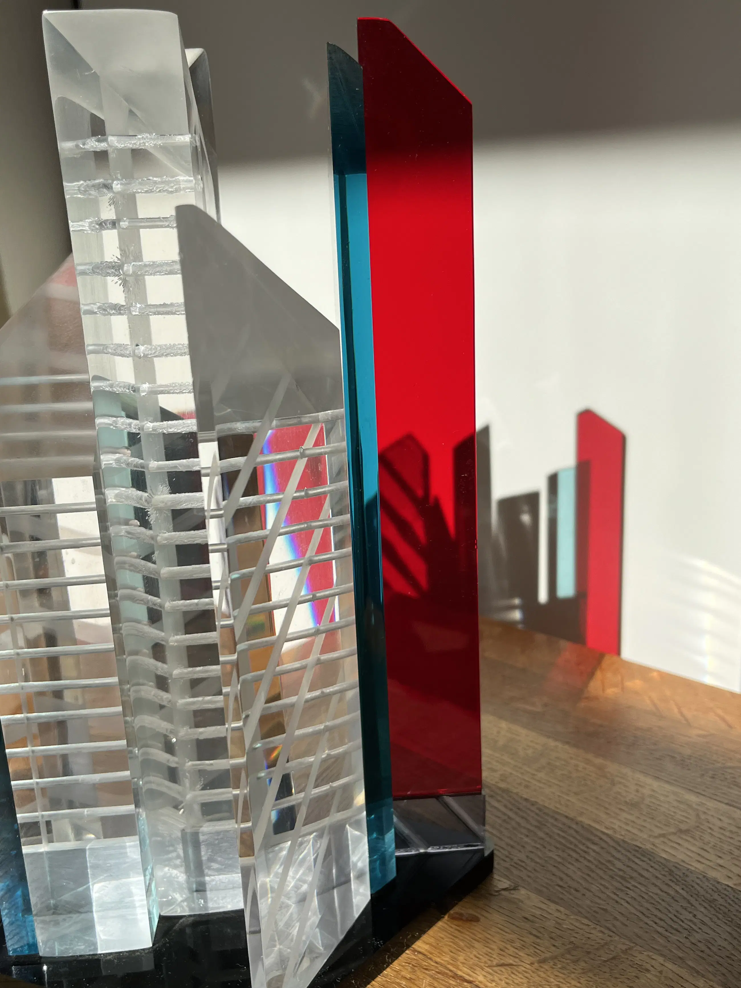 Fraai perspex sculptuur waarvan de kleuren en het lijnenspel vooral in de volle zon prachtig uitkomen. Het beeld is op de eveneens kunststoffen voet gesigneerd en gedateerd. Volgens de inscriptie zou ik uitgaan van 1993, maar de bijbehorende aankoopnota noemt 1994. Afmeting 29 x 20 x 13 cm.