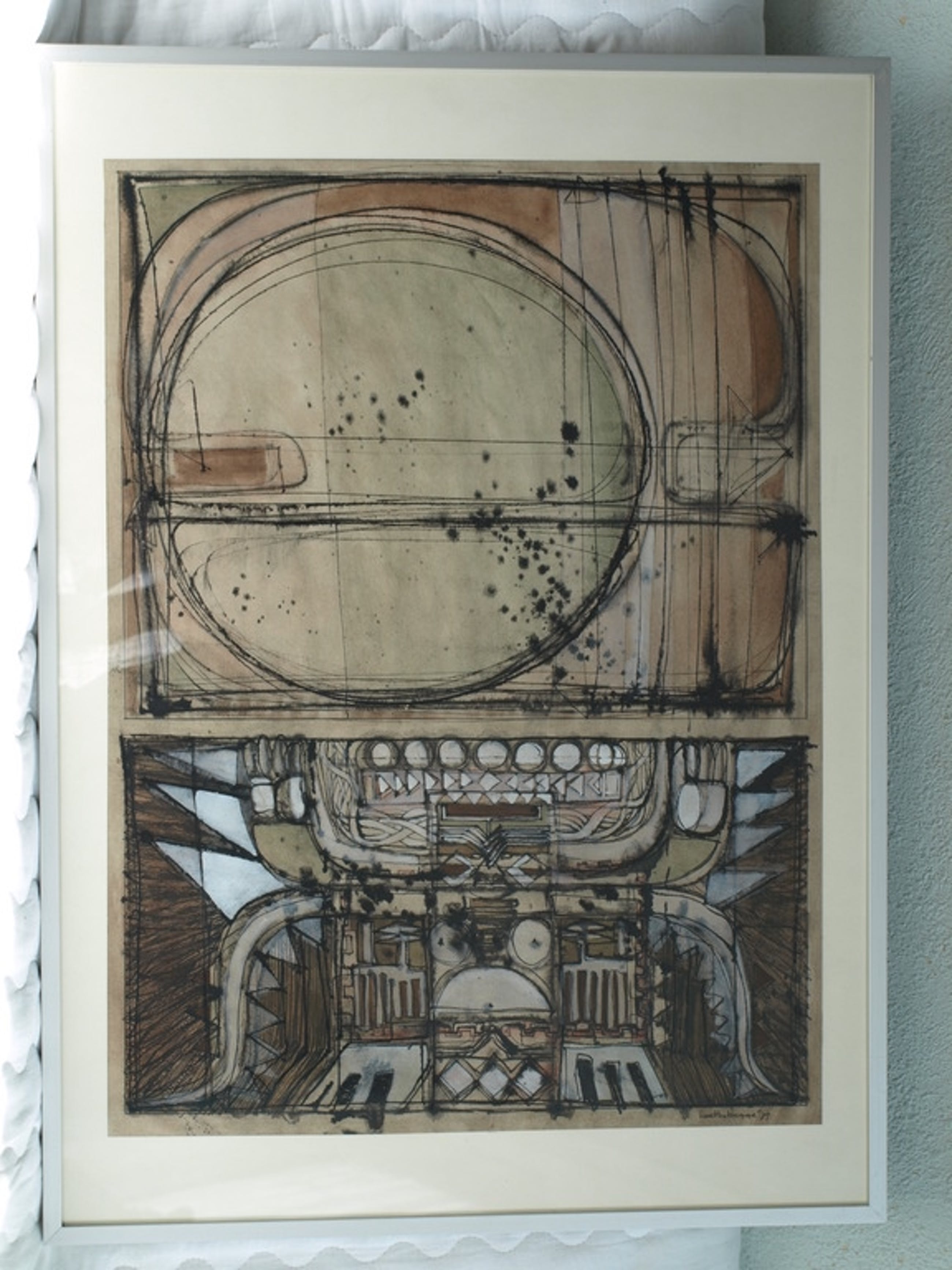 Een werk van Ben Hulsegge met de voor hem kenmerkende mysterieuze tekens en symbolen.