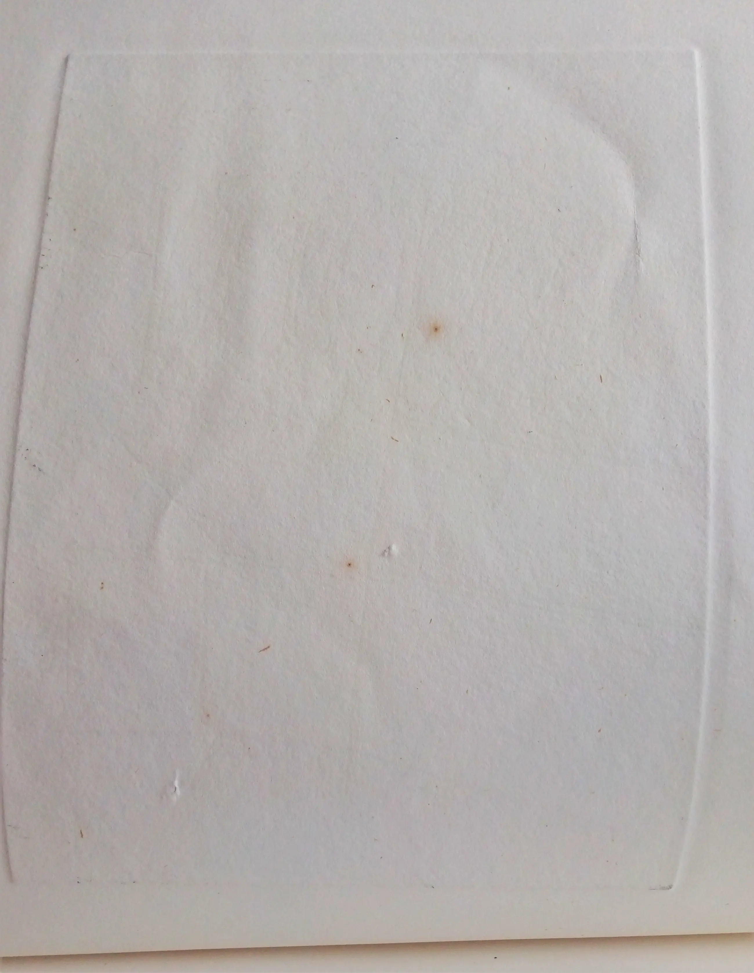 Twee kleine inkepingen in beeld, 3 foxing merken, alleen 1 zichtbaar in beeld, wat licht gekreukt