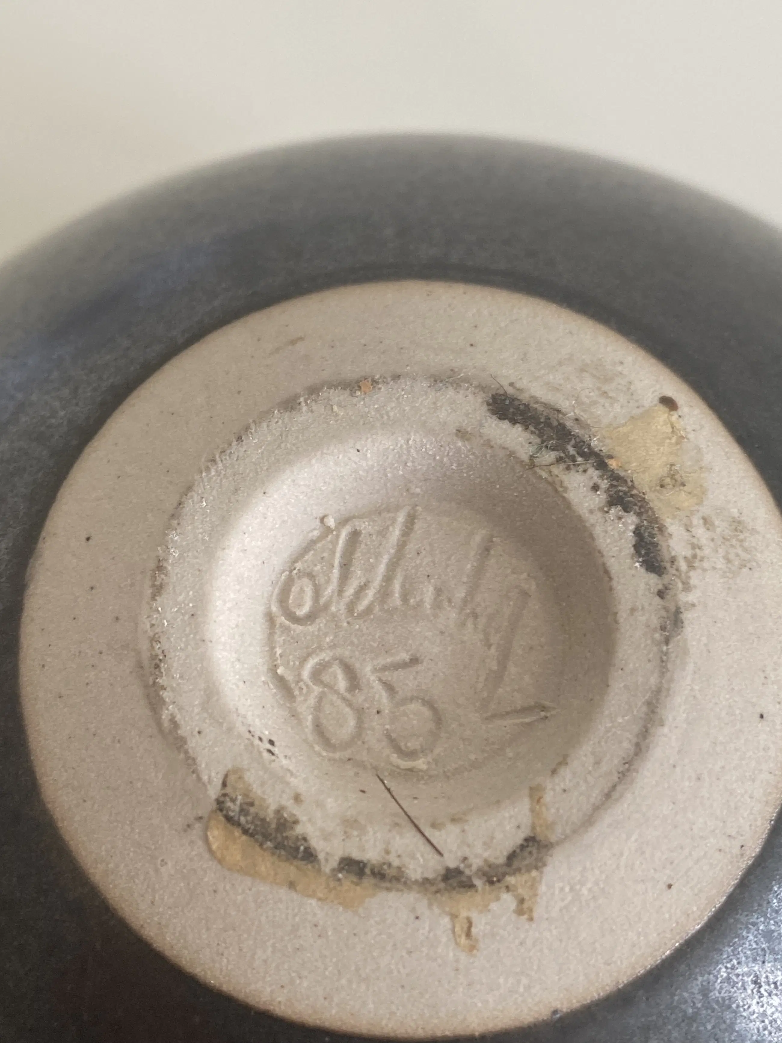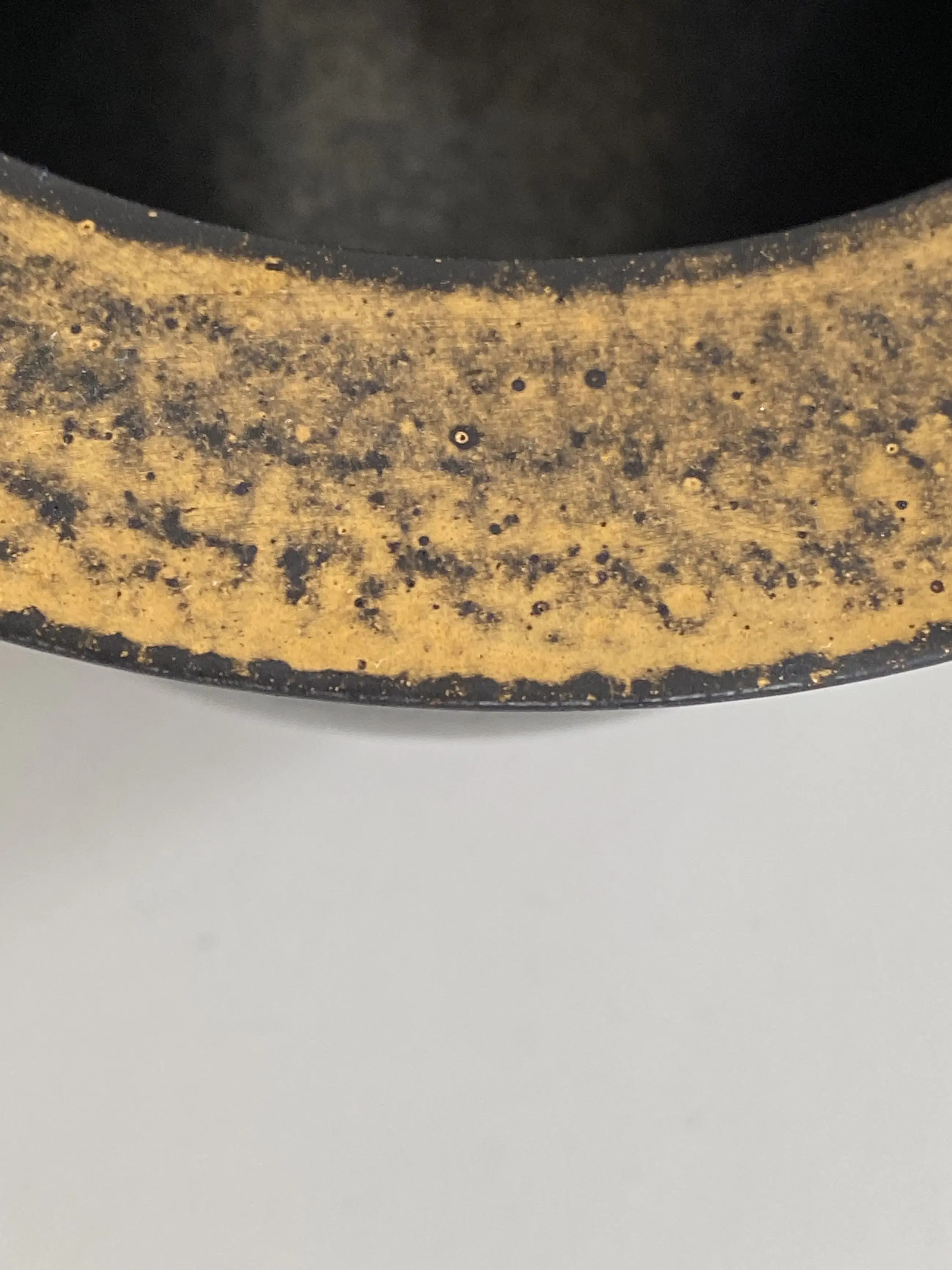 Mooie hand gedraaide kom. Vervaardigd door Ben Oldenhof. gesigneerd en gedateerd 1985. uitgevoerd in steengoed. Mooie zwarte glazuur. Rand met goud gedecoreerd. een splinter aan de onderzijde van de rand en een fritting. Eenvoudig te restaureren. Mooie object voor liefhebbers van studio keramiek.