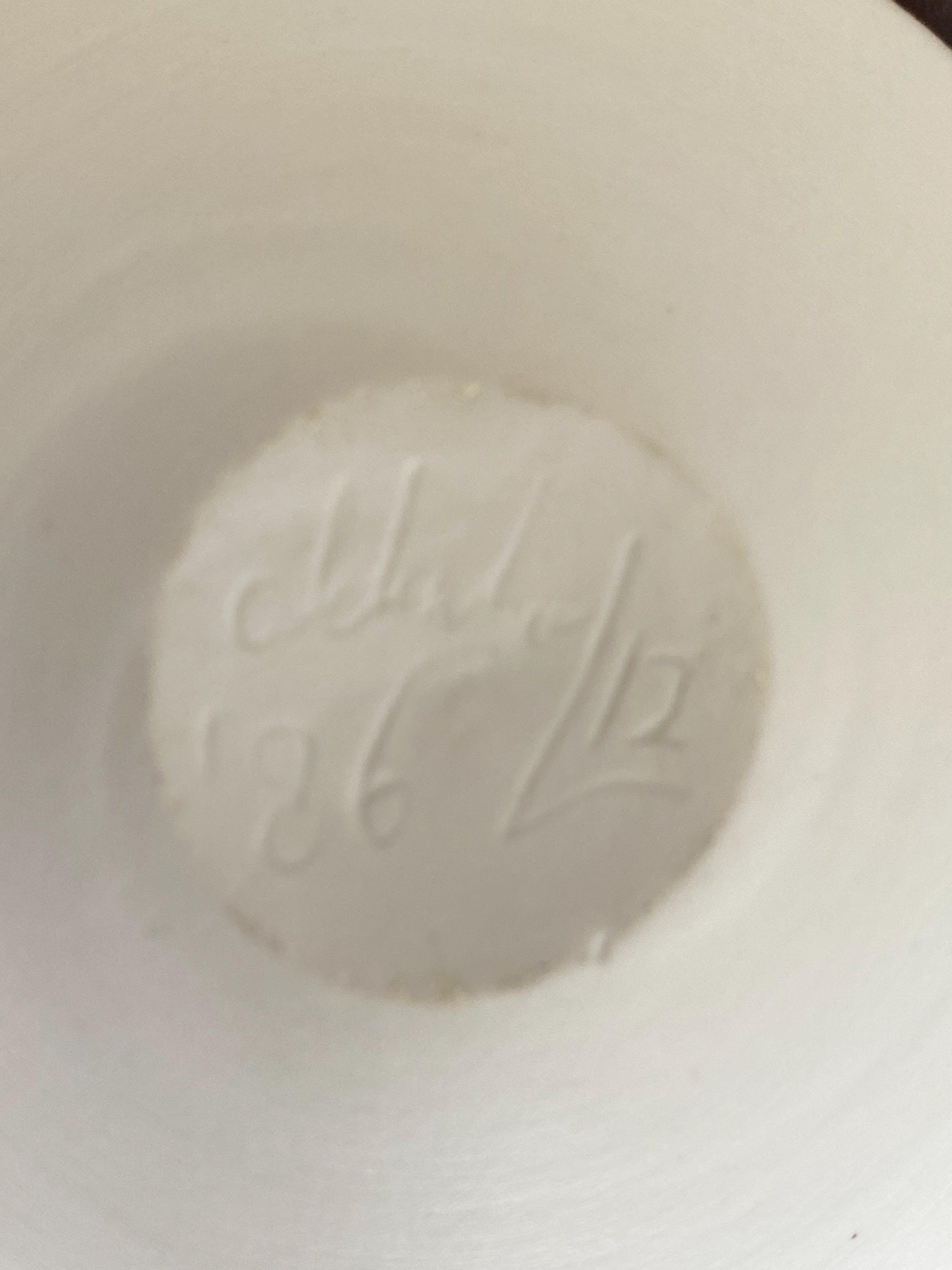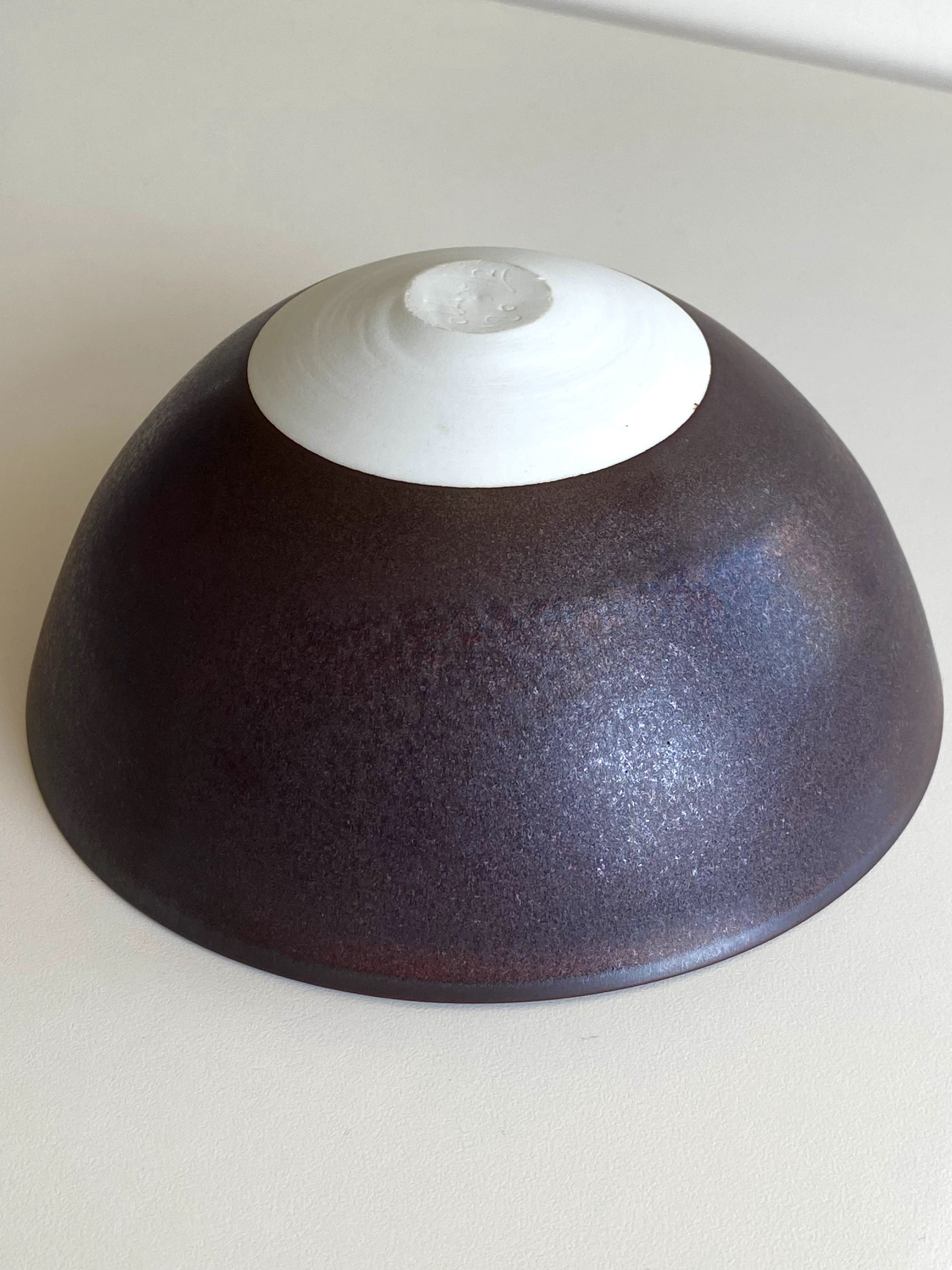 Mooi schaaltje in perfecte staat vervaardigd door Ben Oldenhof. Lijkt te zweven op klein voetje. Het voetje en een gedeelte van de onderzijde zijn ongeglazuurd gebleven. Zeer dun porselein.De rest is bedekt met een bruin paarsachtig matte glazuur. Afkomstig uit de collectie Achterbergh. Qua stijl is een grote verwantschap met het werk van Geert Lap. Gesigneerd en gedateerd,