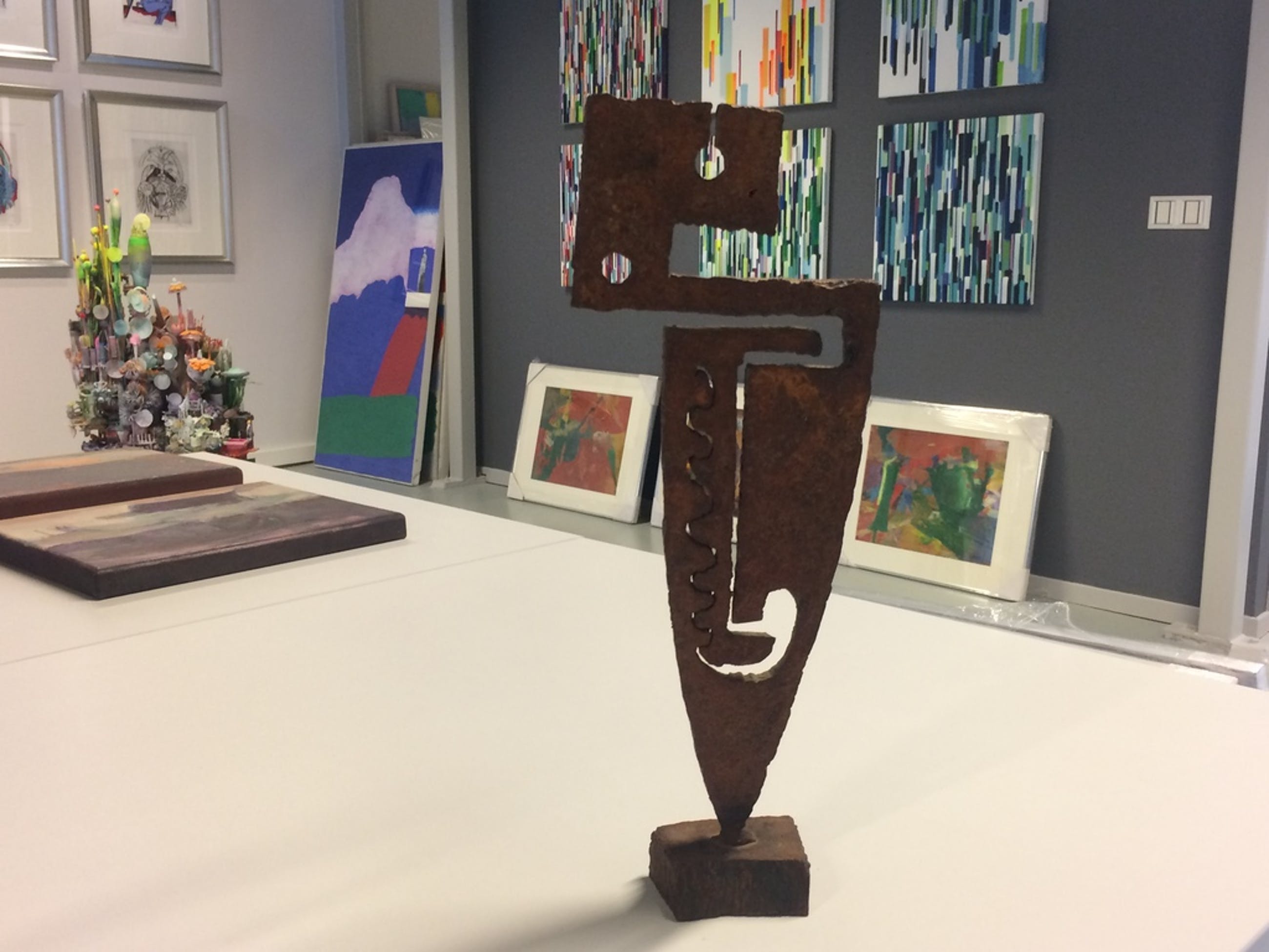 Stalenobject van de beeldhouwer Ben Oldenhof. H. 44 x B. 16,5 x D.1.5/6 cm. Binnen of buiten object.