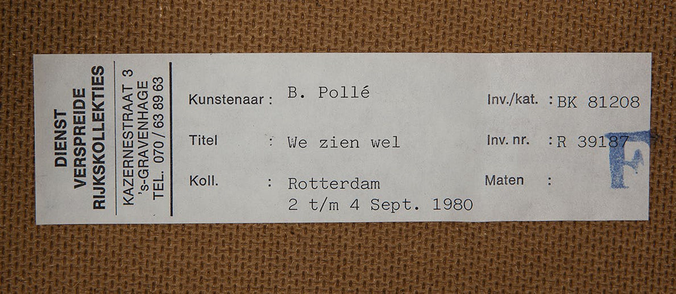 Herkomst: BKR Rotterdam (Het kunstwerk is afgevoerd uit de rijkscollectie in 2018)