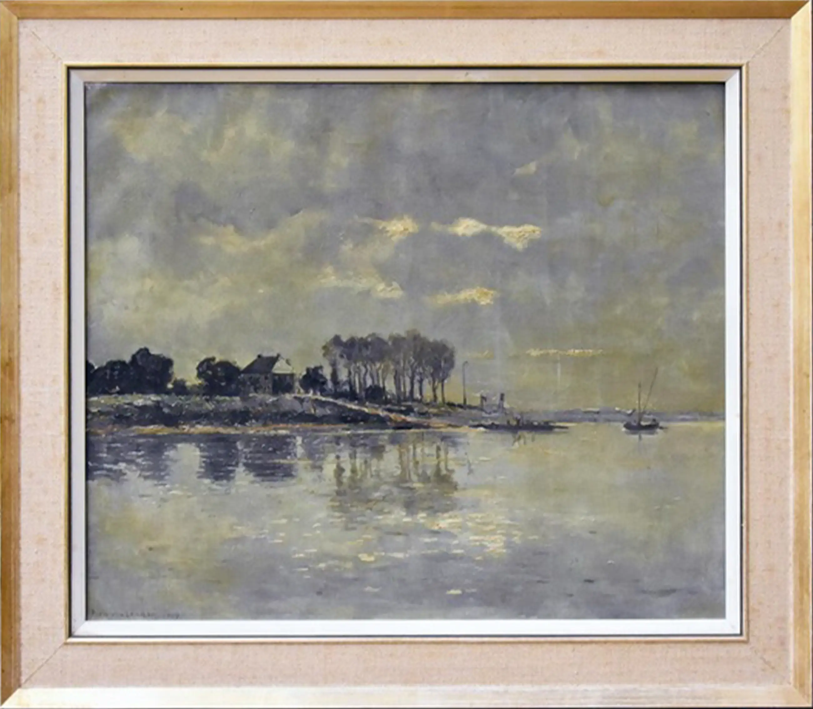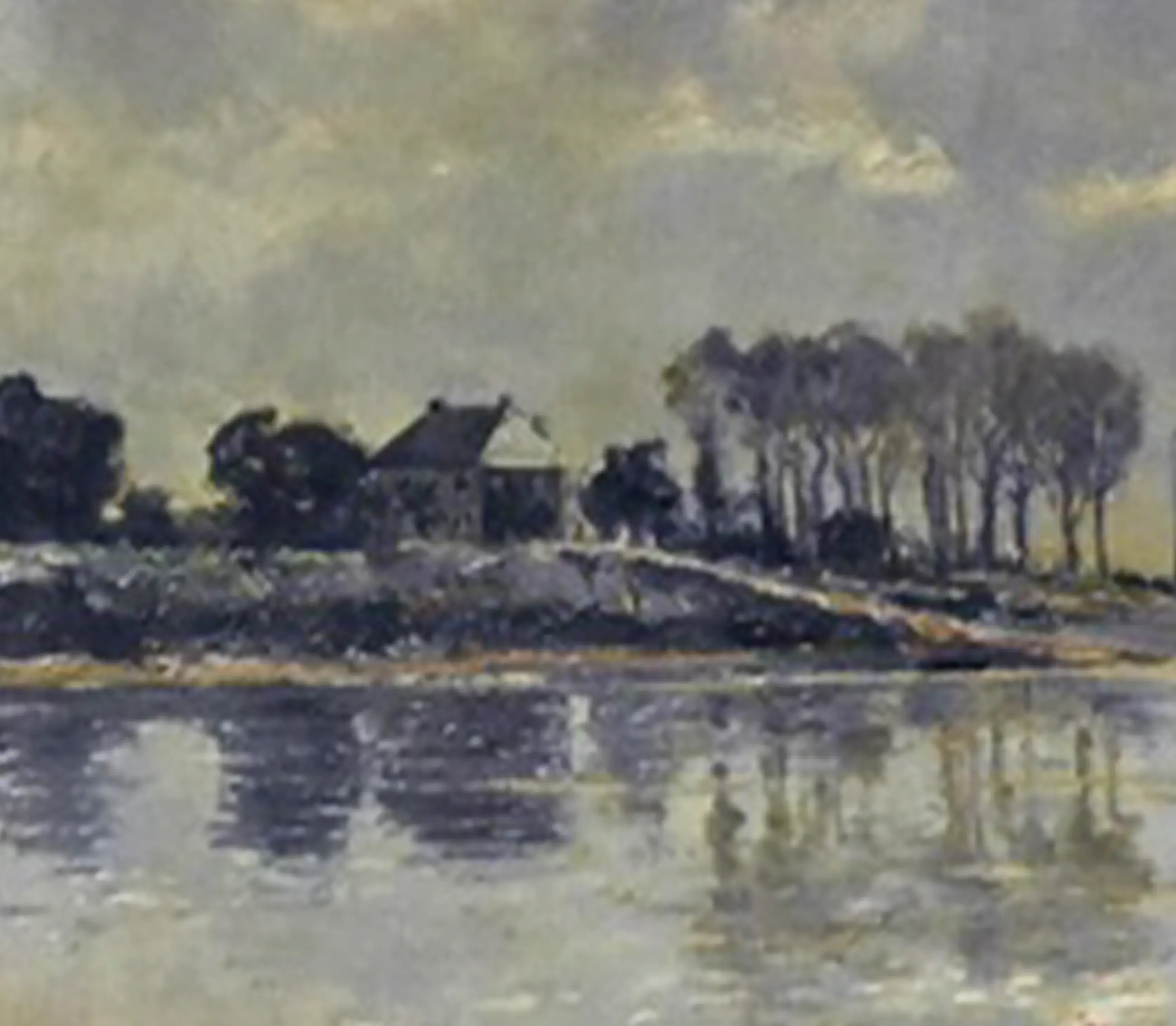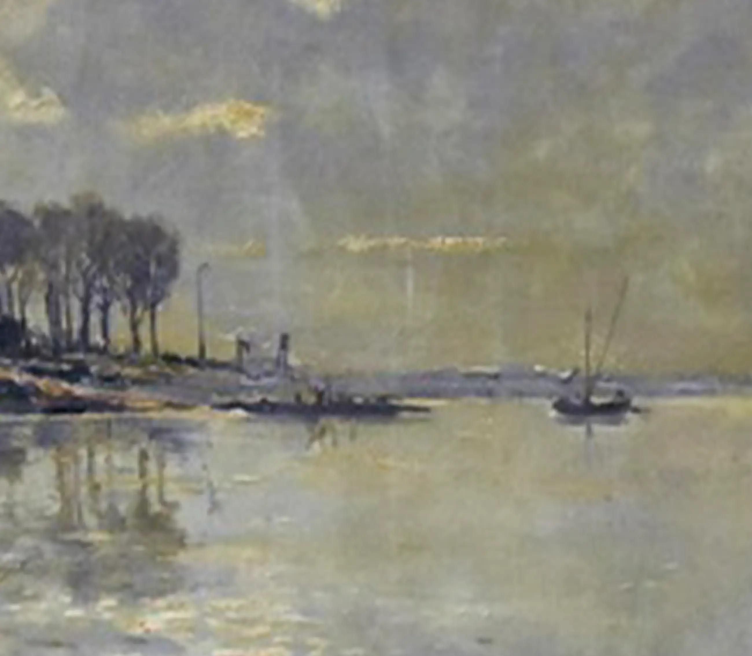 • Licht en Atmosfeer: Het schilderij kenmerkt zich door een typisch Nederlands "grijs licht". De lucht is bewolkt, maar de zon breekt op subtiele wijze door de wolken heen, wat zorgt voor gouden en zilveren reflecties op het wateroppervlak. Dit geeft het werk een kalme, bijna melancholische uitstraling.