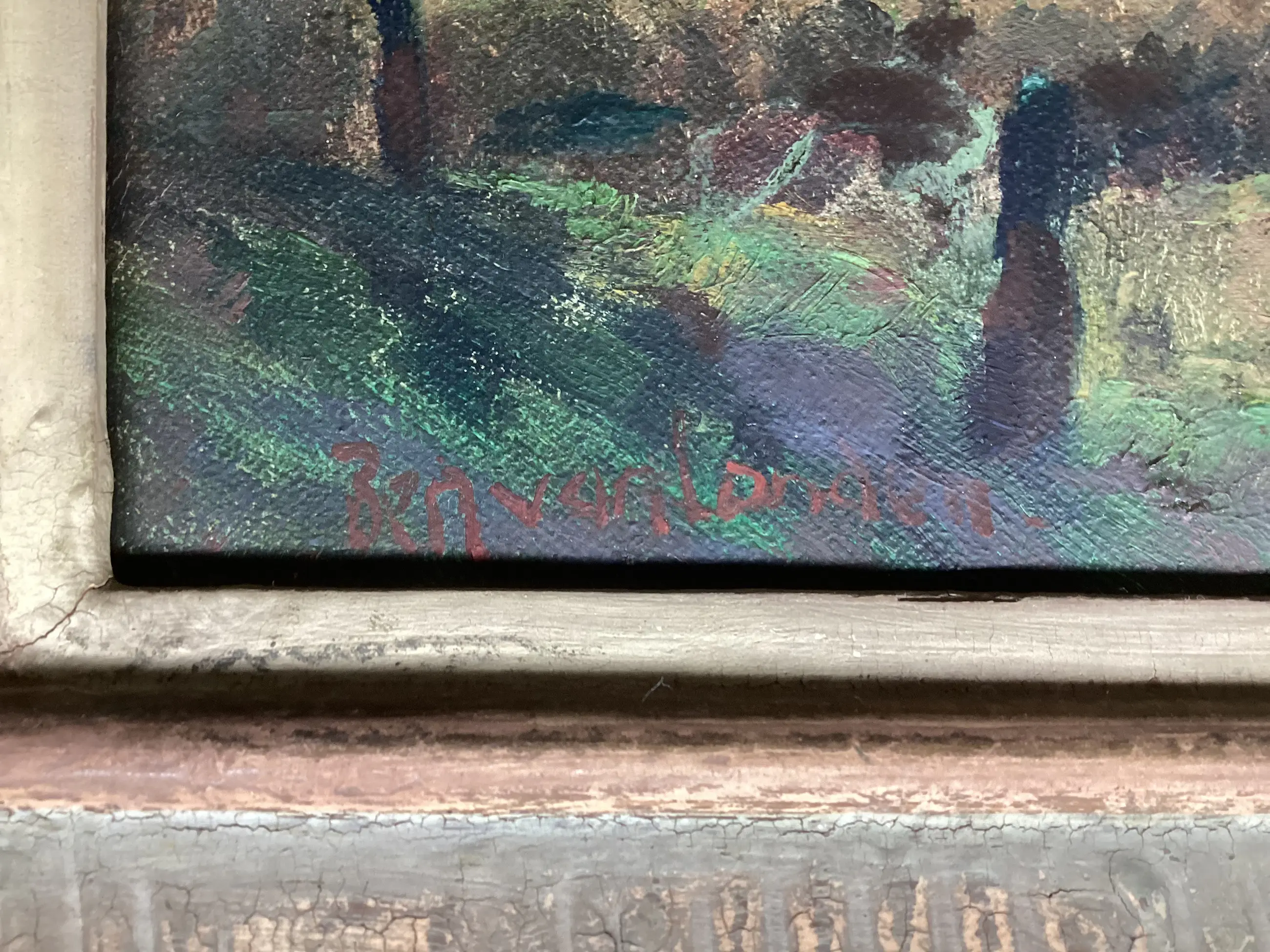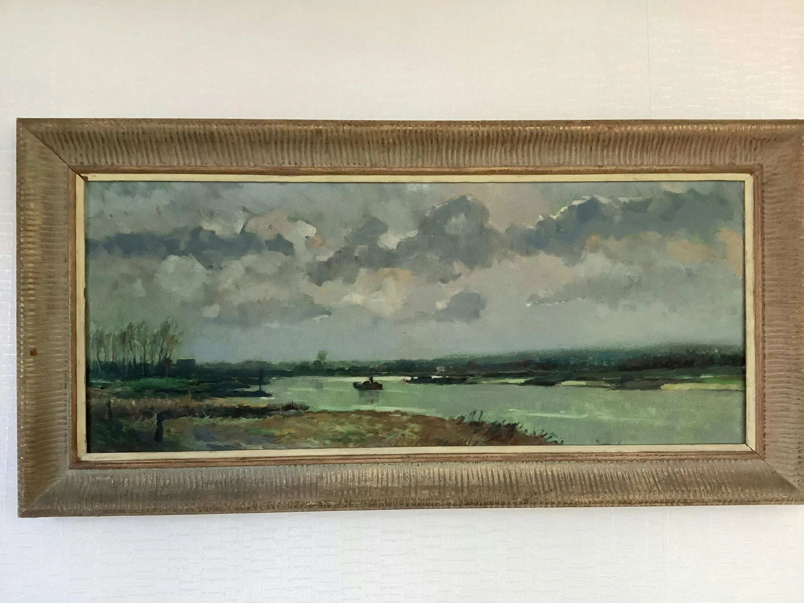 Olieverf op doek. “Rivier de Nederrijn”. Linksonder gesigneerd in rood.