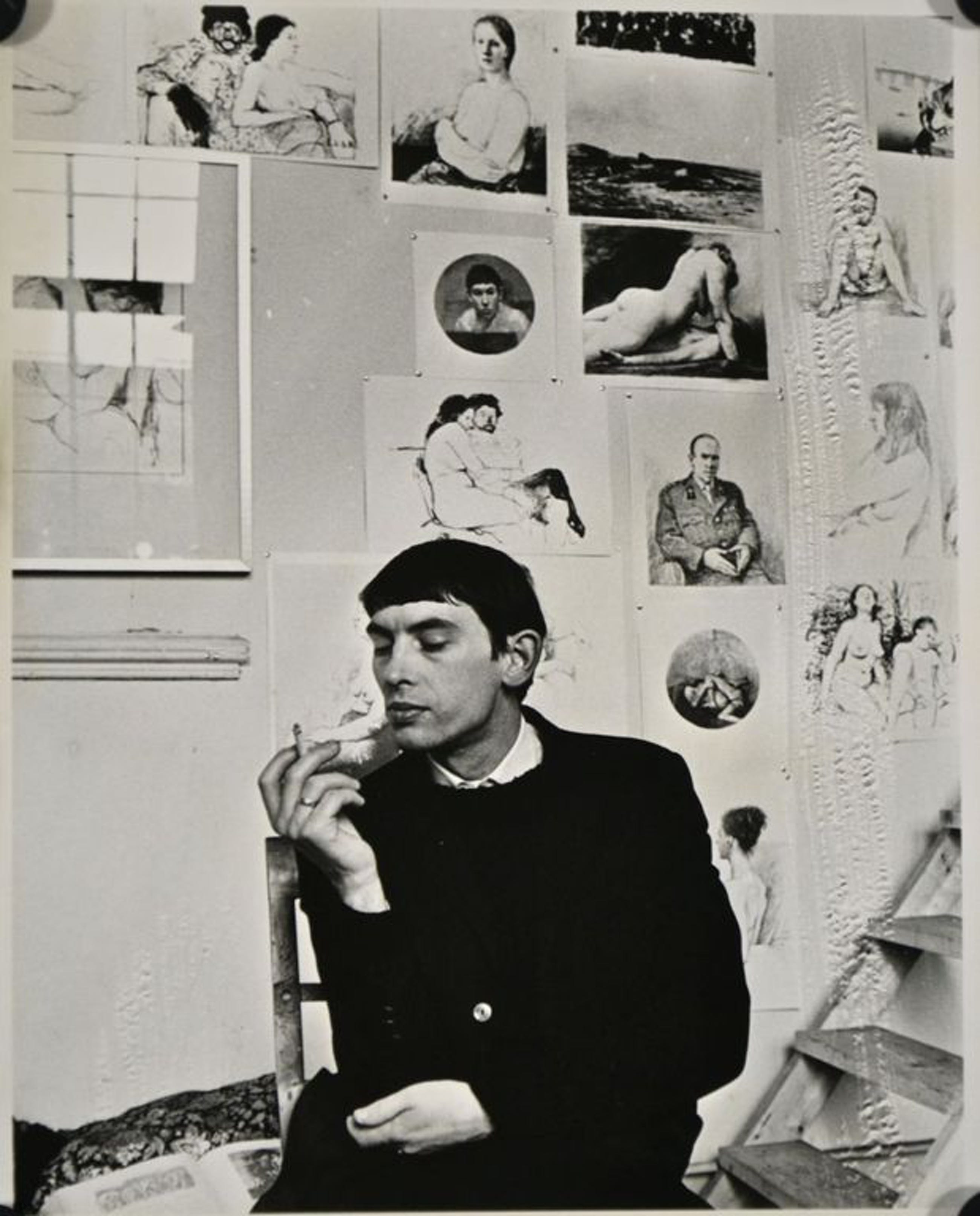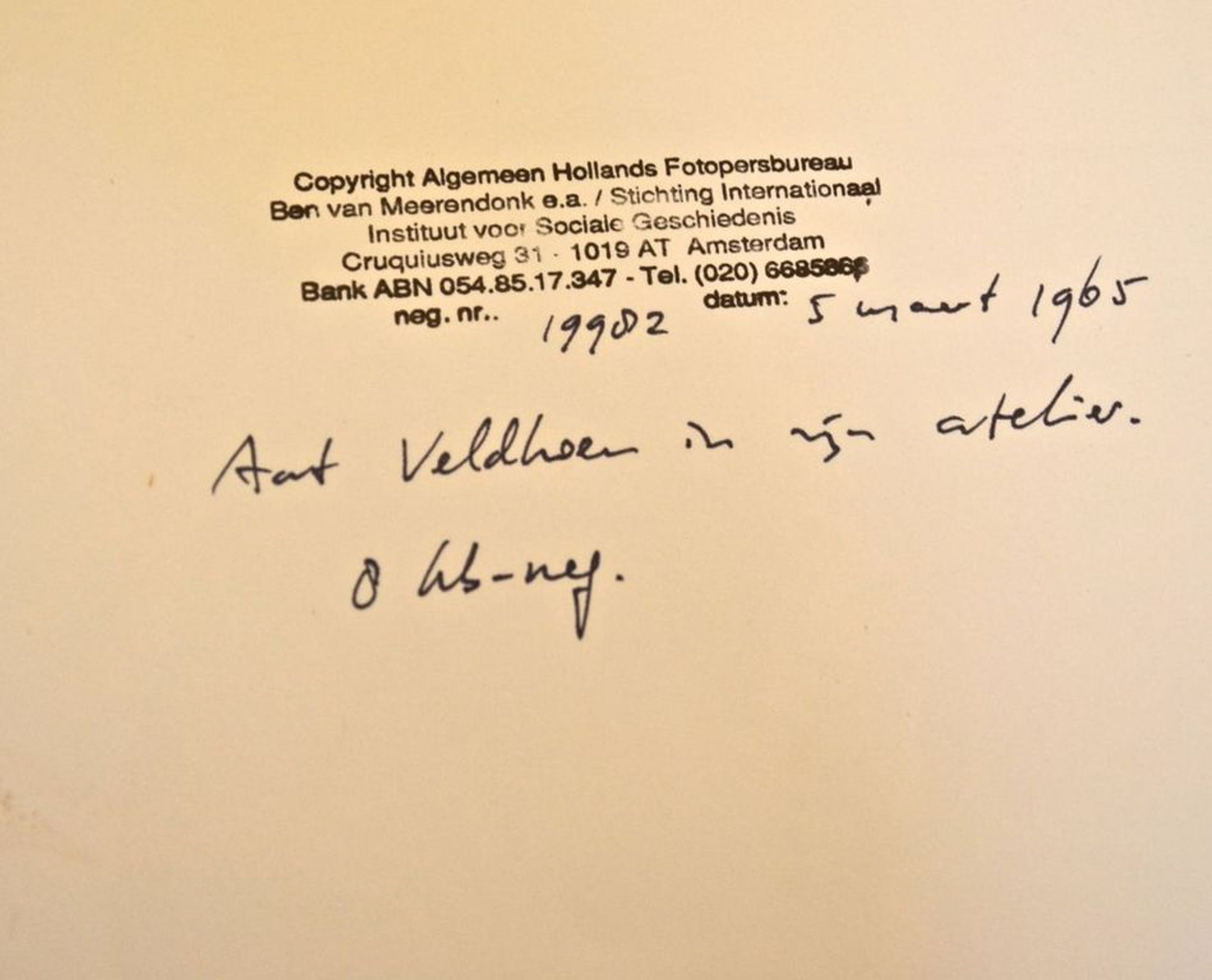 Bijzondere foto van Aat Veldhoen in zijn atelier (let ook op de achtergrond). De foto is gemaakt door een van de bekendste naoorlogse persfotografen Ben van Meerendonk. Van Meerendonk was onder andere de mede-oprichter van de World Press Photo en van het Algemeen Hollands Fotopersbureau