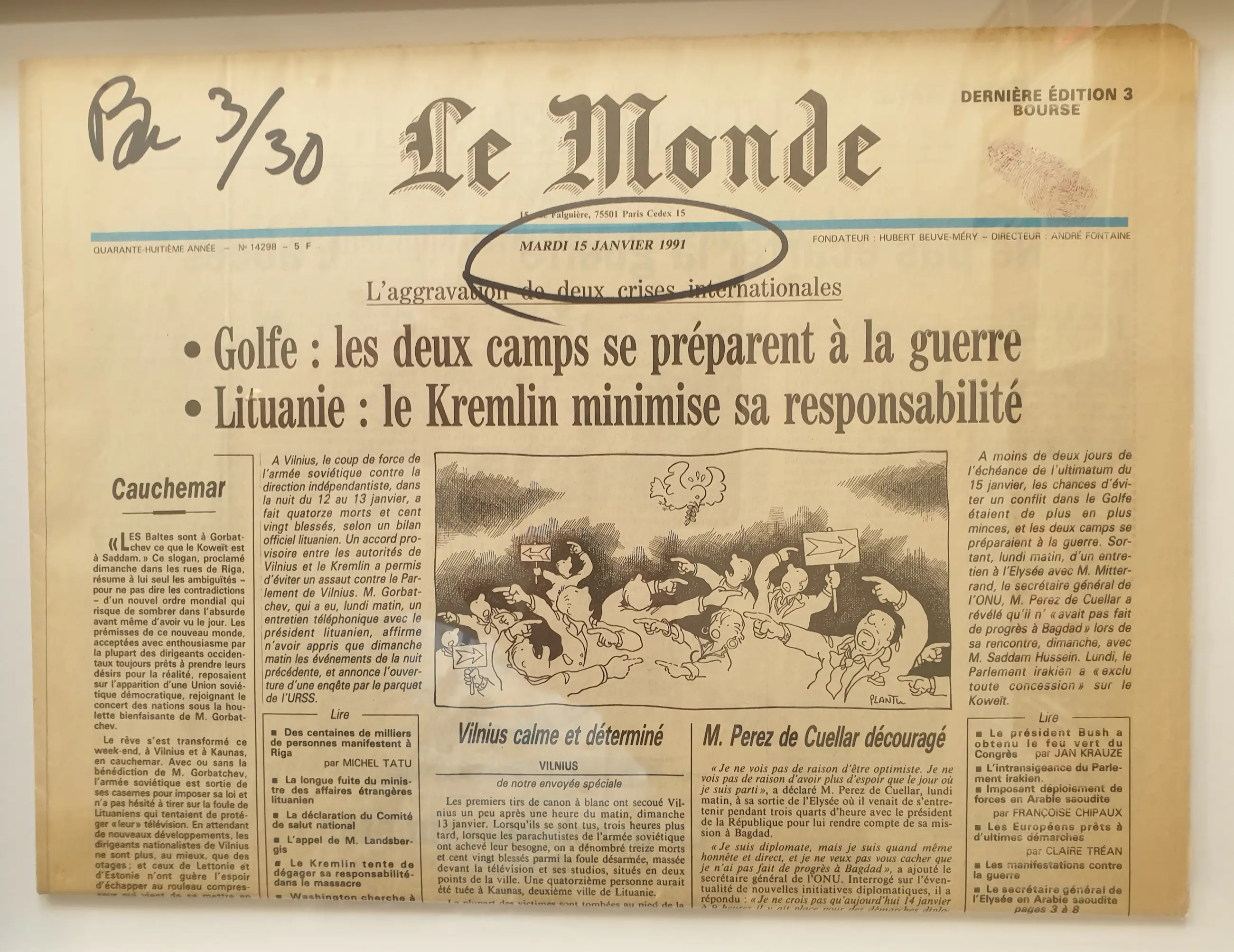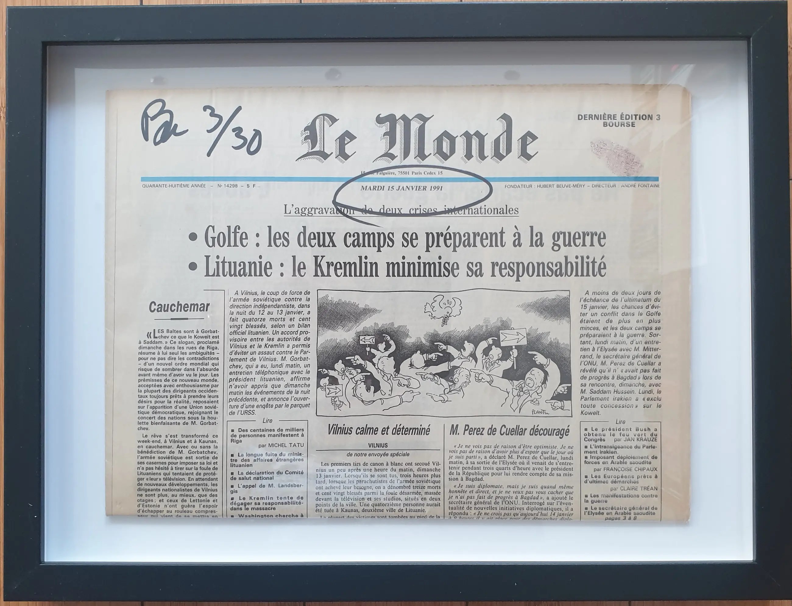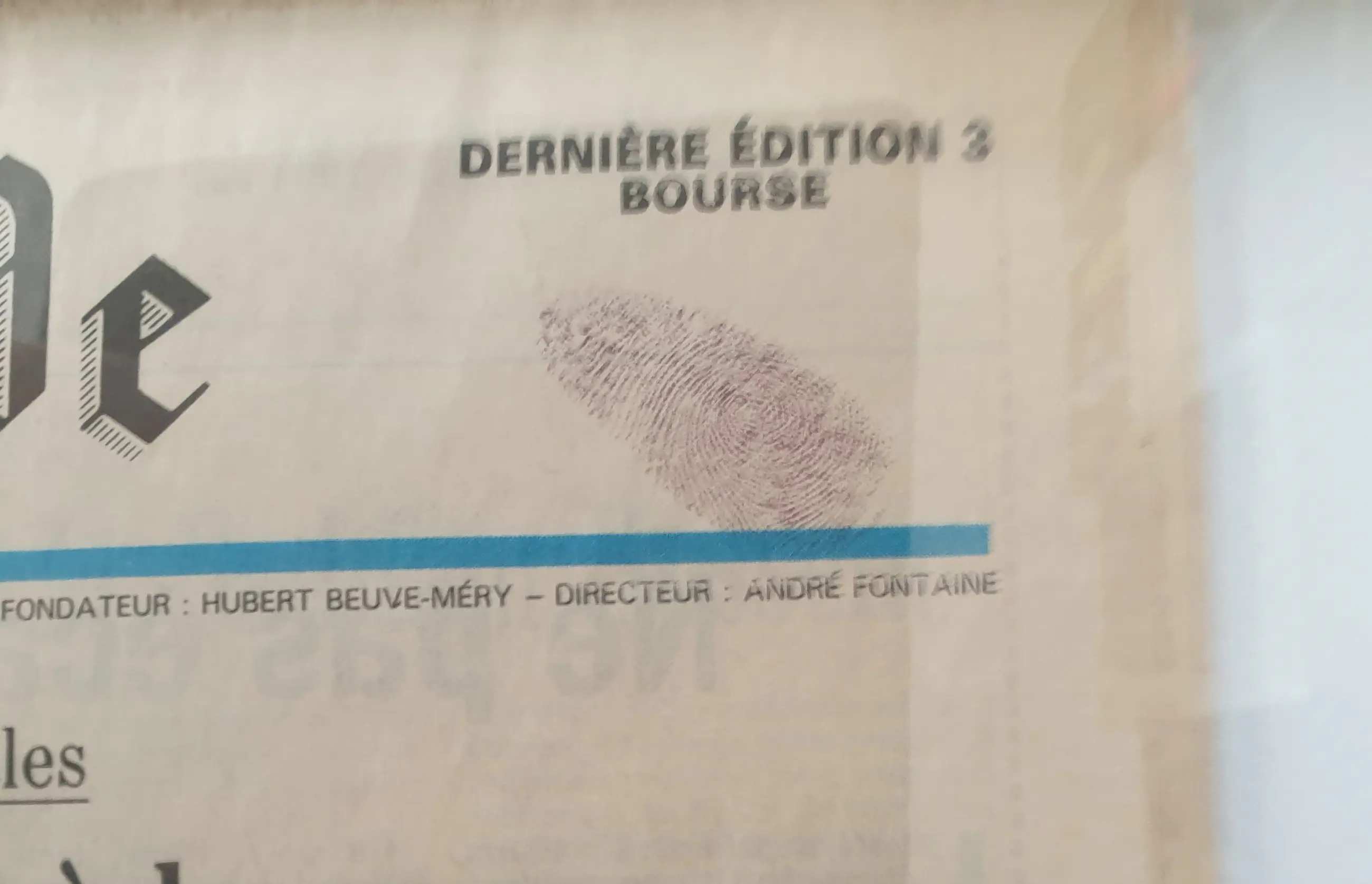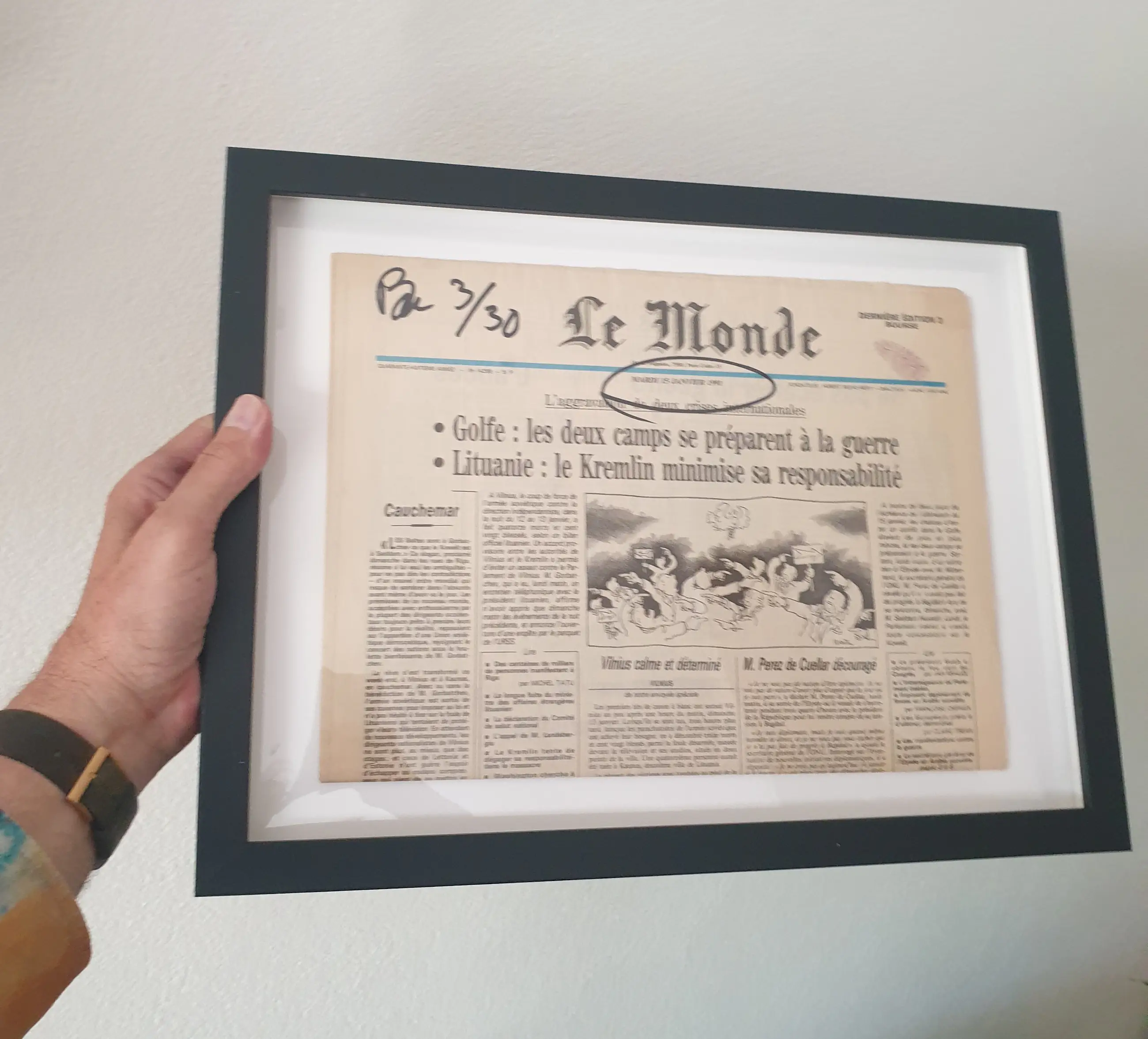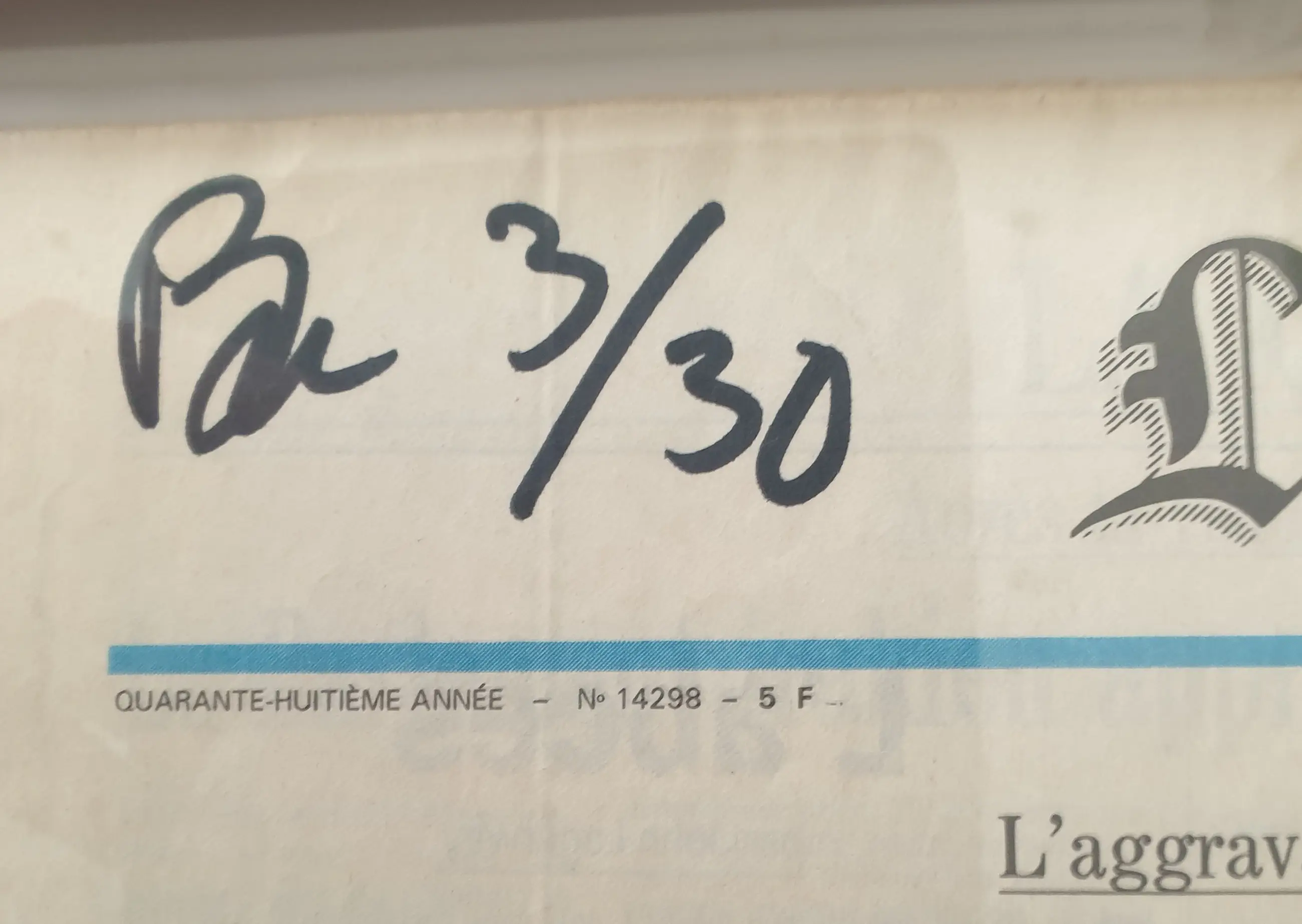 Multiple (Ready Made) van Ben Vautier (1935 - 2024). Van deze Fluxus kunstenaar een multiple van een gesigneerde en genummerde krant. "Ben signes Le Monde" (Ben signeert de wereld). Datum 15-01-1991. In de rechterbovenhoek voorzien van een vingerafdruk van Ben. Het werk is gevat in een baklijst van 32 x 42 cm. Wordt aangetekend verstuurd. Dit is nummer 3/30.