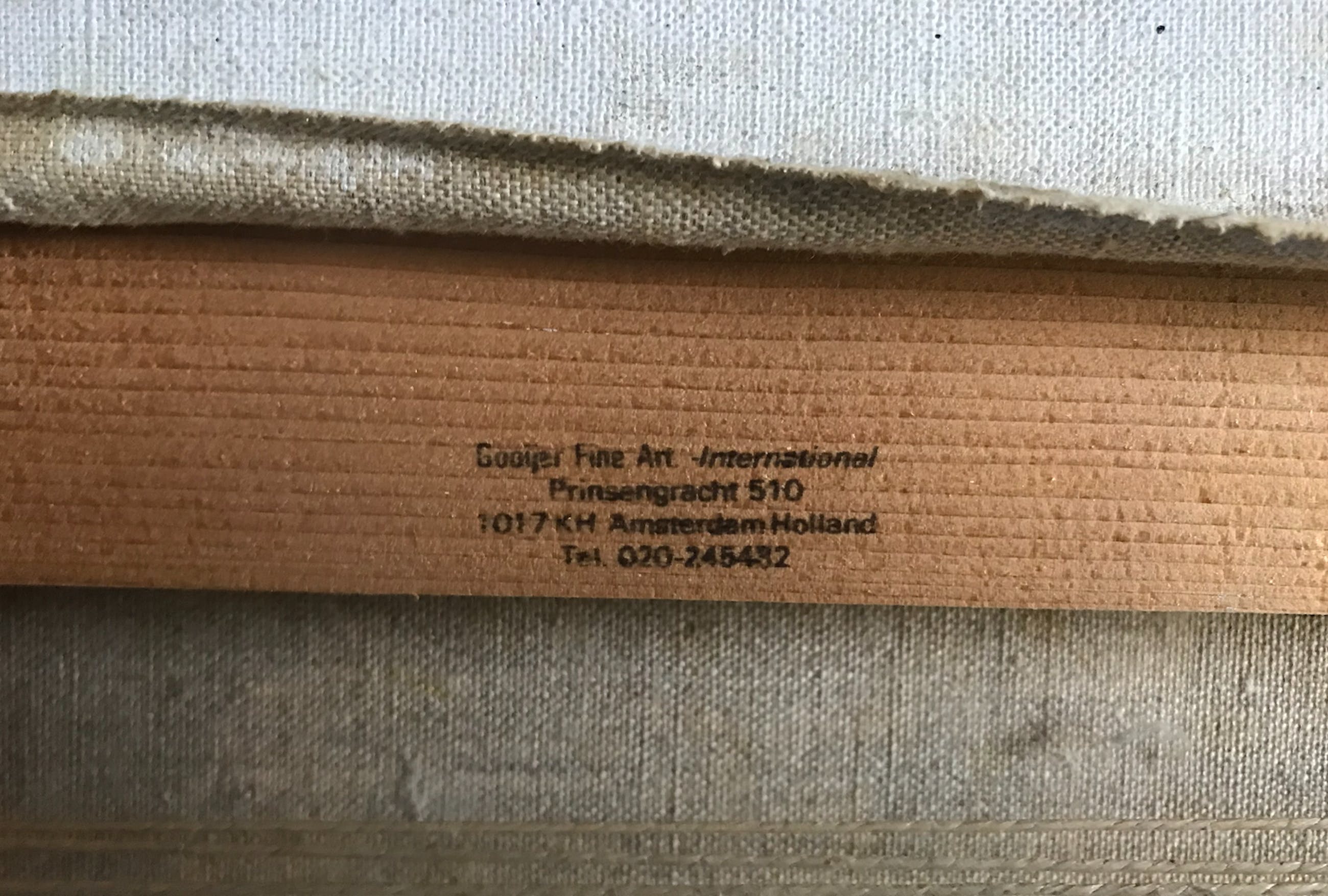 De afmetingen van het schilderij zijn 120x160 cm (zie foto 5). Het met olieverf bekladde doek zit om een houten lijst. Het schilderij is gekocht bij 'Gooijer Fine Art' te Amsterdam (zie foto 6). Helaas zitten er geen documenten bij. Afhalen kan in Burdaard.