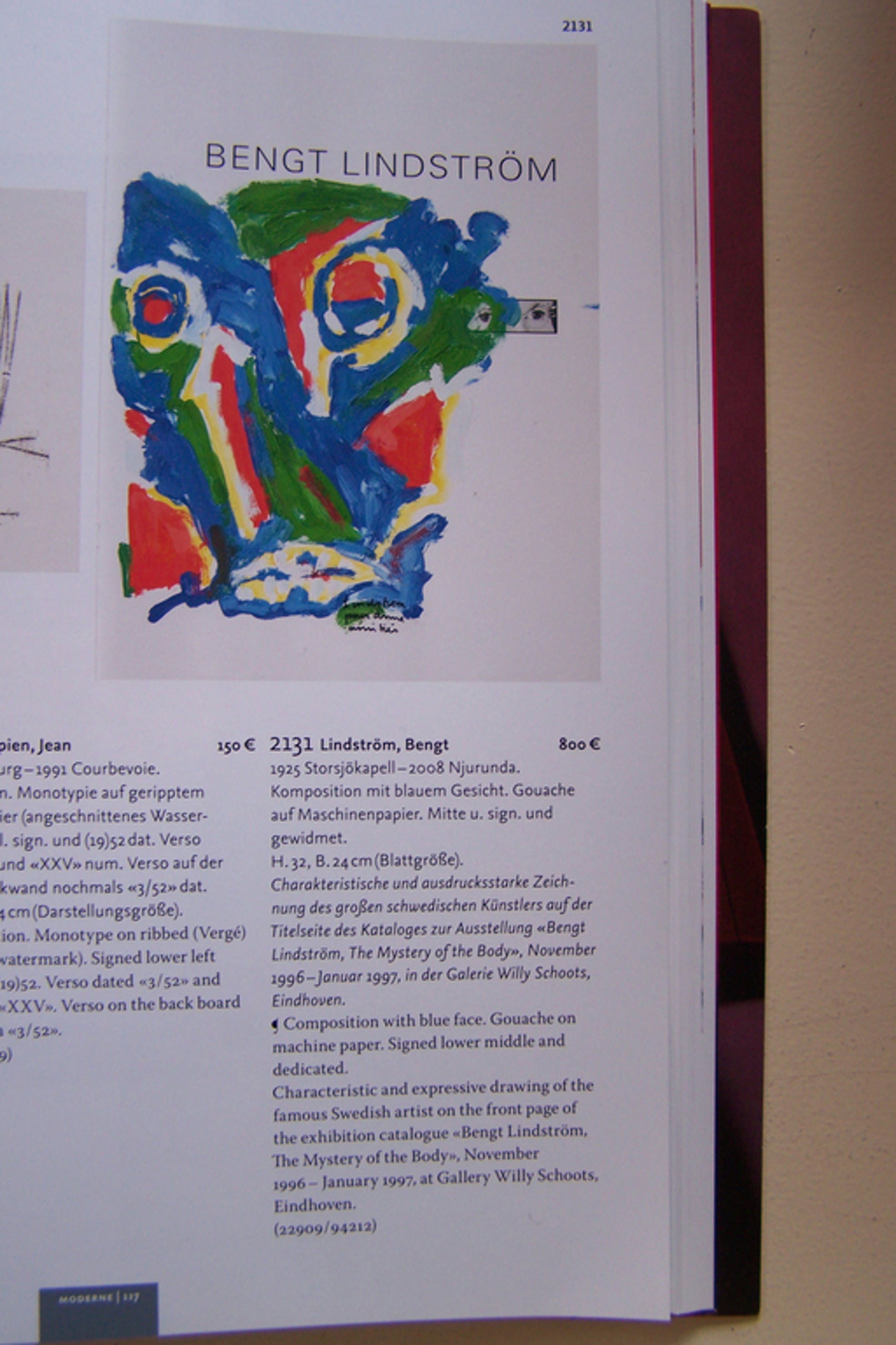 Hierbij bied ik aan een prachtige originele gouache op papier van Bengt Lindström. Deze gouache is geschilderd op het binnenblad van een catalogus die is uitgegeven n.a.v. een solo tentoonstelling met werken van Lindström in 1996 bij Galerie Willie Schoots, toen gevestigd in Eindhoven (nu Antwerpen). De gouache is gesigneerd met annotatie 'pour Anne amities. Anne was destijds de partner van Willy Schoots. Is eerder geveild in Duistland met een richtprijs van 800 euro. Echtheid derhalve gegarandeerd.De bladgrootte is 32 x 24 cm. De naam Bengt Lindström boven de gouache is gedrukt evenals de ogen die de kunstenaar bewust bij de gouache heeft betrokken. Een prachtig origineel werk van deze beroemde kunstenaar. De catalogus is nog in complete staat, maar het werk kan desgewenst appart worden ingelijst.