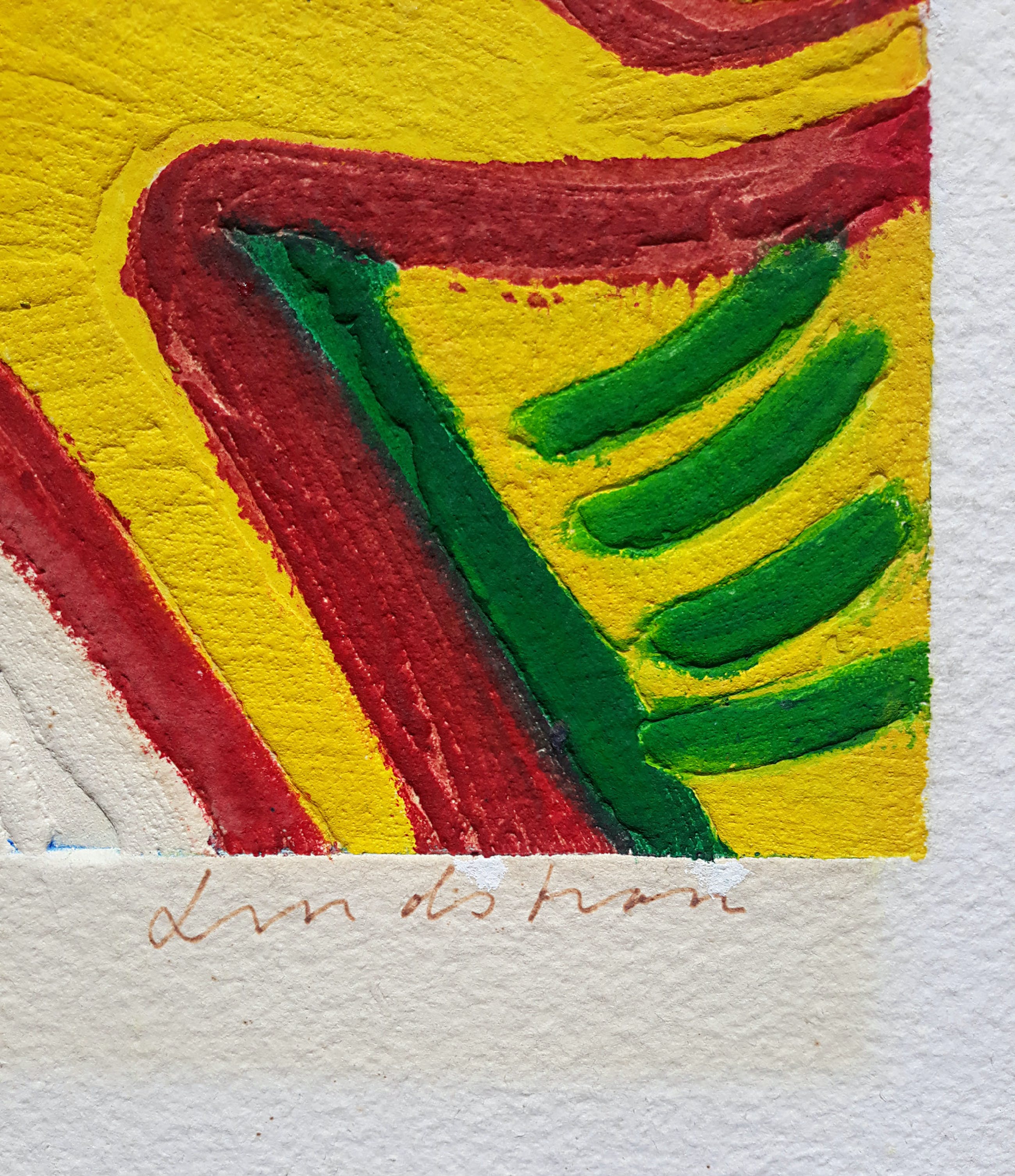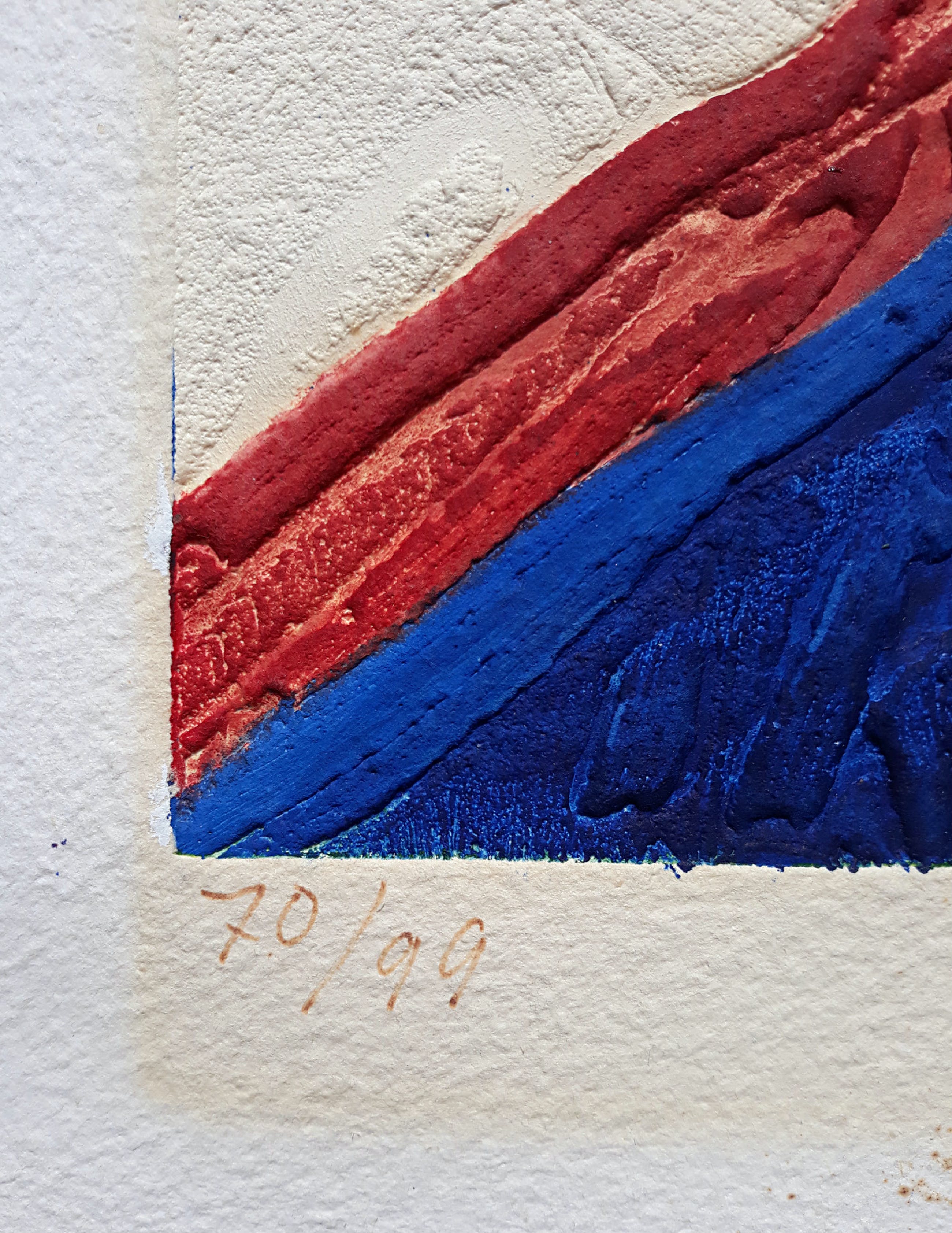 Prachtig fantasiewezen van Bengt Lindström uit 1989. Meestal wordt dit werk als aquagravure omschreven, soms als carborundum ets, maar er is in ieder geval sprake van veel reliëf. Gedrukt op dik geschept Larroque & Pombié papier, met stift gesigneerd en genummerd (70/99). In redelijk goede conditie; aquagravure zelf is uitstekend maar er is een verkleuring van de marge binnen een vorig passe-partout en de marge is hier en daar wat smoezelig.