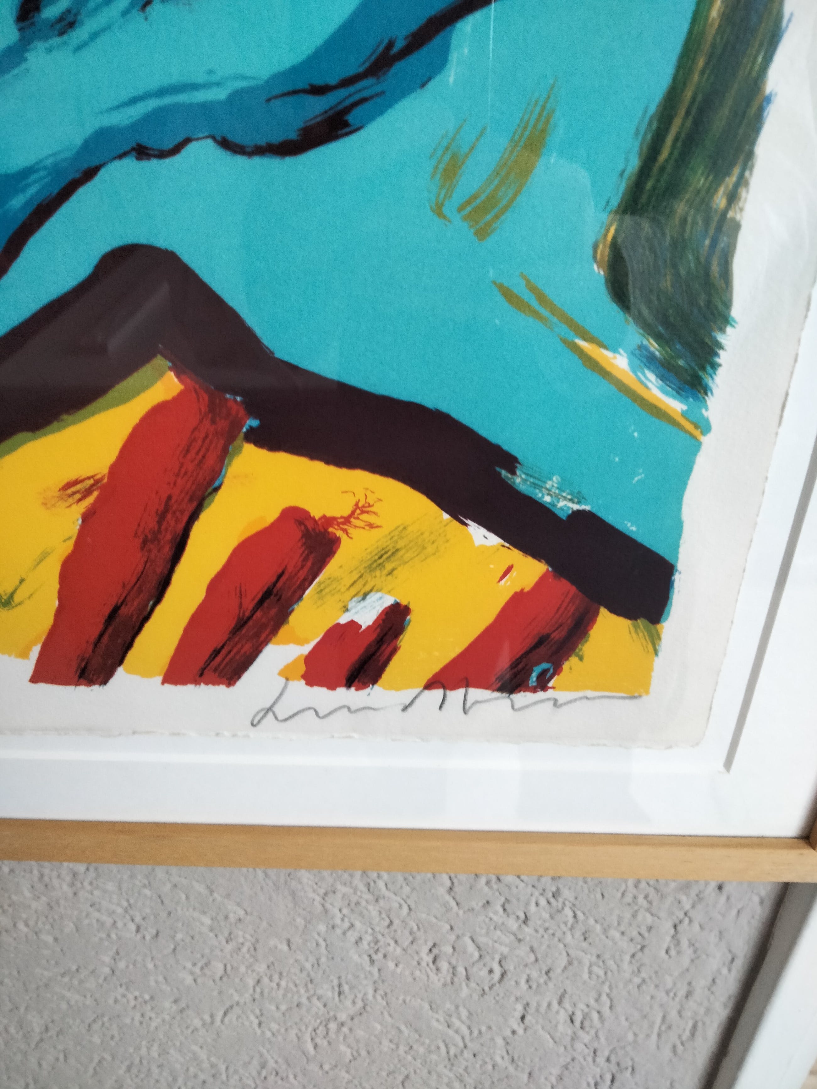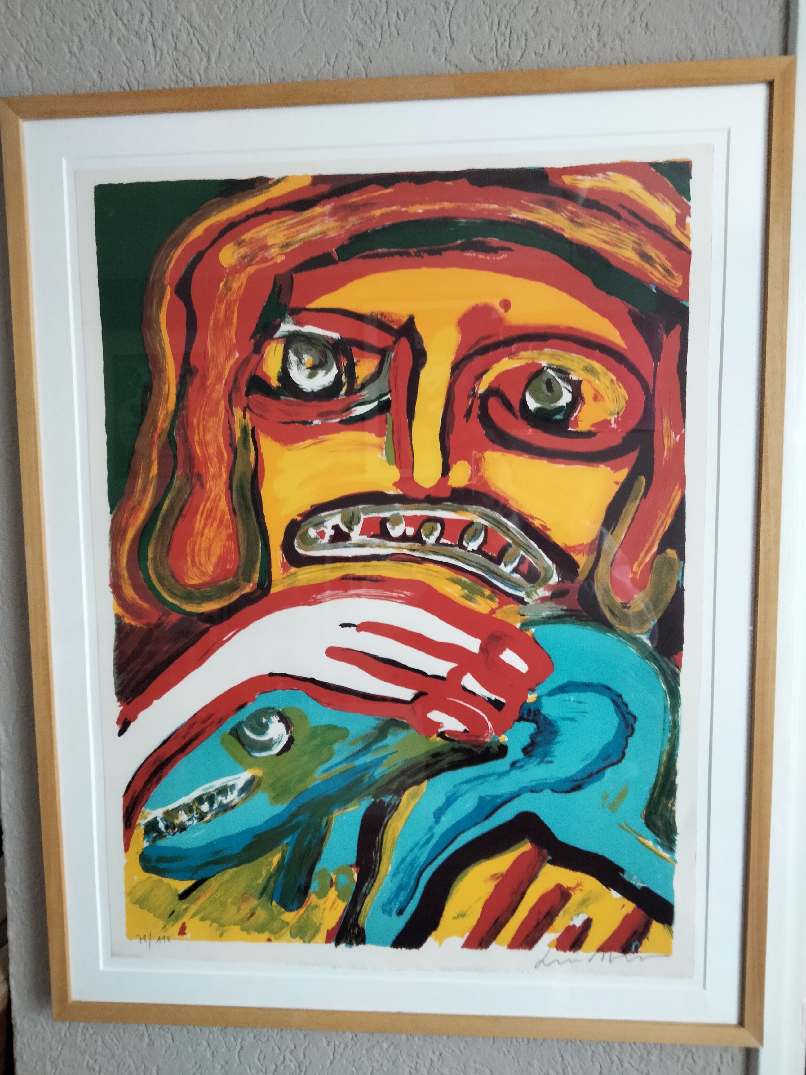 Grote zeer mooie kleurrijke zeefdruk van bengt lindstrom getiteld:Femme et chien. Mooi strak ingelijst is ophang klaar. Óplage nummer: 78/110.