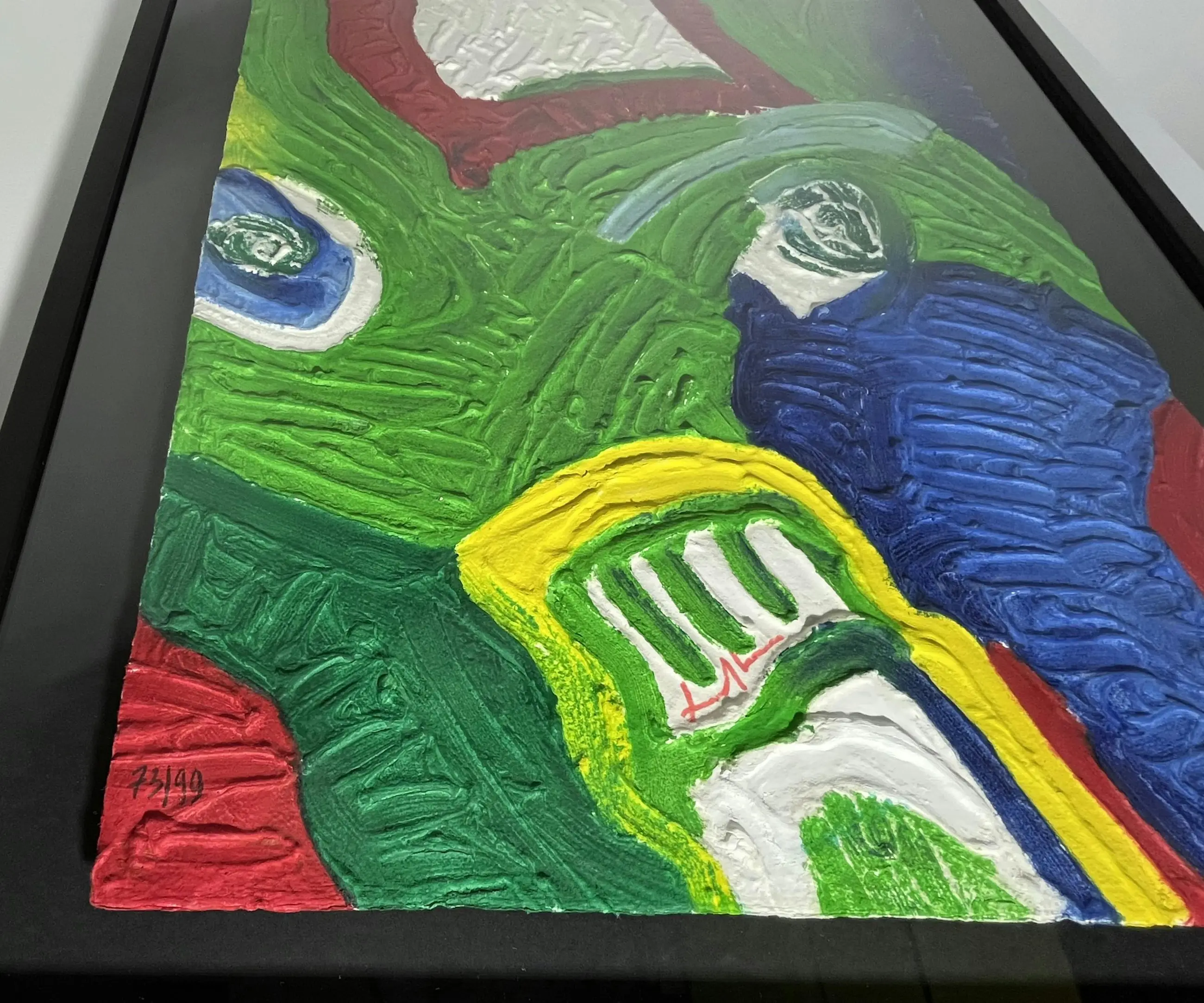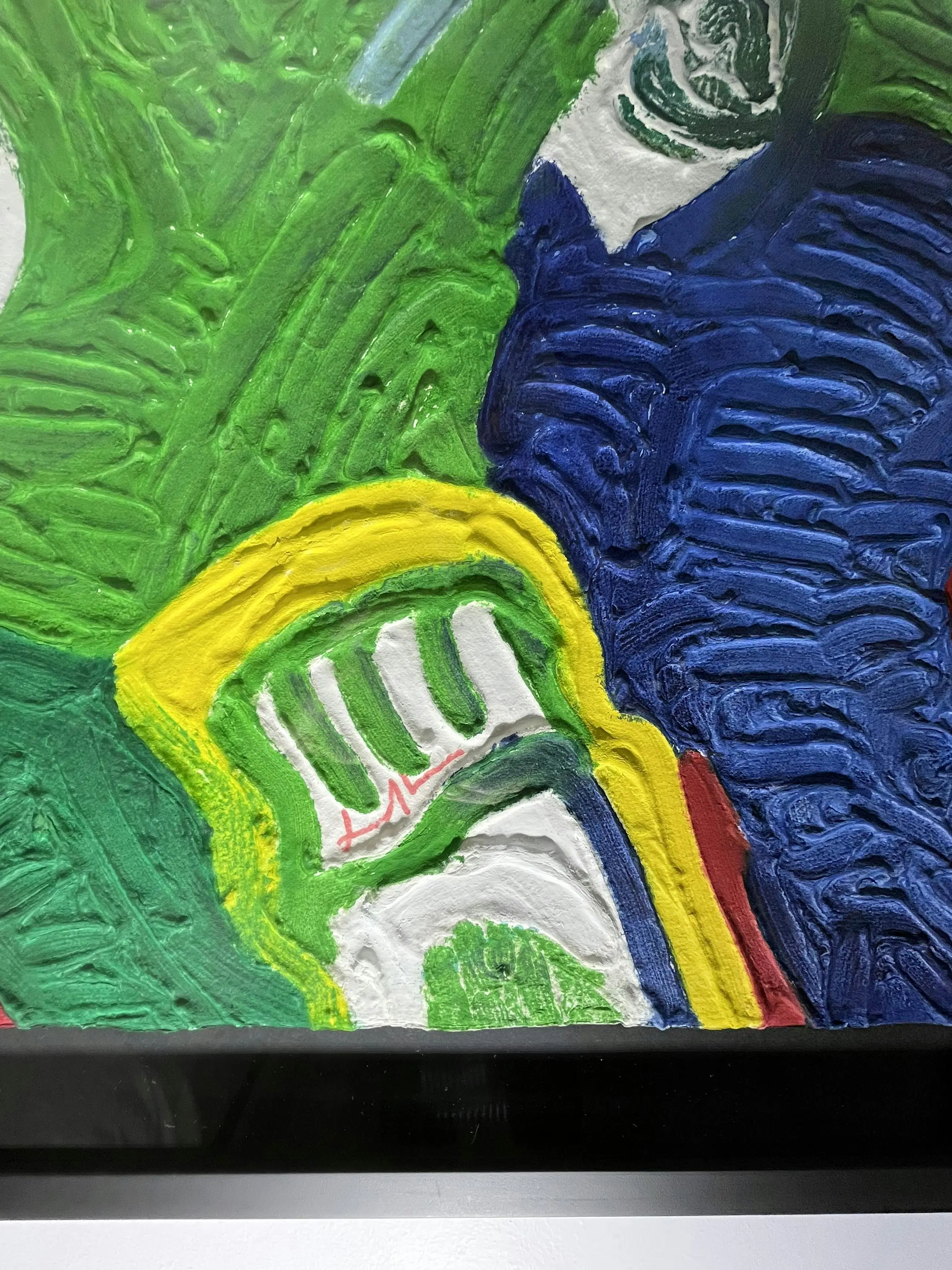 Prachtig, groot, kleurrijk en expressief werk. Een fascinerend compositie met een dynamisch samenspel van rode, blauwe, groene en witte tinten.