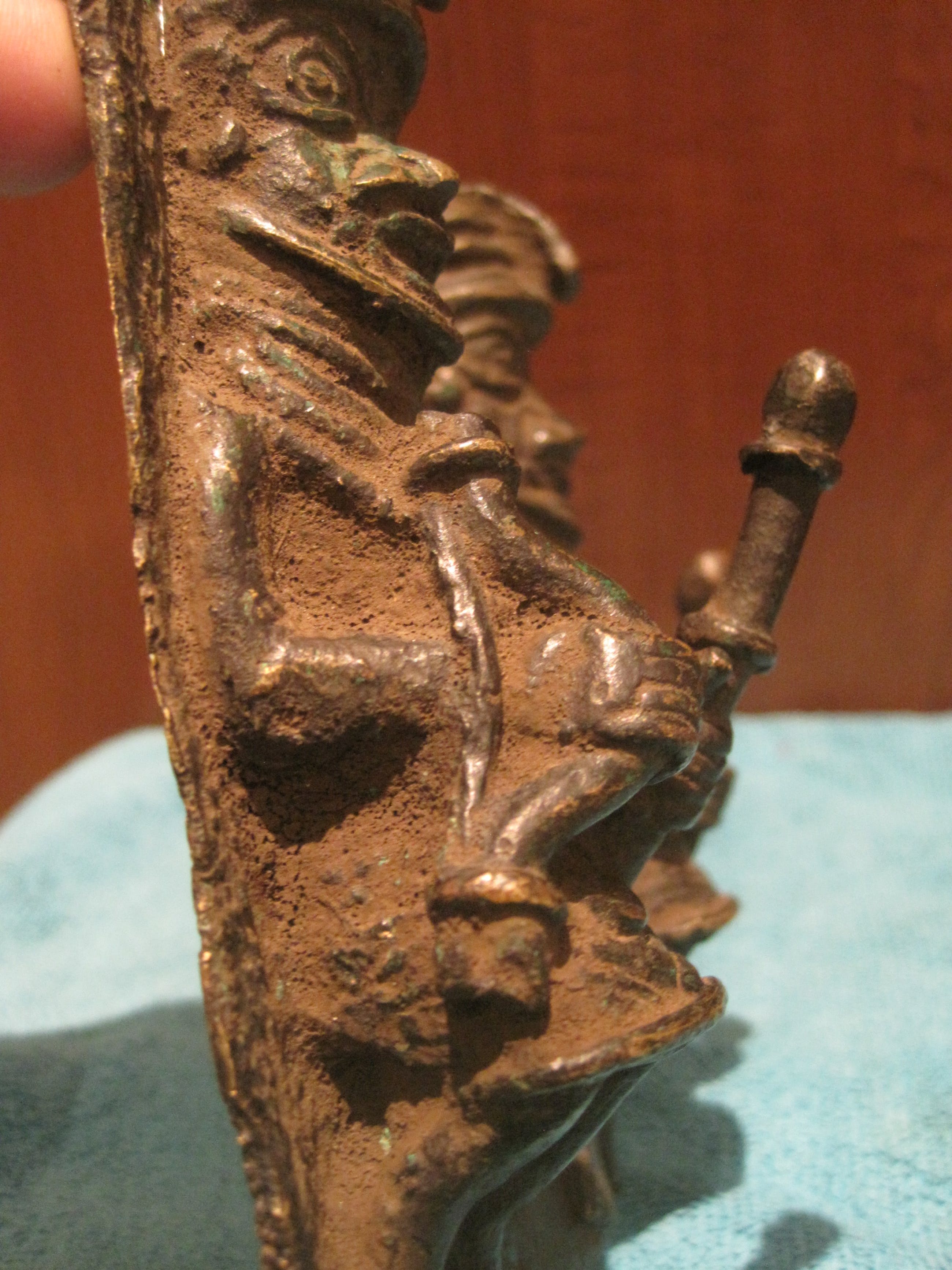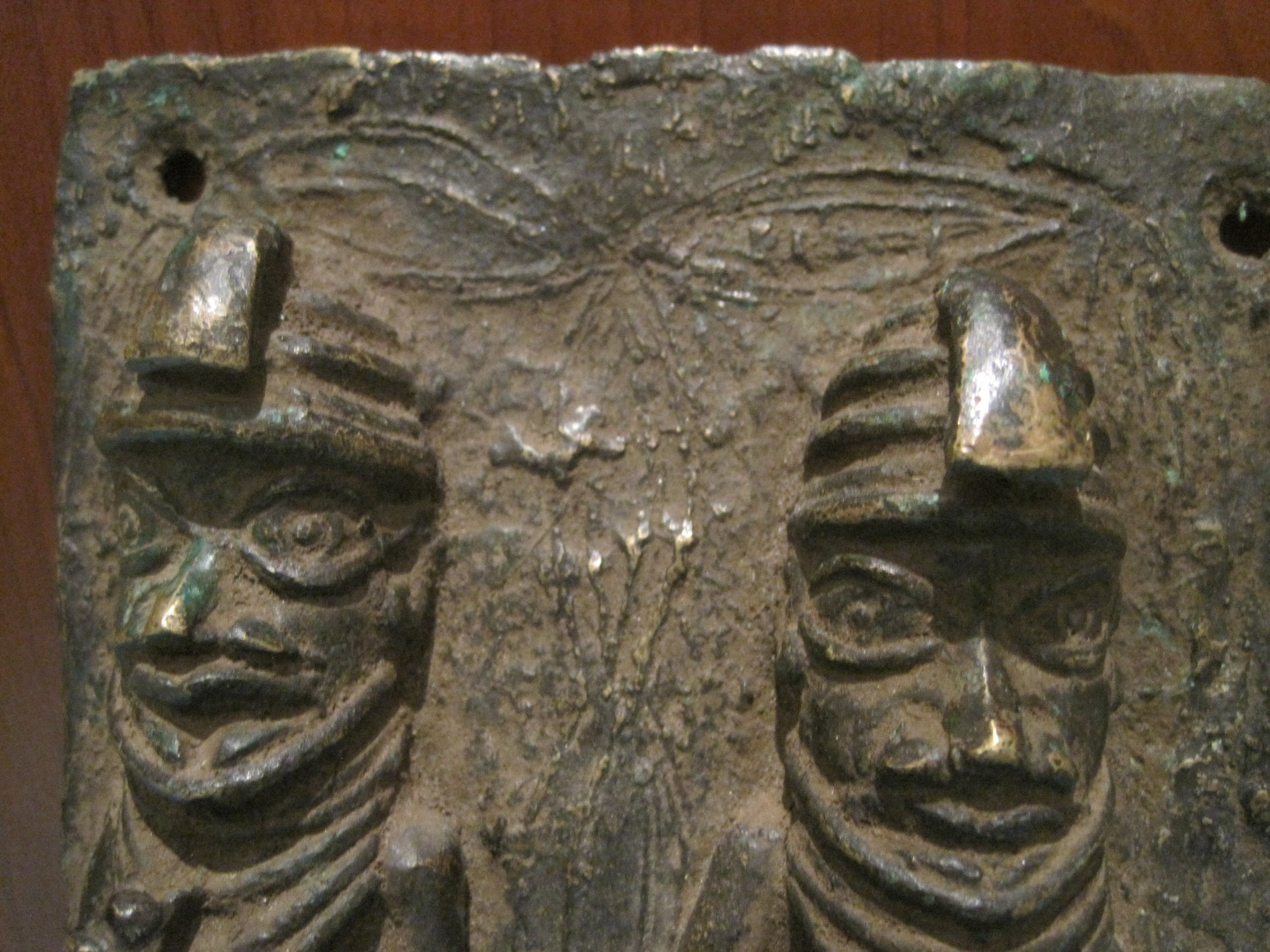 Bronzen paneel uit de regio Benin. Dit soort plaquettes werden op de muren van het paleis van de koning geplaatst, ze verwijzen naar juridische ceremonies. Dit paneel verwijst in het bijzonder naar de Oba-koning samen met twee patroonheiligen. Zeer mooi en fijn gedetailleerd. Het paneel is in reliëf gegoten met behulp van de verloren was methode. Dit maakt dit paneel uniek in zijn soort. Conditie: goed met een mooie ouderdomspatina. Zie foto's voor eigen indruk. Ik kan hier geen leeftijd aan hangen, daarom houd ik het op de 2e helt van de 20e eeuw. Na de verwoesting van het paleis van de koning van Benin in 1897 door het Britse leger, werden vrijwel alle bronzen stukken naar Engeland verscheept en verkocht. Het British Museum bezit een grote collectie. Hierover zijn onderhandelingen gaande voor teruggave.