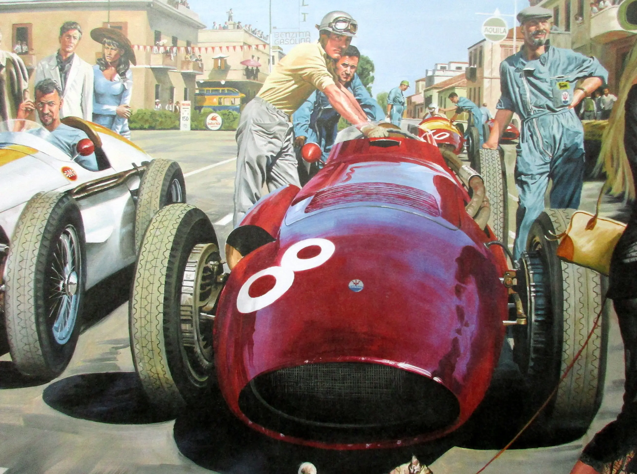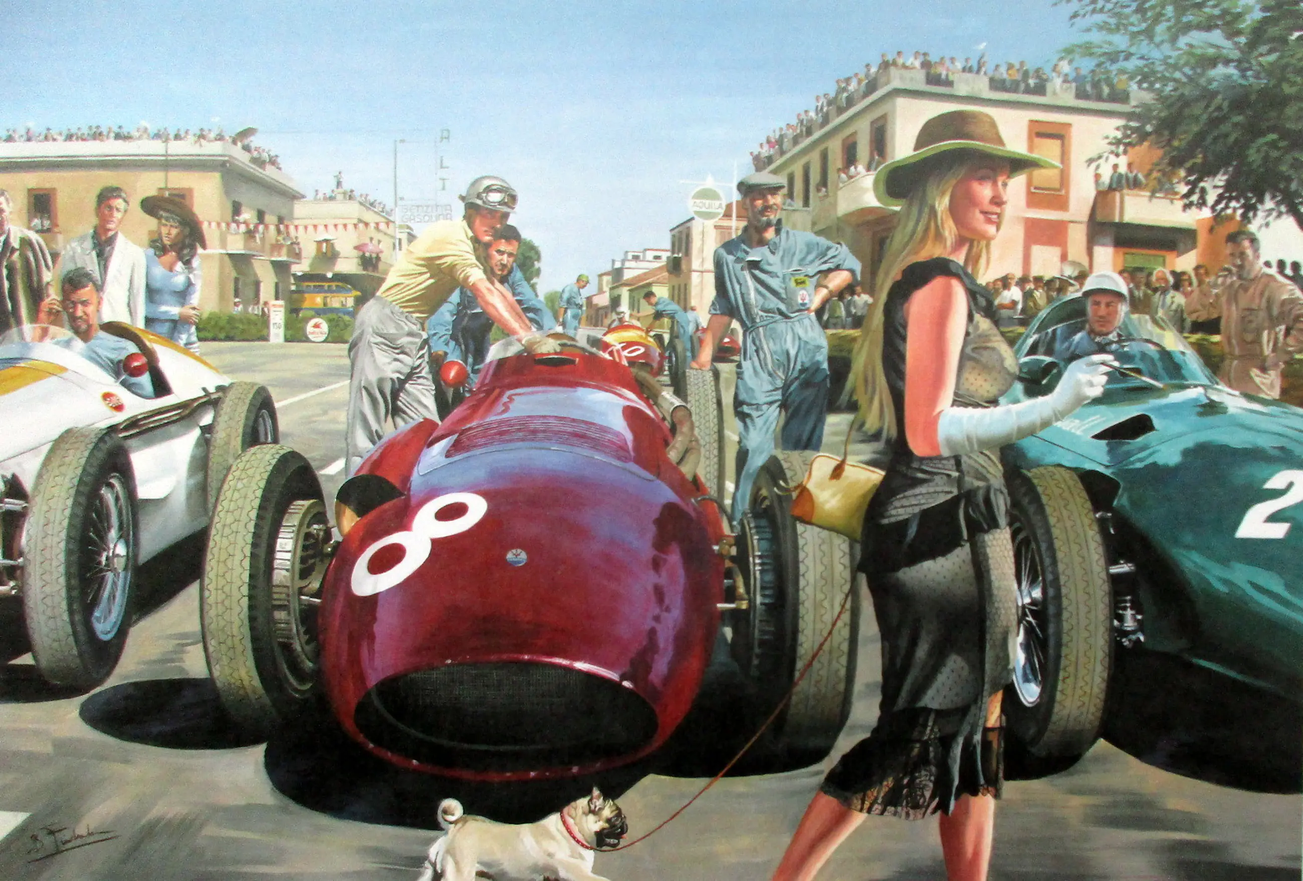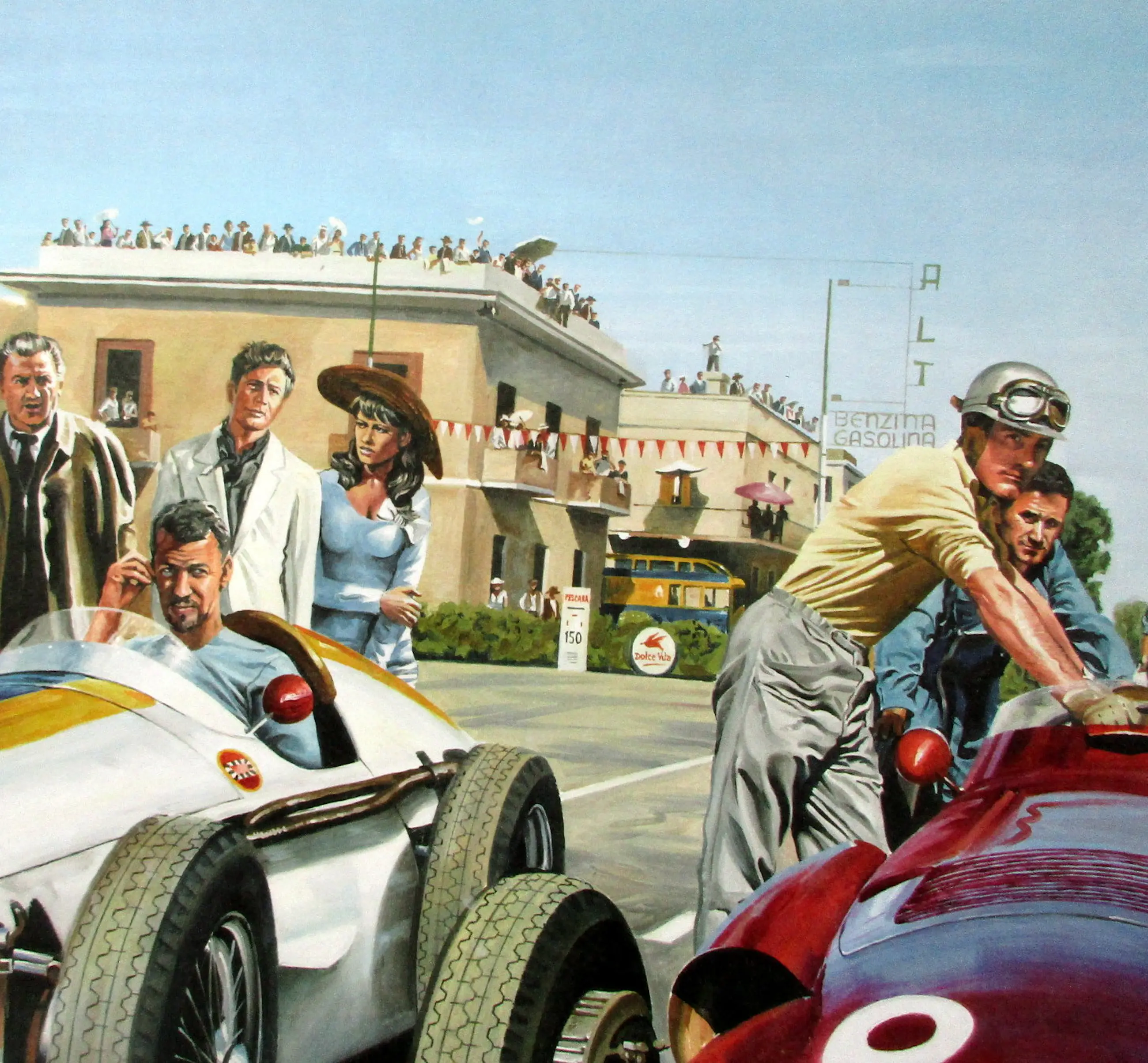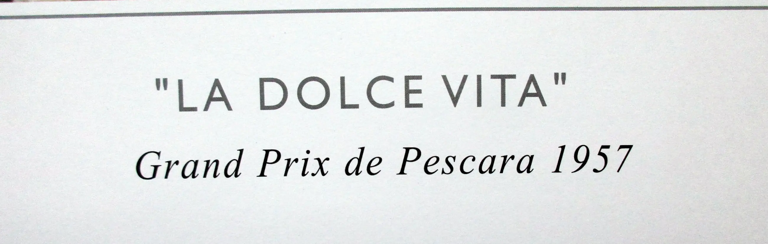 Je kijkt naar de Grand Prix van Pescara in Italië in 1957. De coureurs maken zich klaar op de startgrid wanneer plotseling een mooi blond meisje komt om de boel in de war te sturen. Ze wordt gevolgd door een lelijk hondje. Joachim Bonnier krabt zich achter zijn oor, Scarlatti houdt zich nerveus vast aan zijn Maserati (om niet te vallen) en Stirling Moss vraagt zich af wat hij moet doen. Maar deze jonge vrouw is Anita Ekberg en er is iemand die heel goed weet wat hij moet doen: Federico Fellini! (Hij staat links op de achtergrond, vlakbij Marcello Mastroianni en Claudia Cardinale). Gelimiteerde oplage van 400 exemplaren. Elk exemplaar is gesigneerd en genummerd.