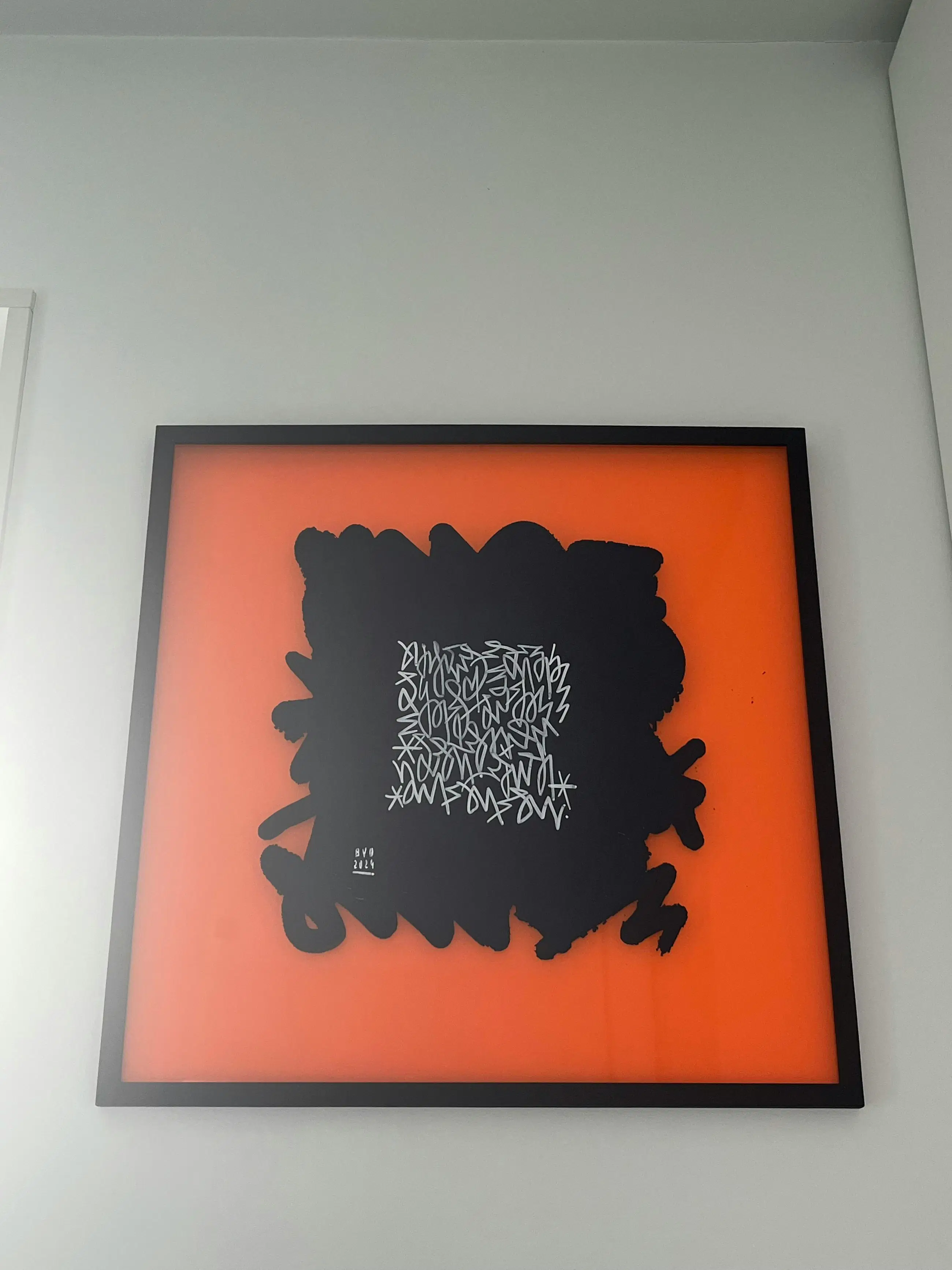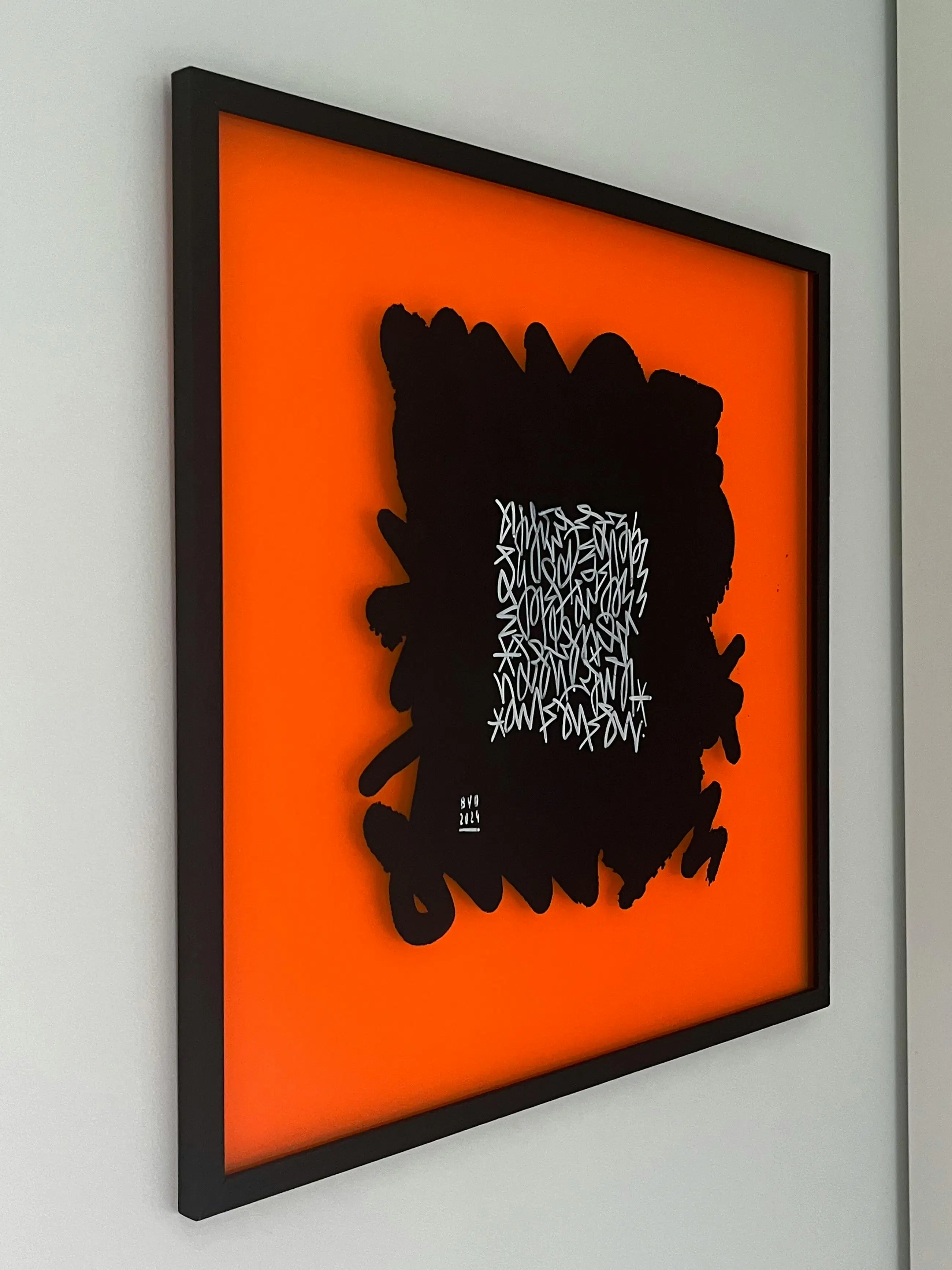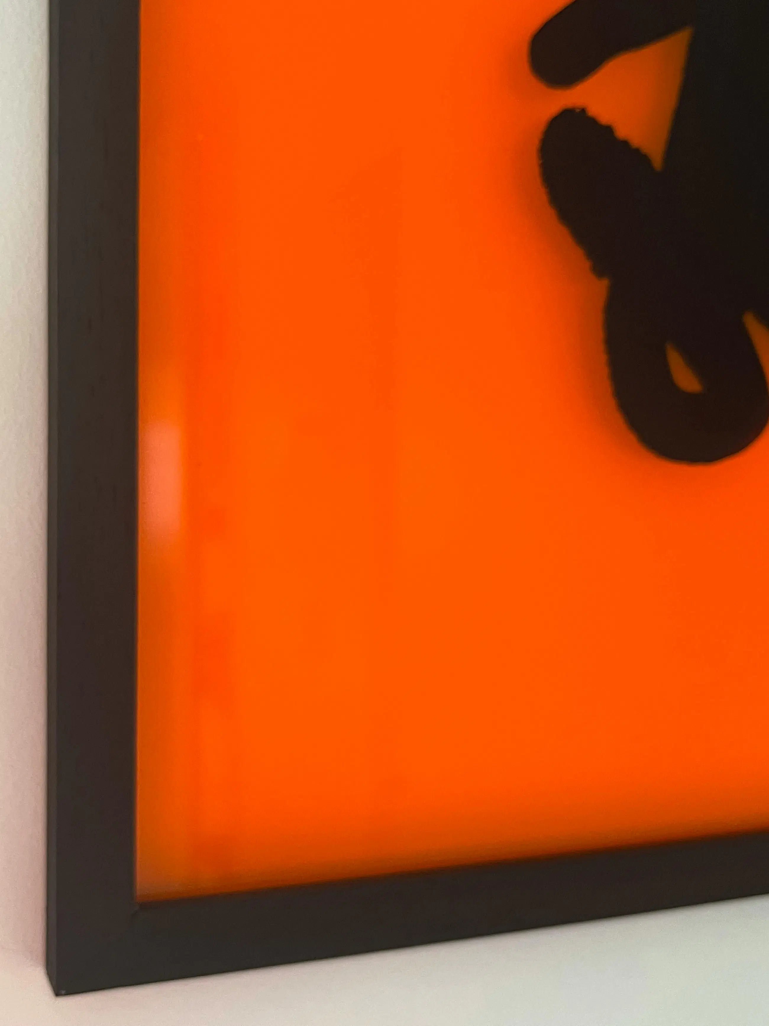 Het werk valt direct op door het krachtige kleurcontrast. Van Oost maakt gebruik van een feloranje, transparante drager die fungeert als canvas voor de centrale zwarte vorm. Door de gelaagde compositie en het gebruik van plexiglas ontstaat er een bijzondere dieptewerking.
