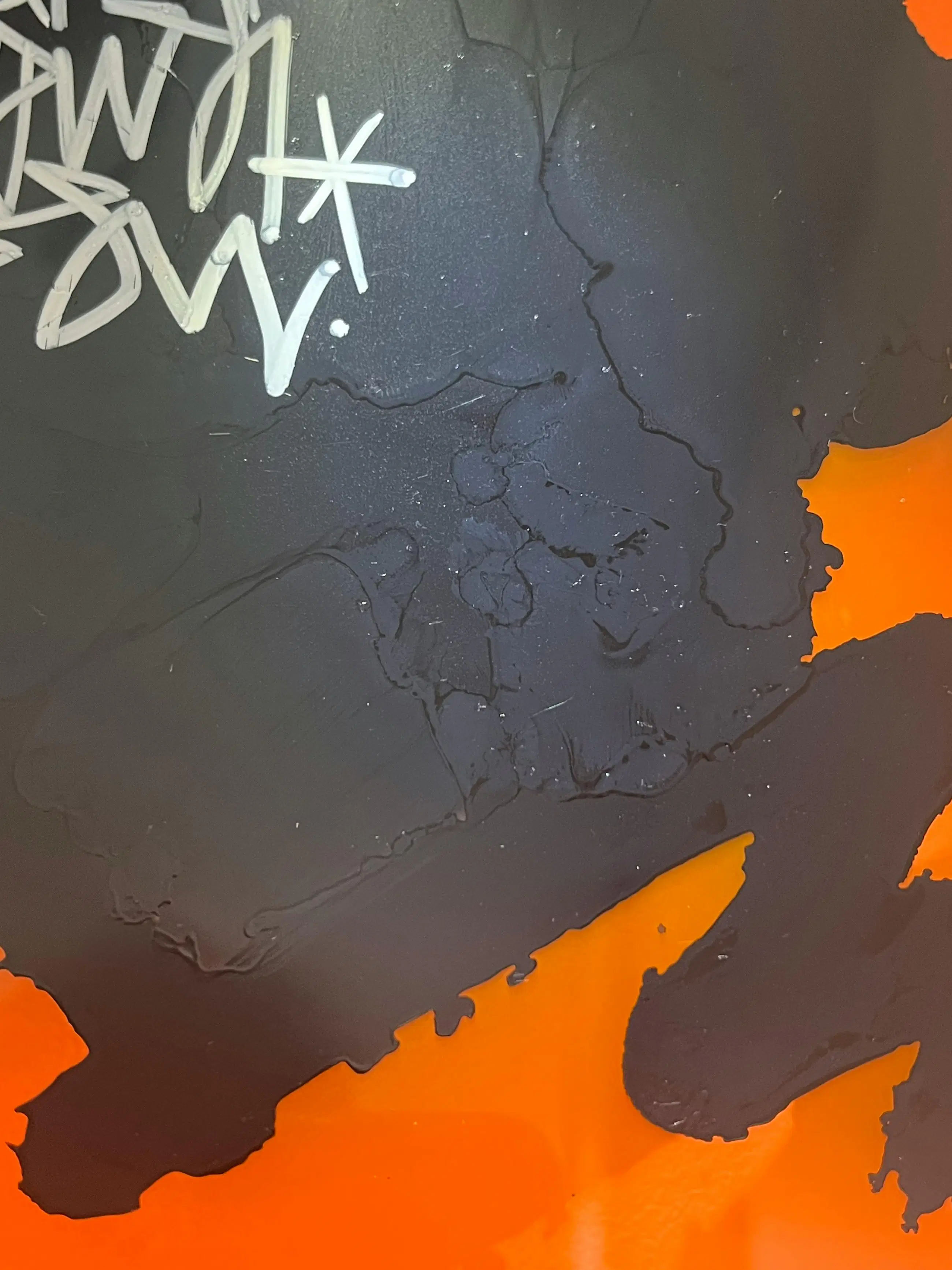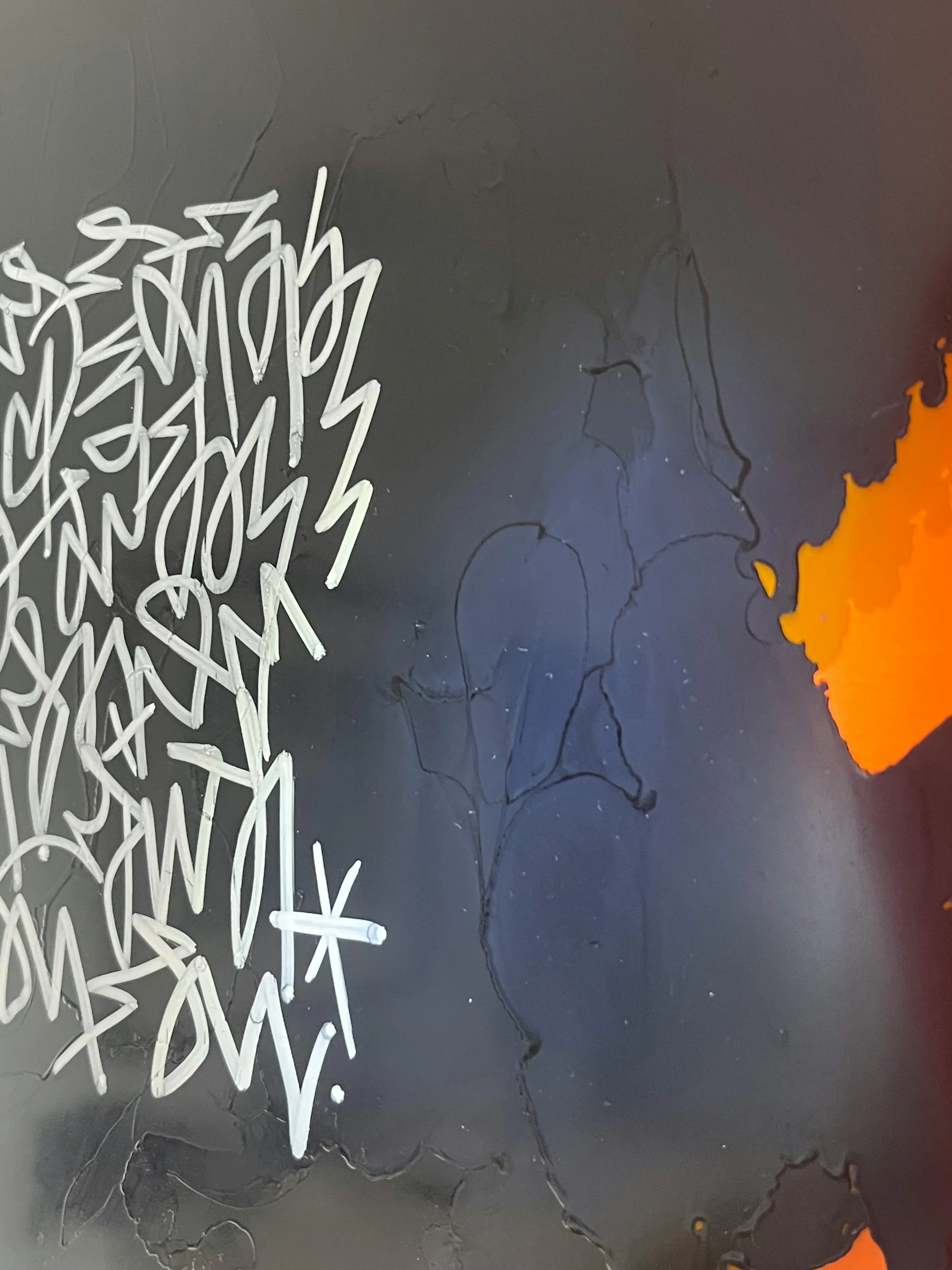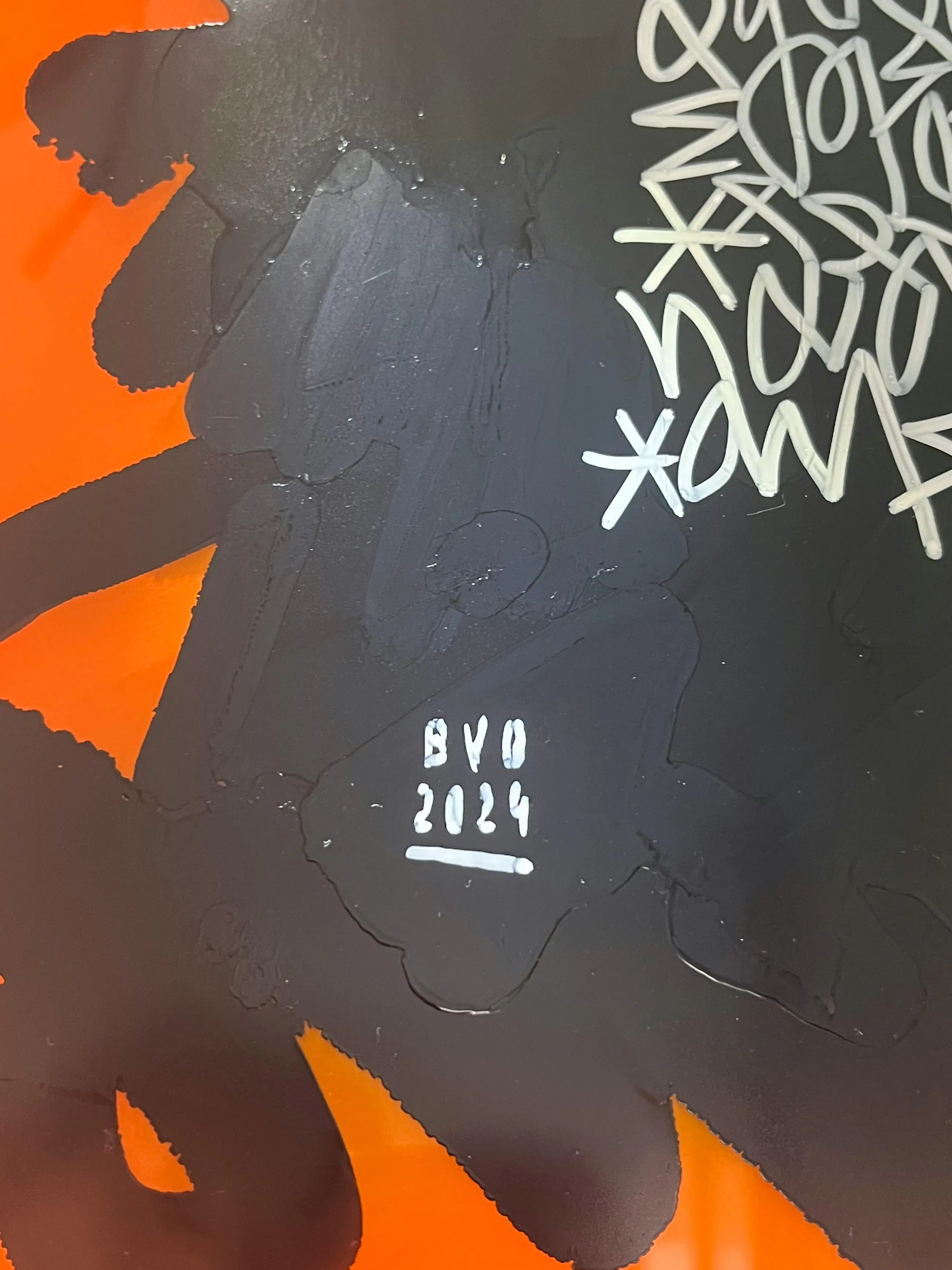 Het werk valt direct op door het krachtige kleurcontrast. Van Oost maakt gebruik van een feloranje, transparante drager die fungeert als canvas voor de centrale zwarte vorm. Door de gelaagde compositie en het gebruik van plexiglas ontstaat er een bijzondere dieptewerking.
