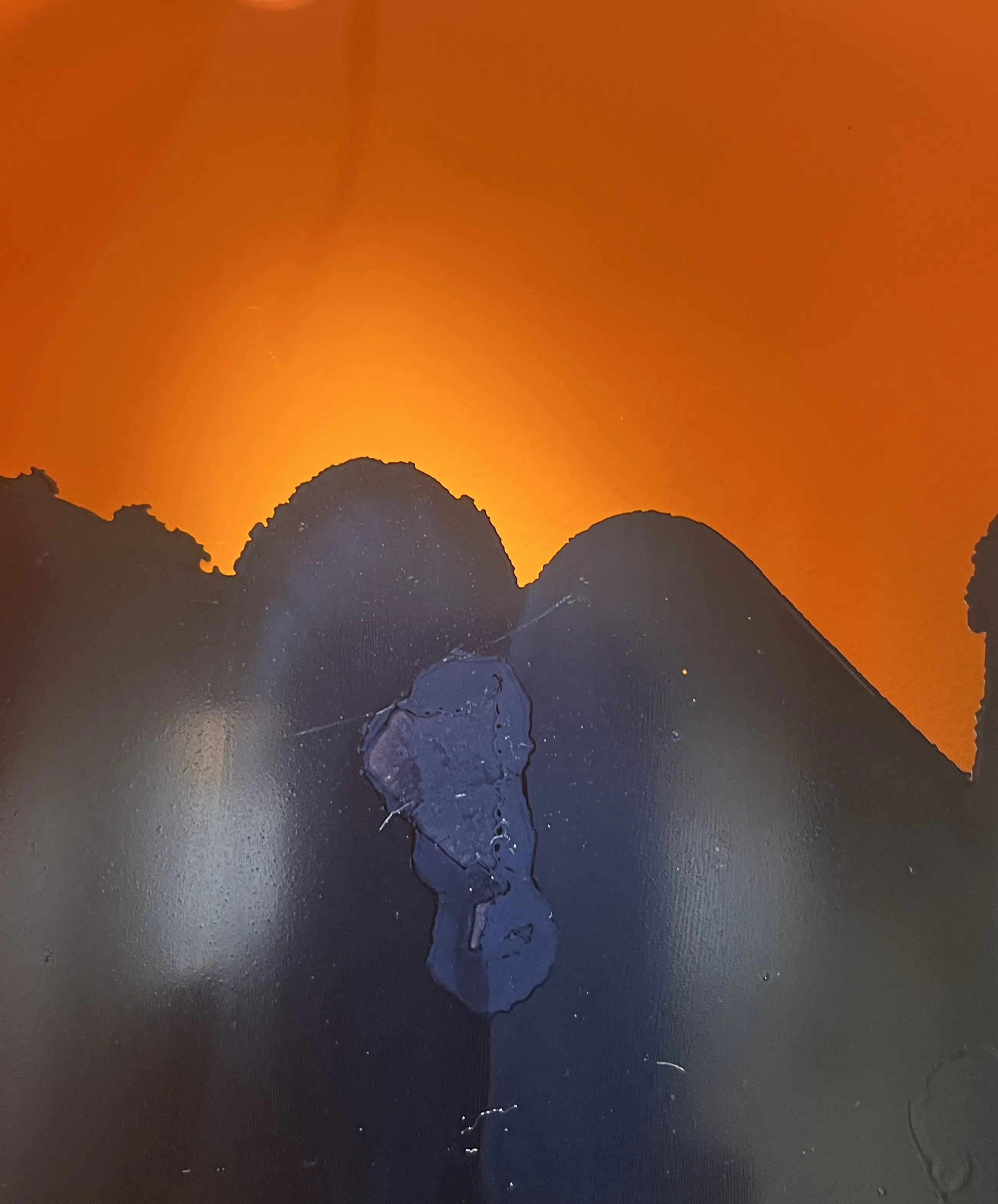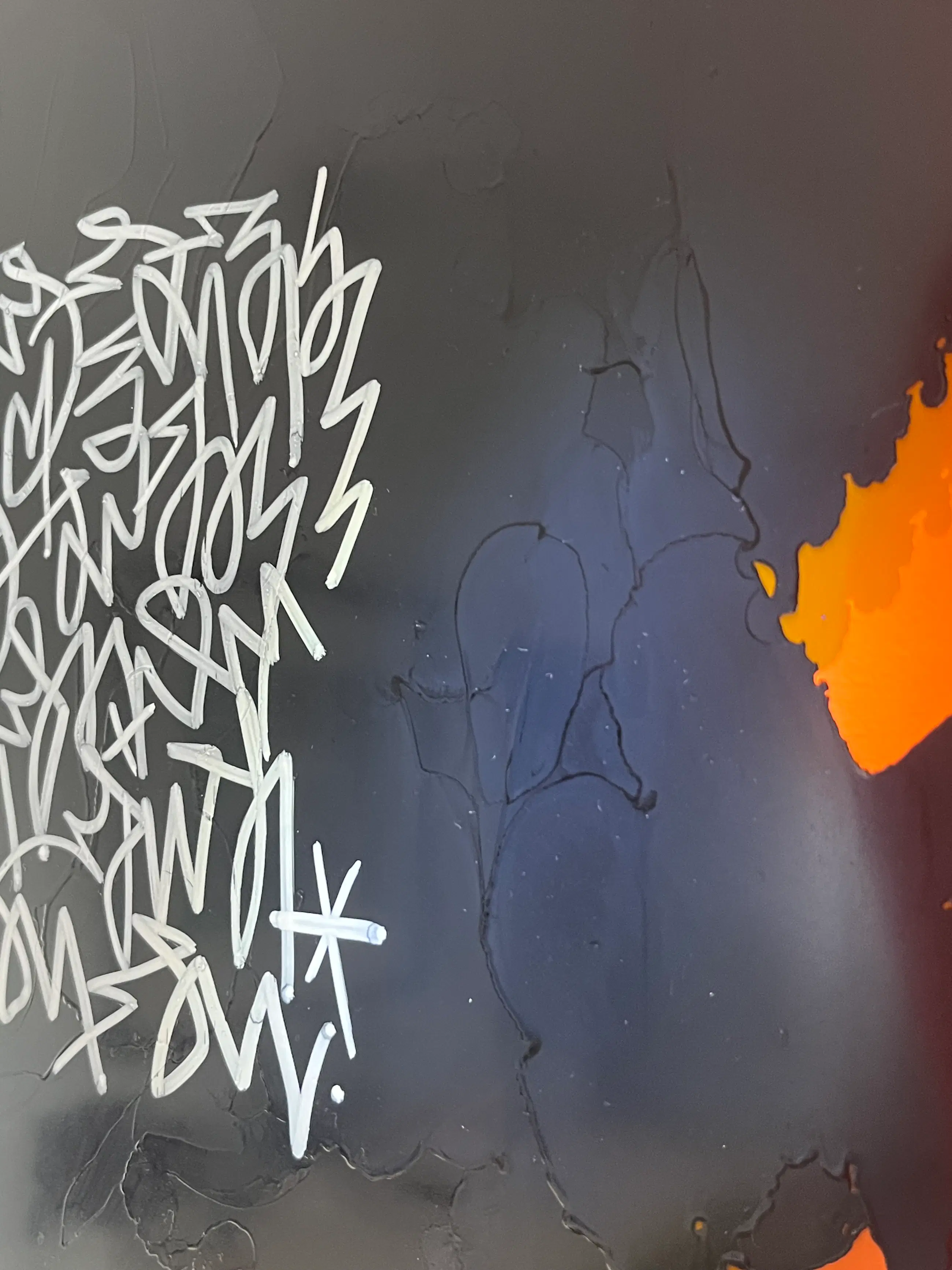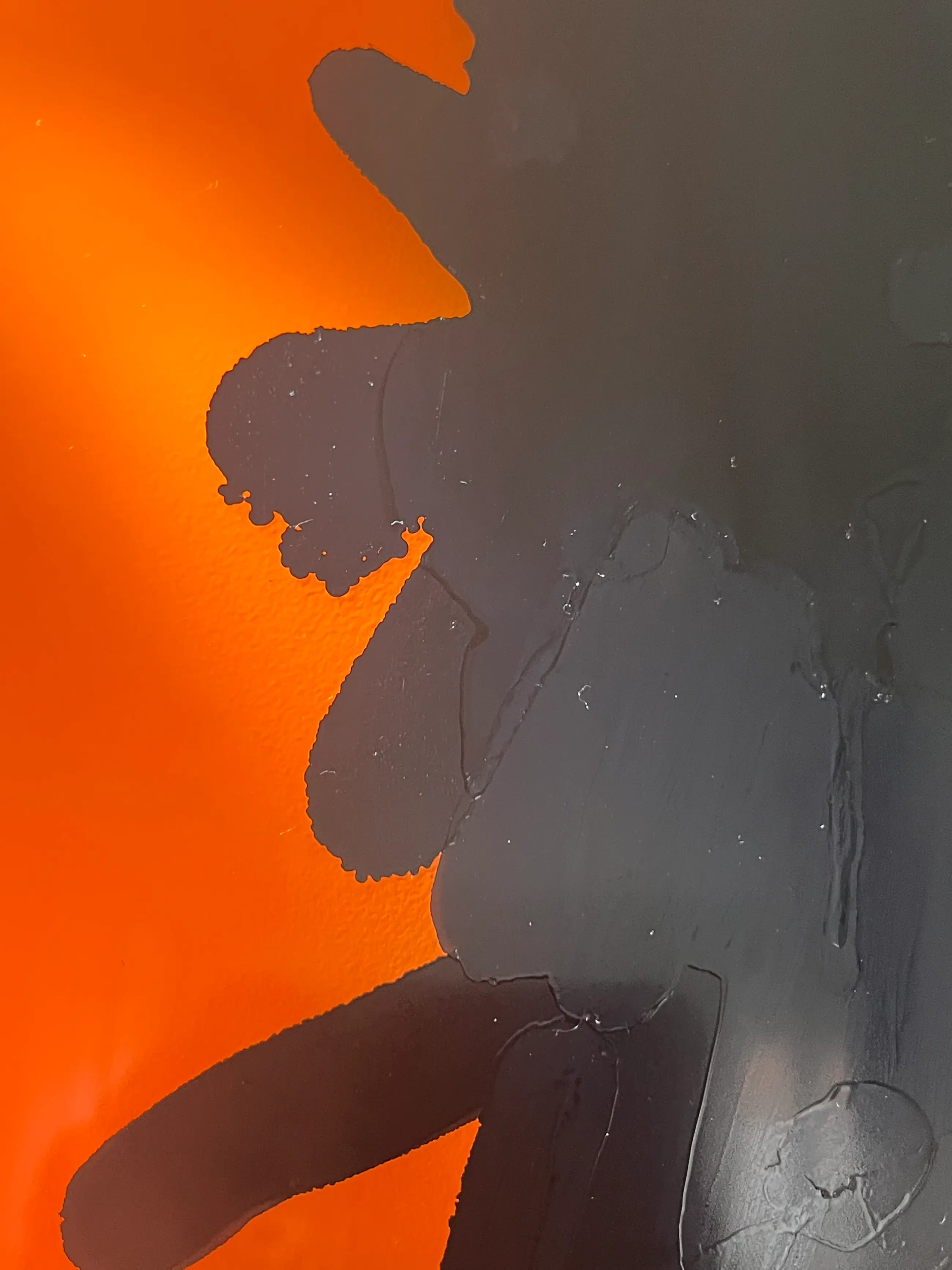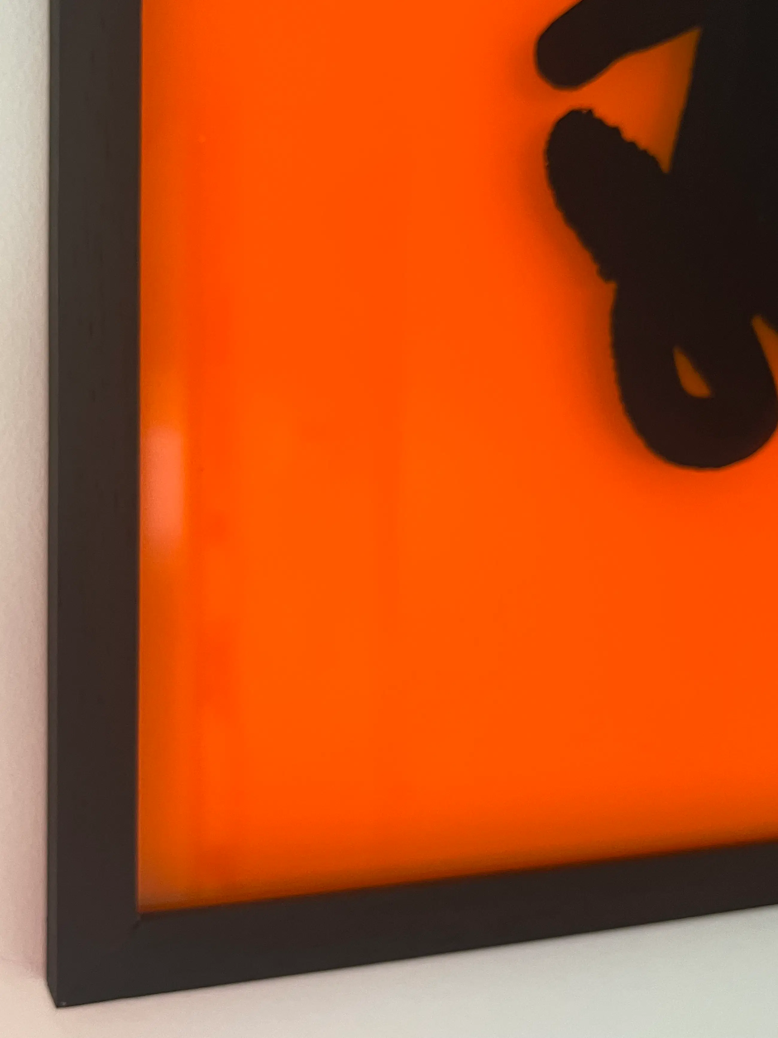 Het werk valt direct op door het krachtige kleurcontrast. Van Oost maakt gebruik van een feloranje, transparante drager die fungeert als canvas voor de centrale zwarte vorm. Door de gelaagde compositie en het gebruik van plexiglas ontstaat er een bijzondere dieptewerking.
