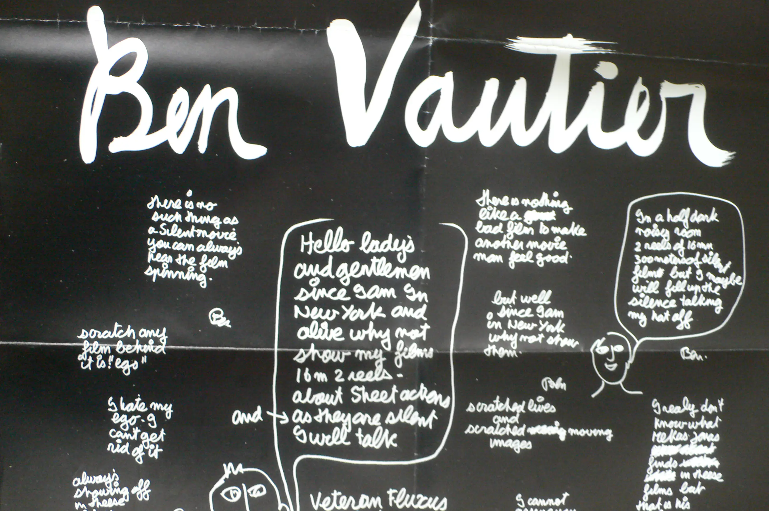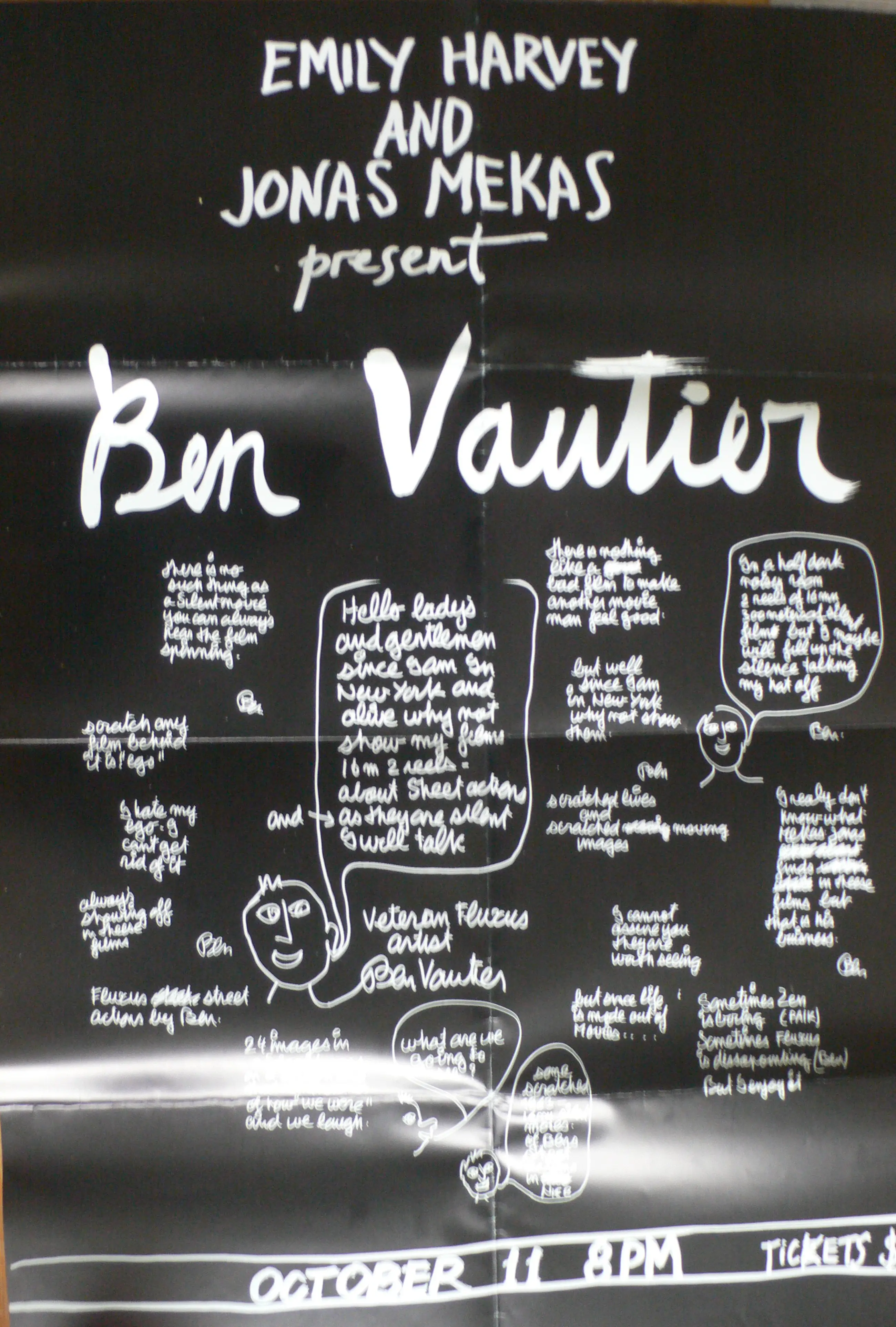 Poster - A2-formaat, gevouwen tot A4 - Emily Harvey and Jonas Mekas presents Ben Vautier - Amerikaanse poster, zonder jaartal. Ondanks de vouwen, de poster werd opgevouwen verstuurd, een mooi Ben Vautier-item. Zeldzaam!
