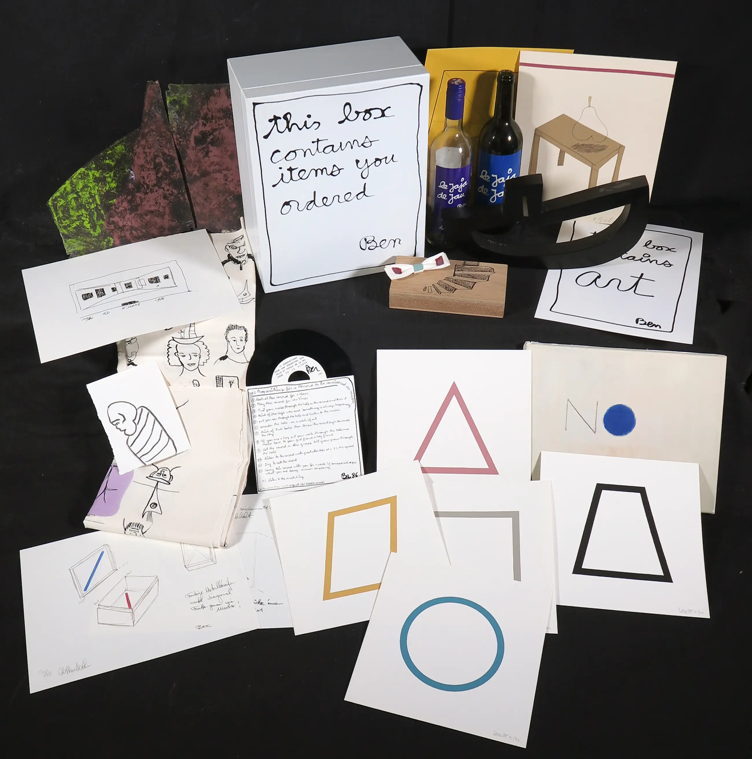 Bij het item krijgt u ook twee (lege) wijnflessen met etiketten ontworpen door Ben Vautier.