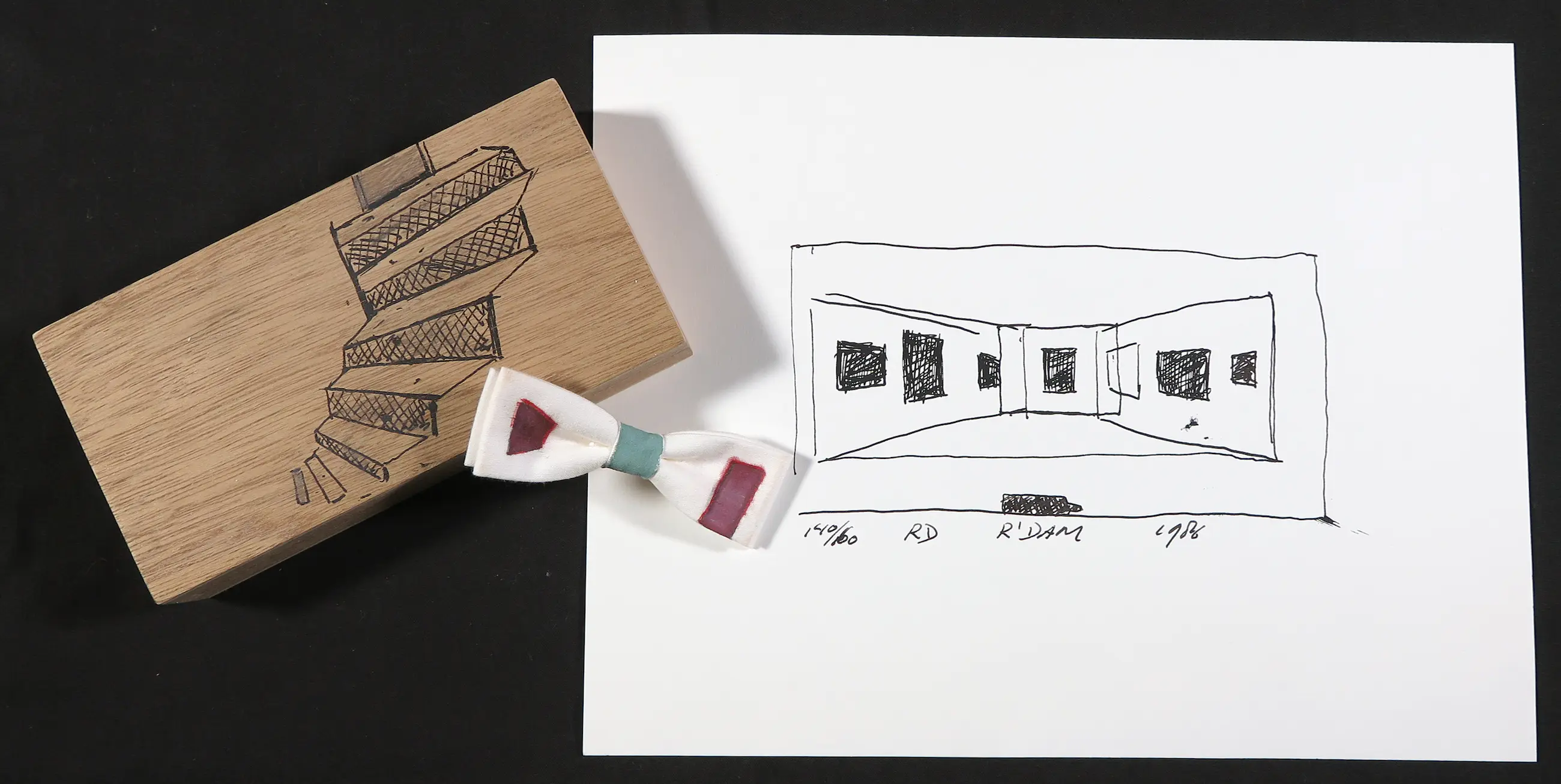 René Daniels - Zeefdruk/tekening en een beschilderde vlinderstrik 'De kelder de zolder'