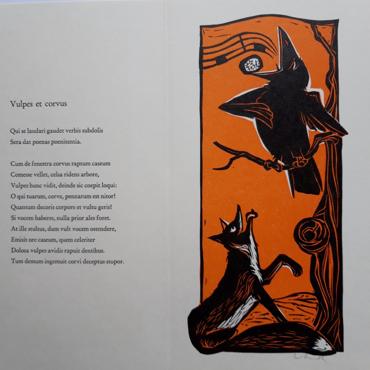 FALTBLATT, 4-SEITIG, 145 x 265 MM (GESCHLOSSEN). SEITE 1 UNBEDRUCKT, SEITE 2 EINFARBIG SCHWARZER FABELTEXT (VULPES ET CORVUS), SEITE 3 MIT BLEISTIFT SIGNIERTER 2-FARBEN-LINOLSCHNITT VON BENNO HUTH, SEITE 4 MIT 3-ZEILIGEM TEXT ZUM GRAFISCHEN WERK IN SCHWARZDRUCK