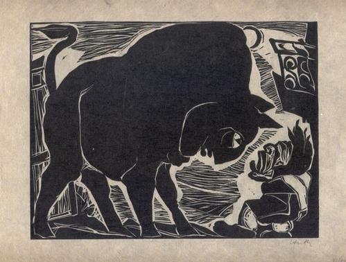 Benno Huth - Ein Dschinni erscheint dem Zwerg - zu Märchen aus 1001 Nacht - Linolschnitt - 1972