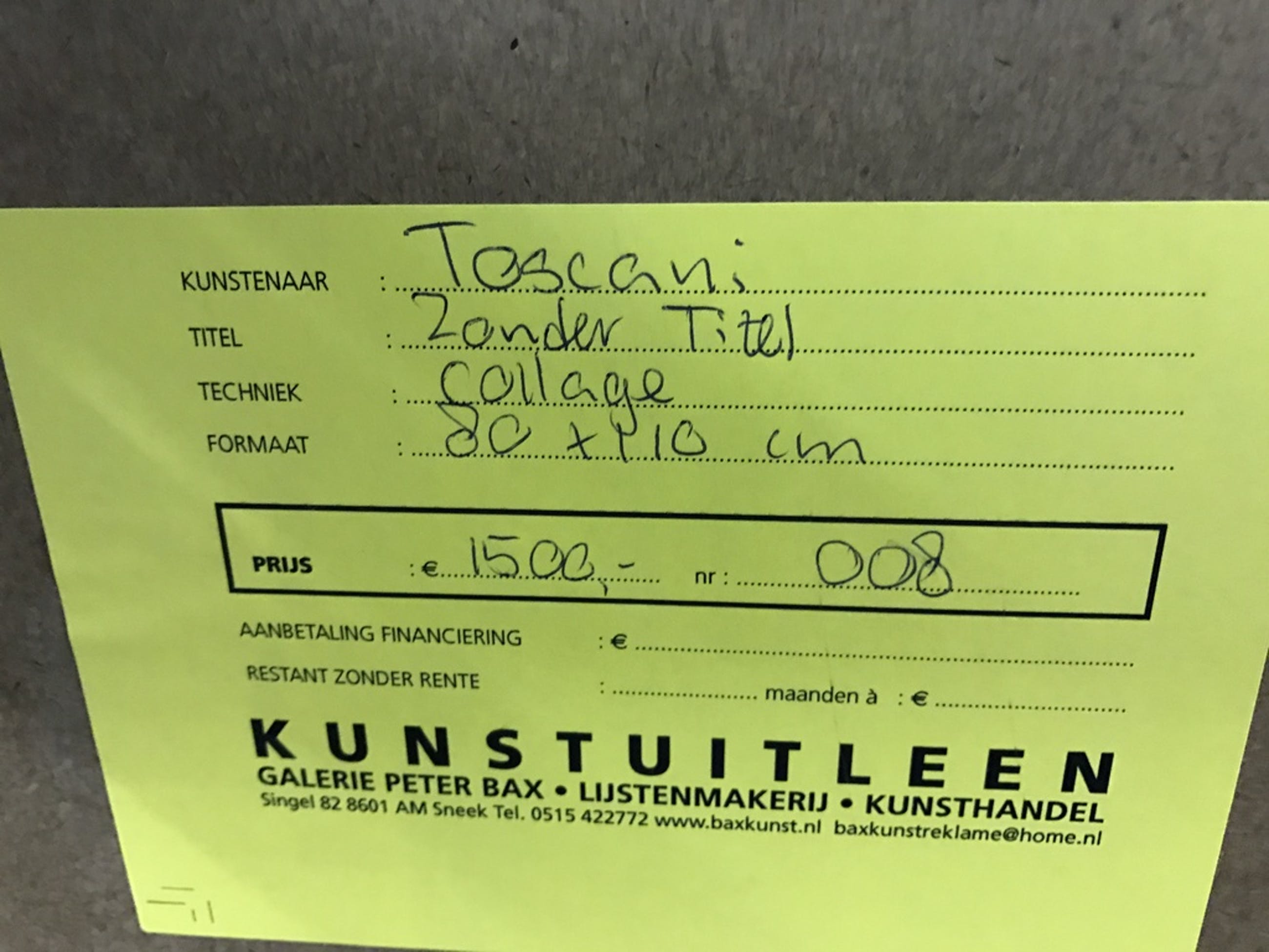 | Afhalen | Het werk is af te halen op locatie. Als koper dient u zelf verpakkingsmateriaal mee te nemen. De locatie is: Ootmarsum, Nederland |