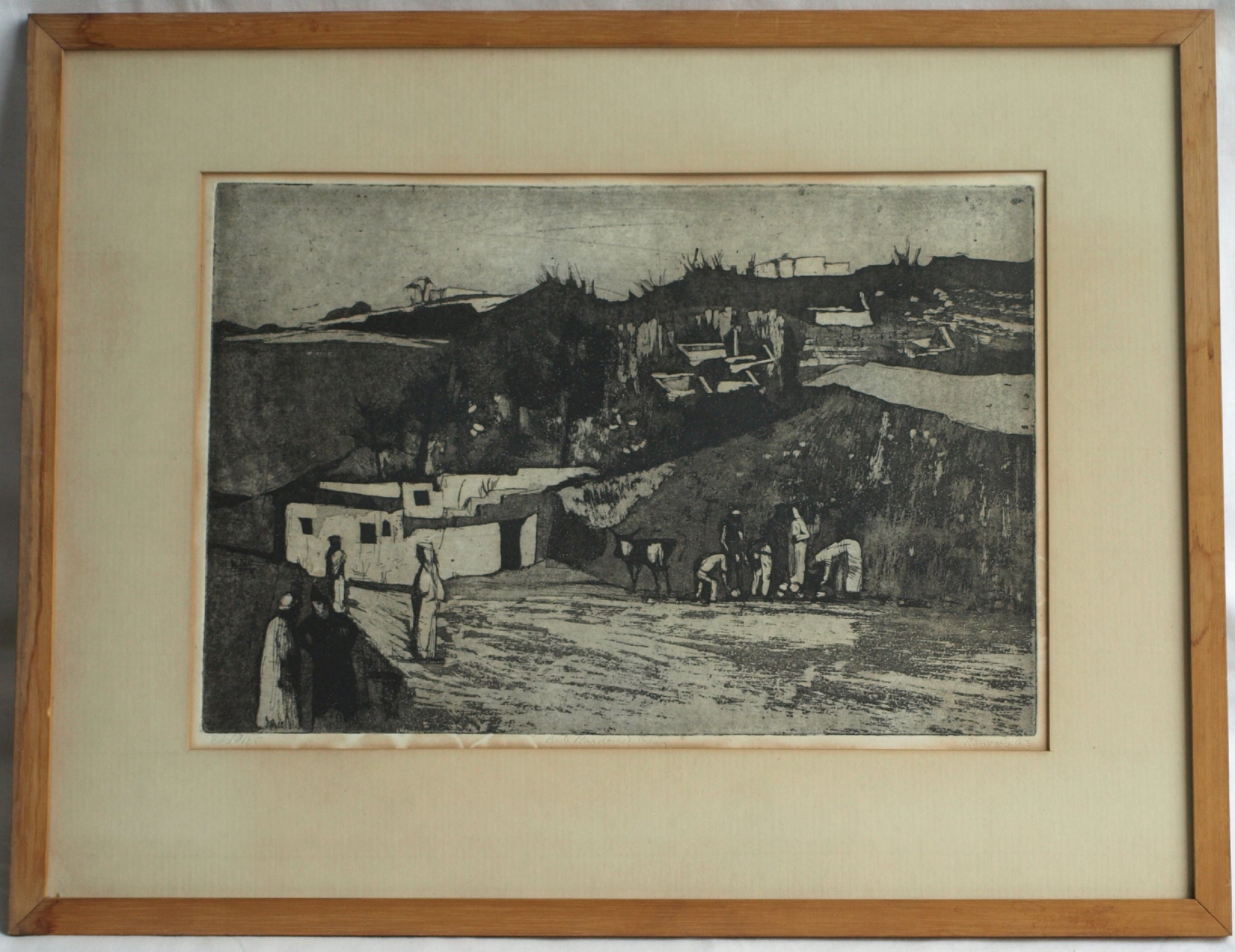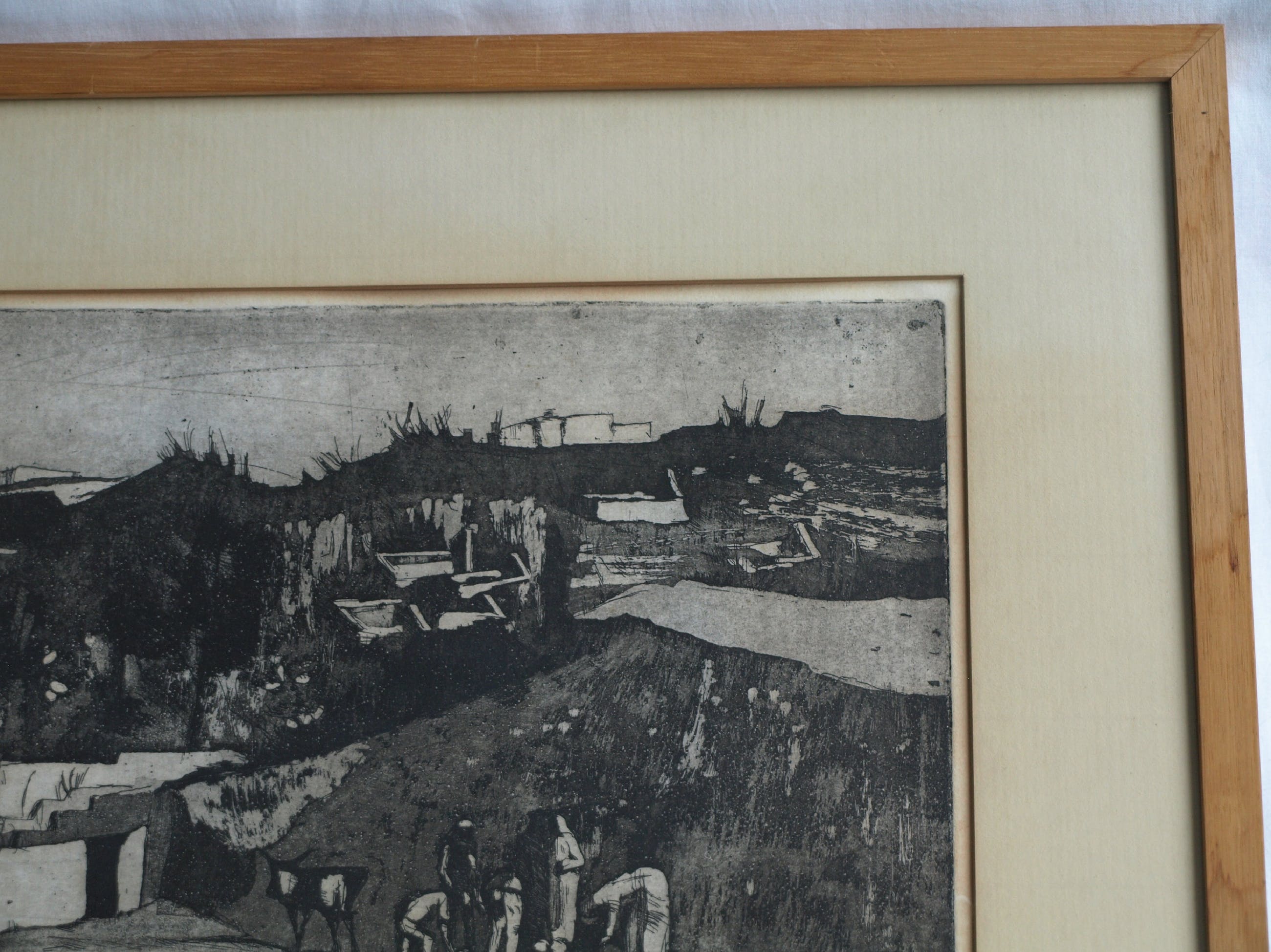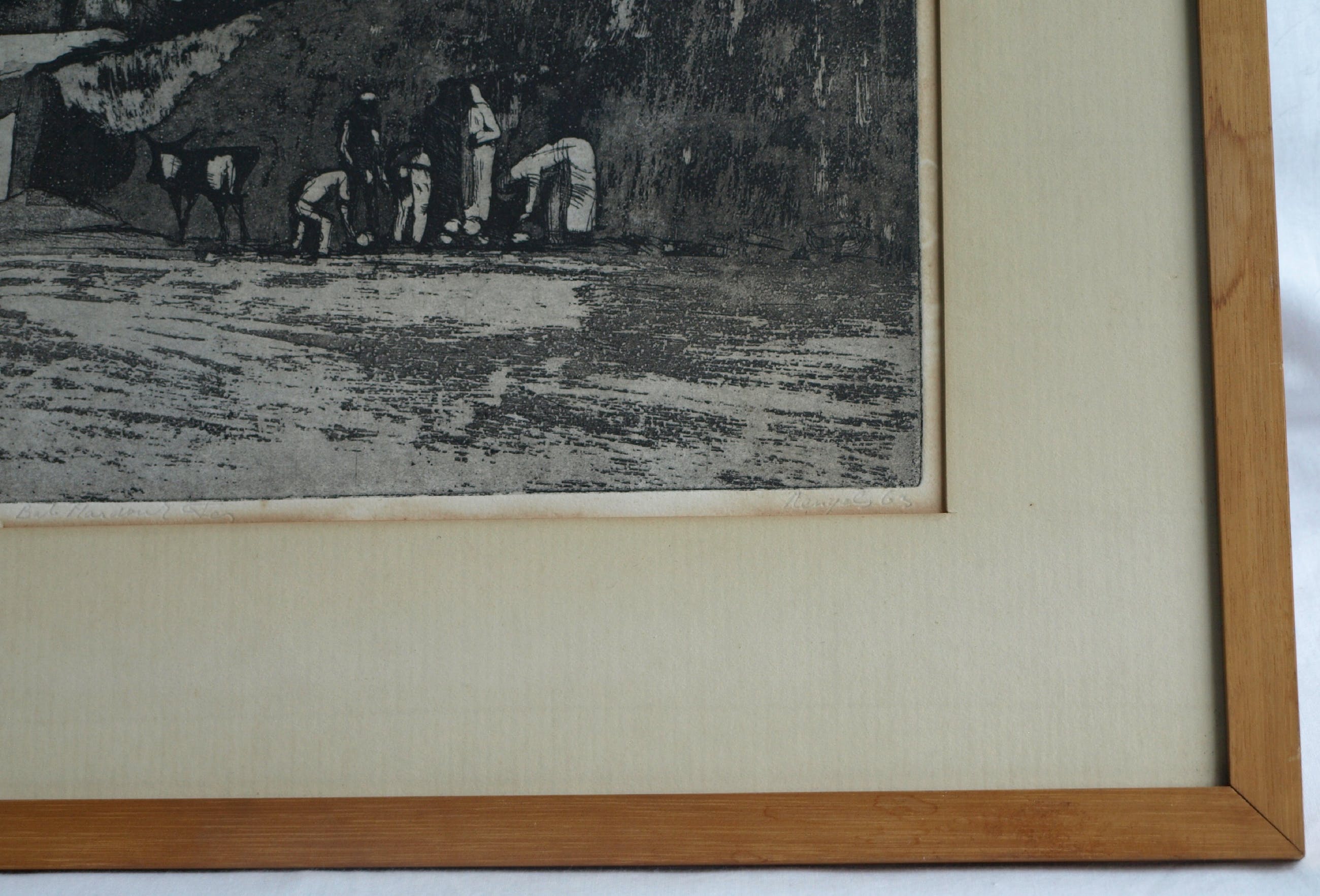 Een ingelijste ets uit 1963 van de Nederlandse /