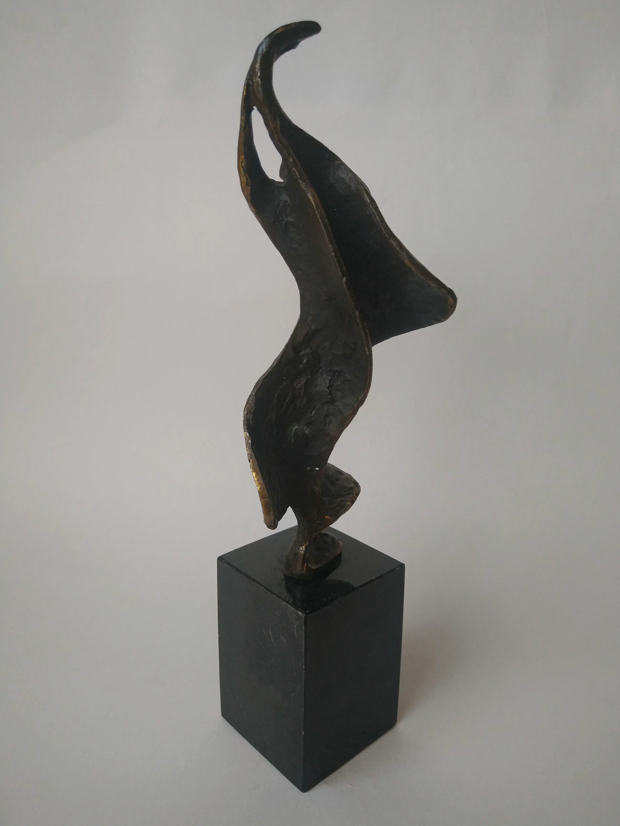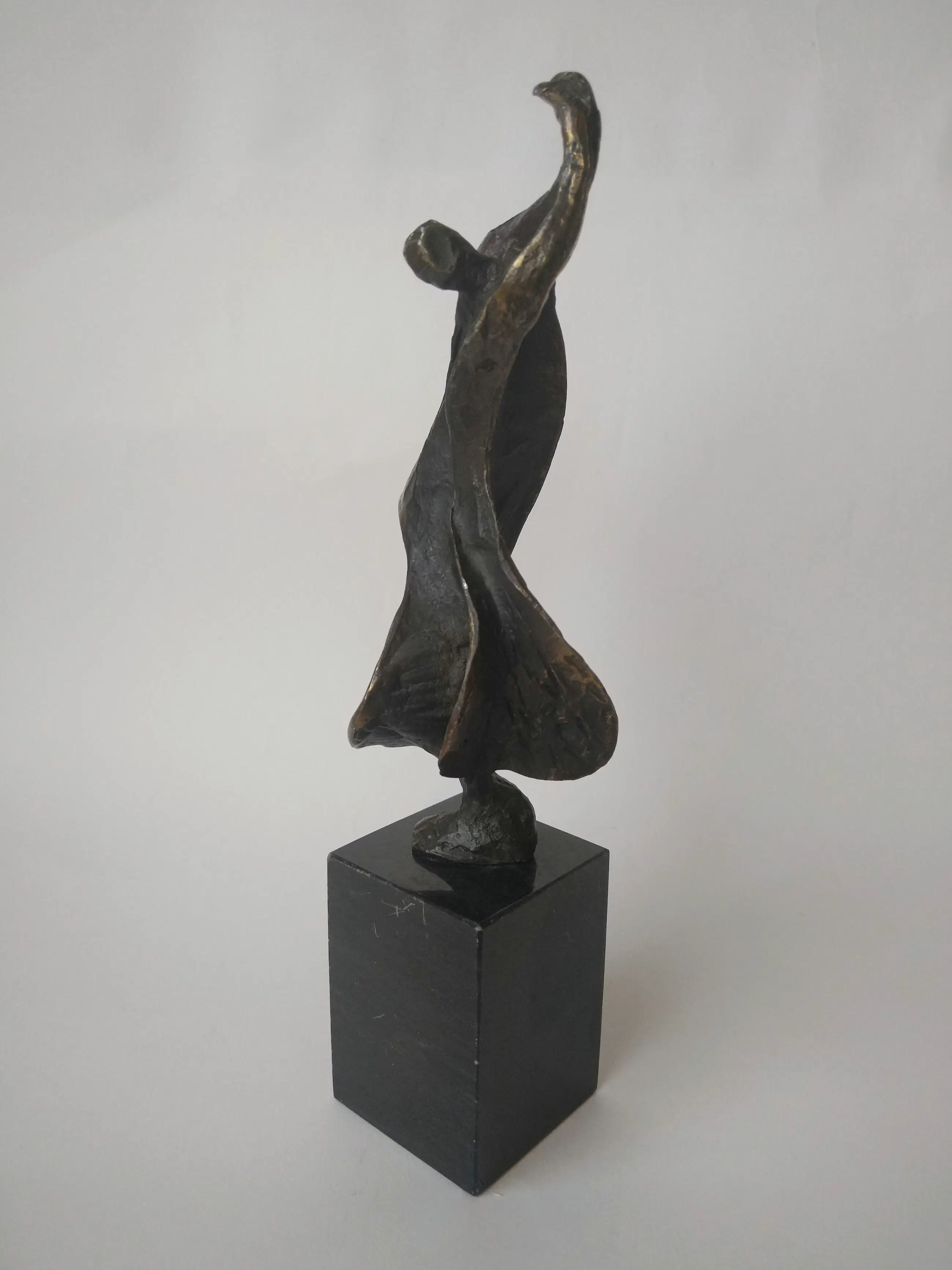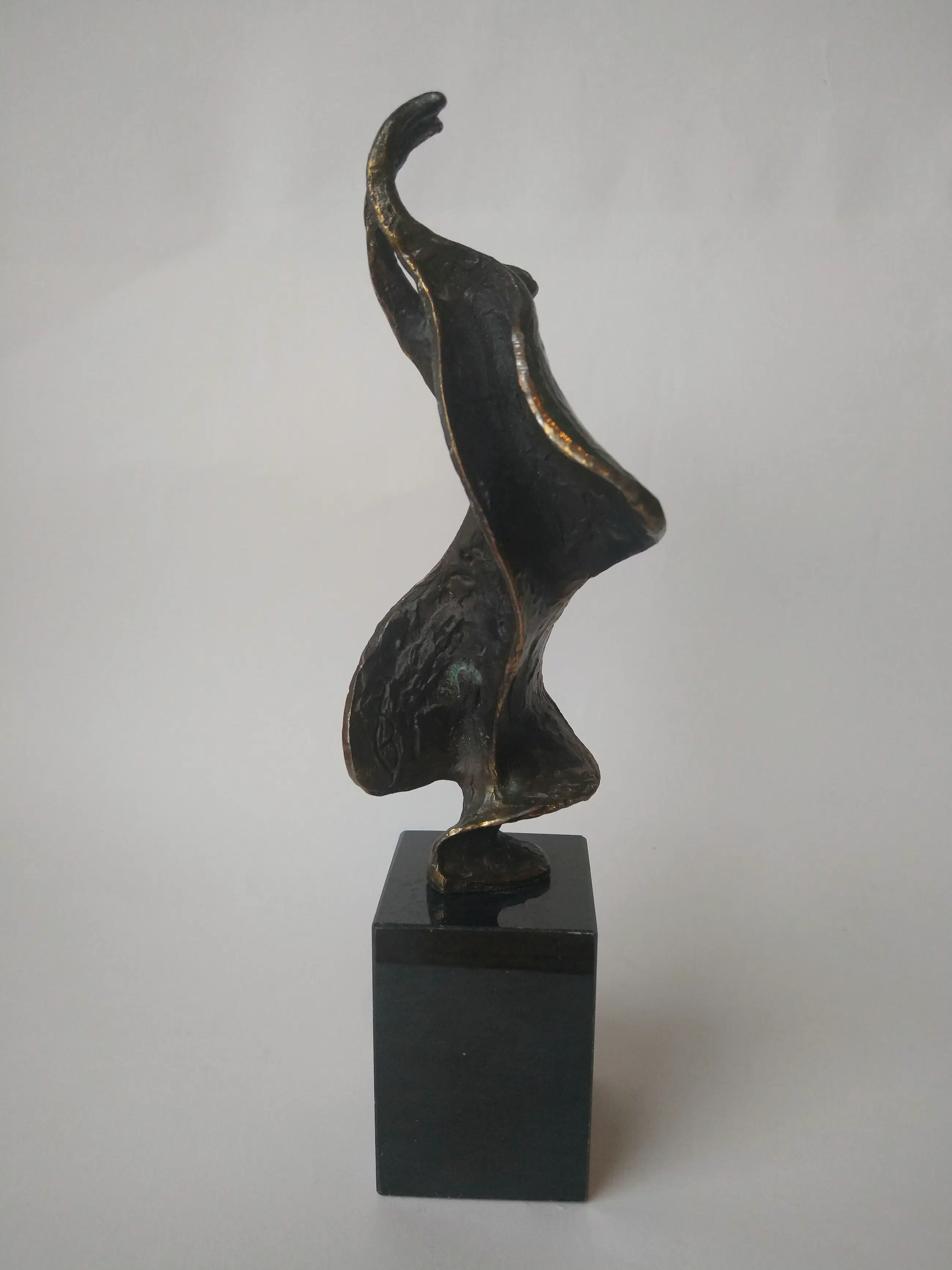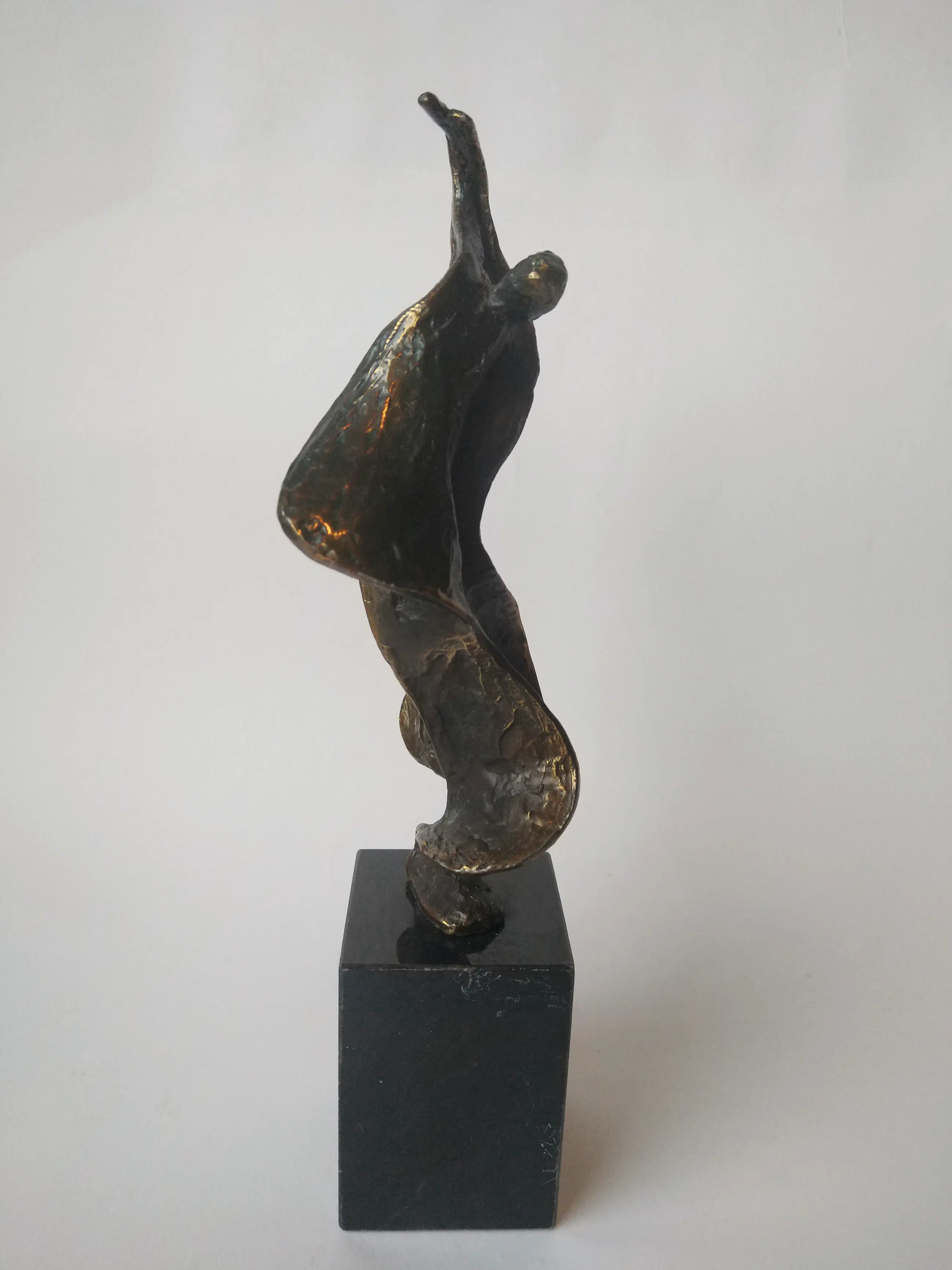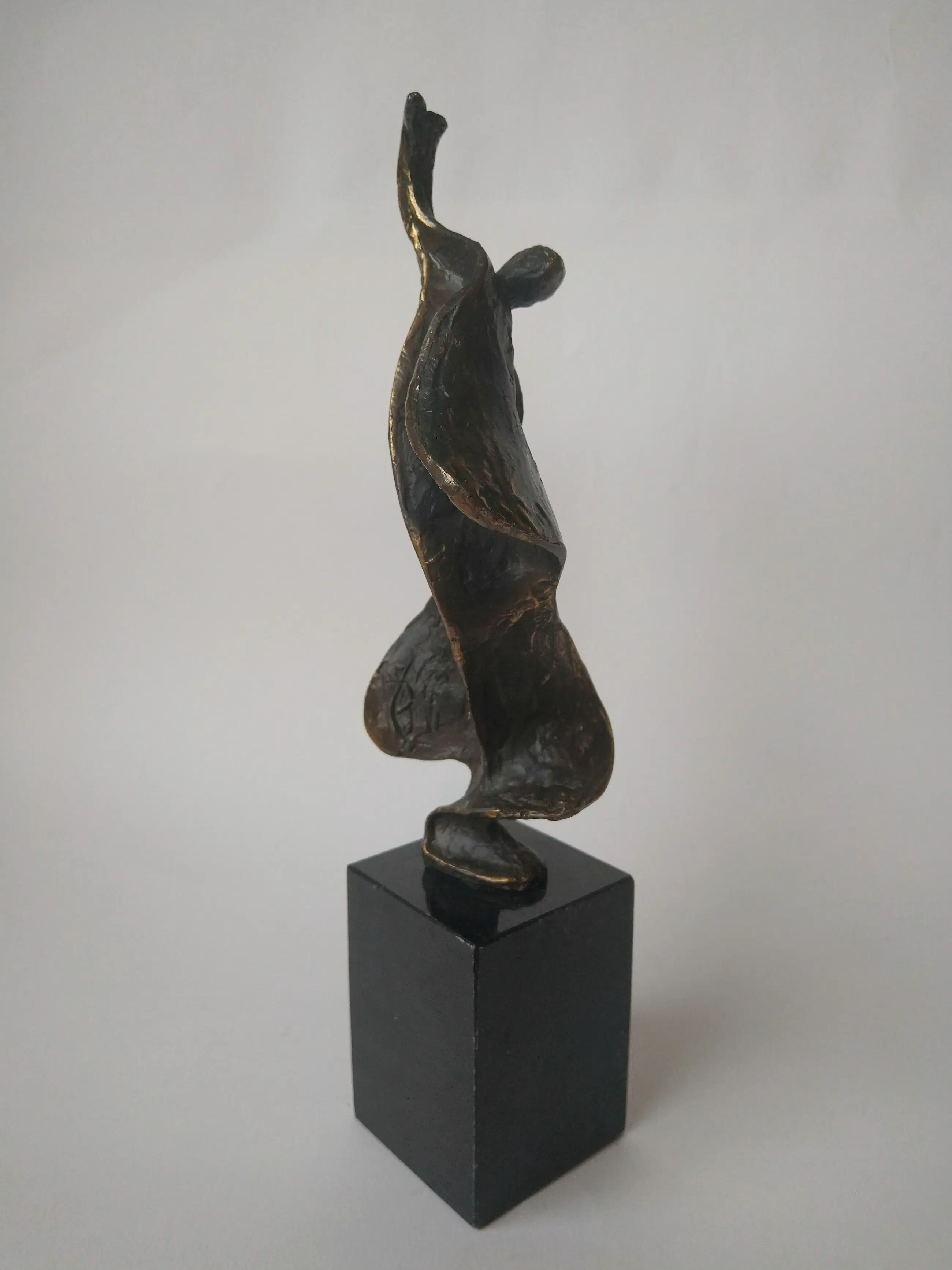 Prachtig gepatineerd bronzen beeld van een danseres. Dynamisch beeld. . Mooi van verschillende kanten. Ontworpen en gesigneerd door Bernadette Leijdekkers. Afmetingen inclusief voet.