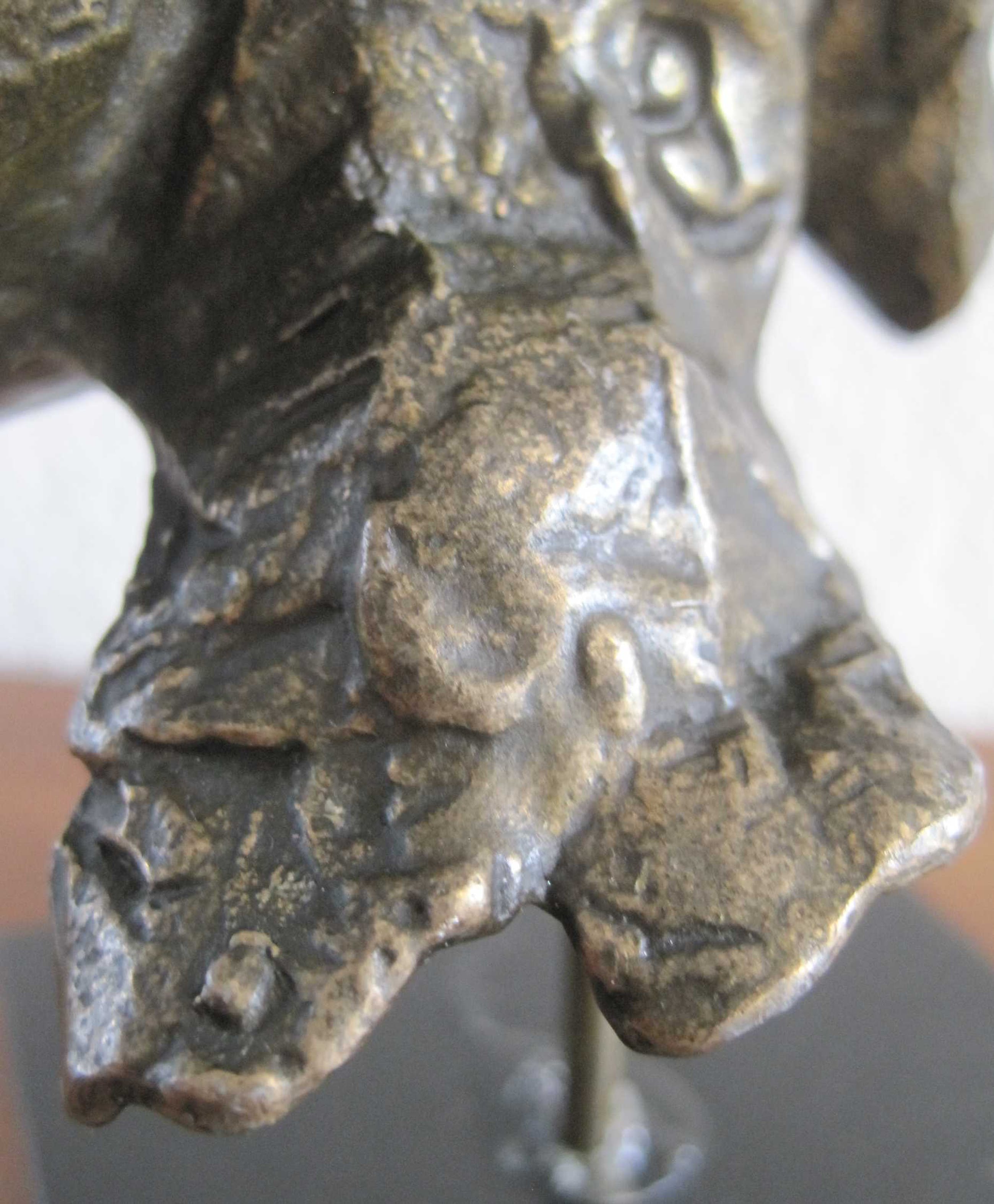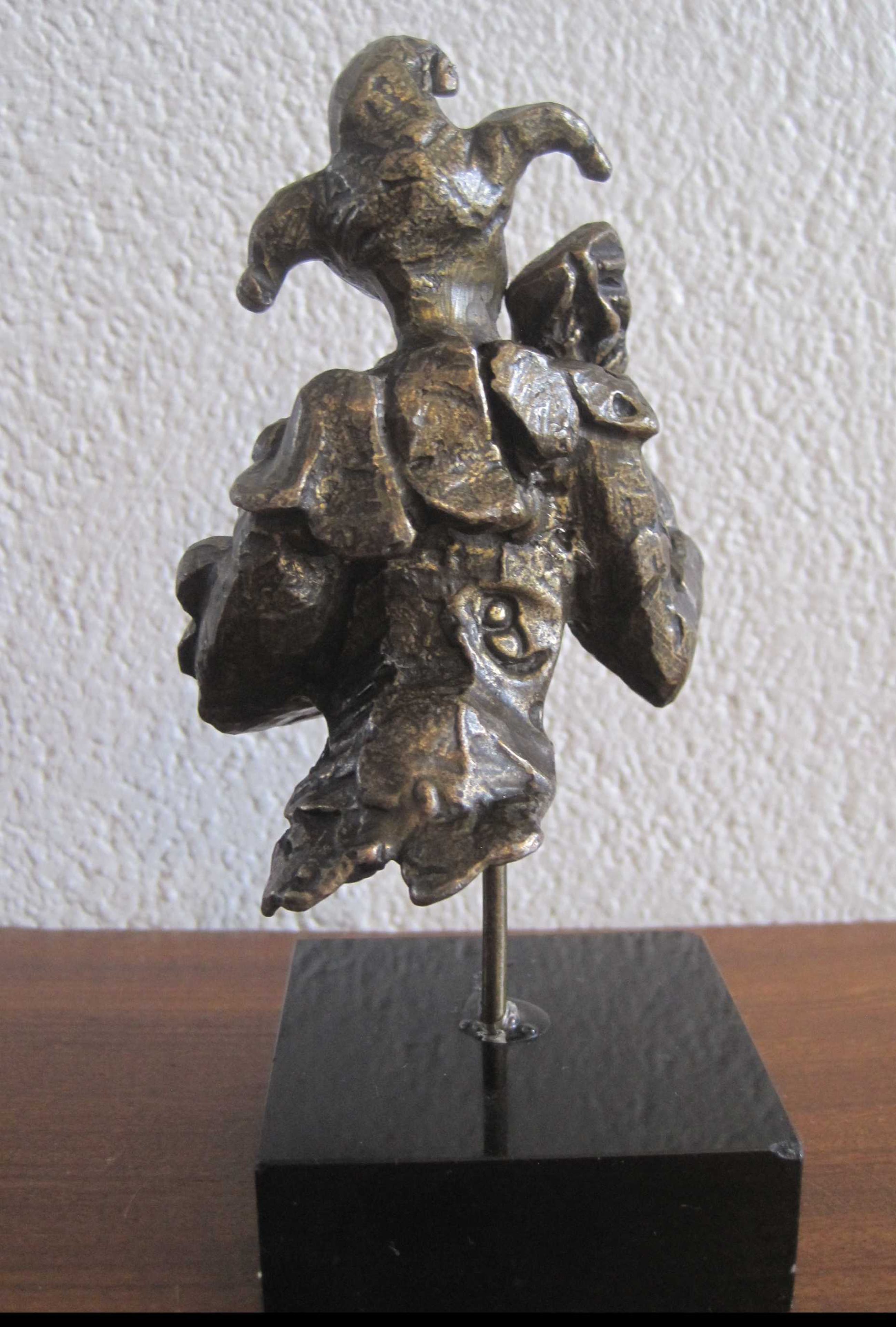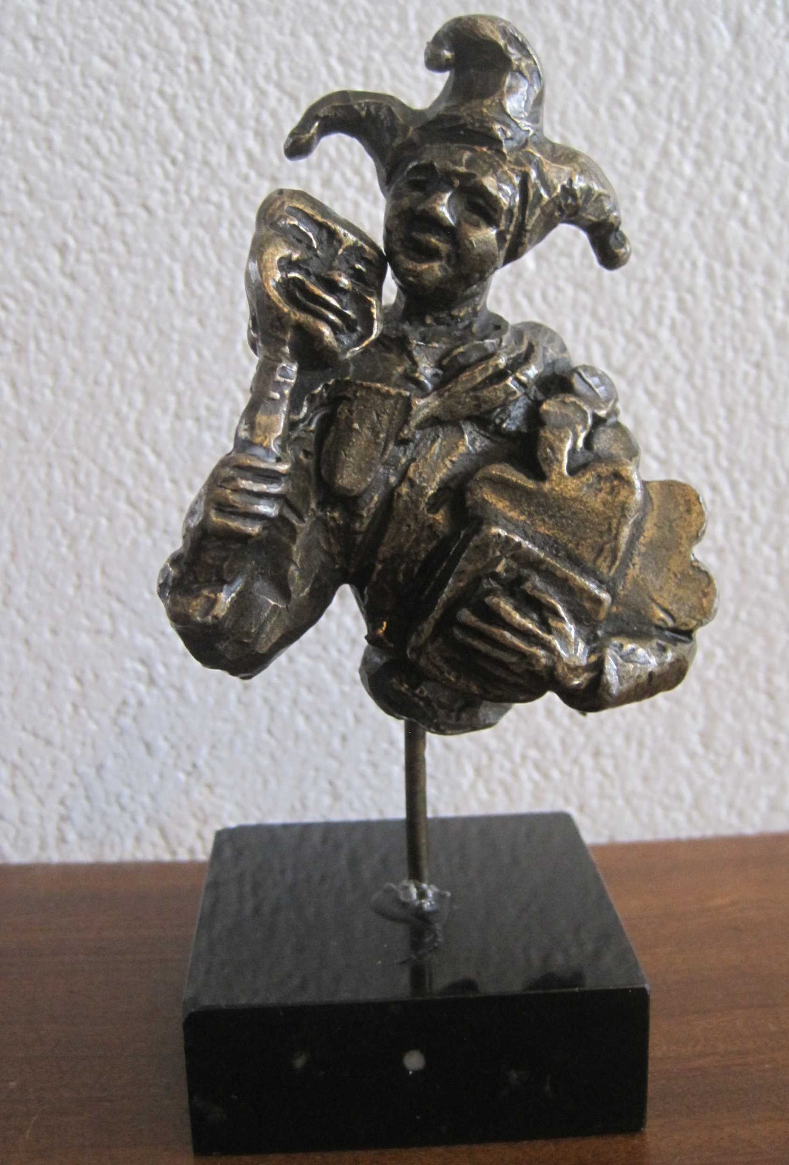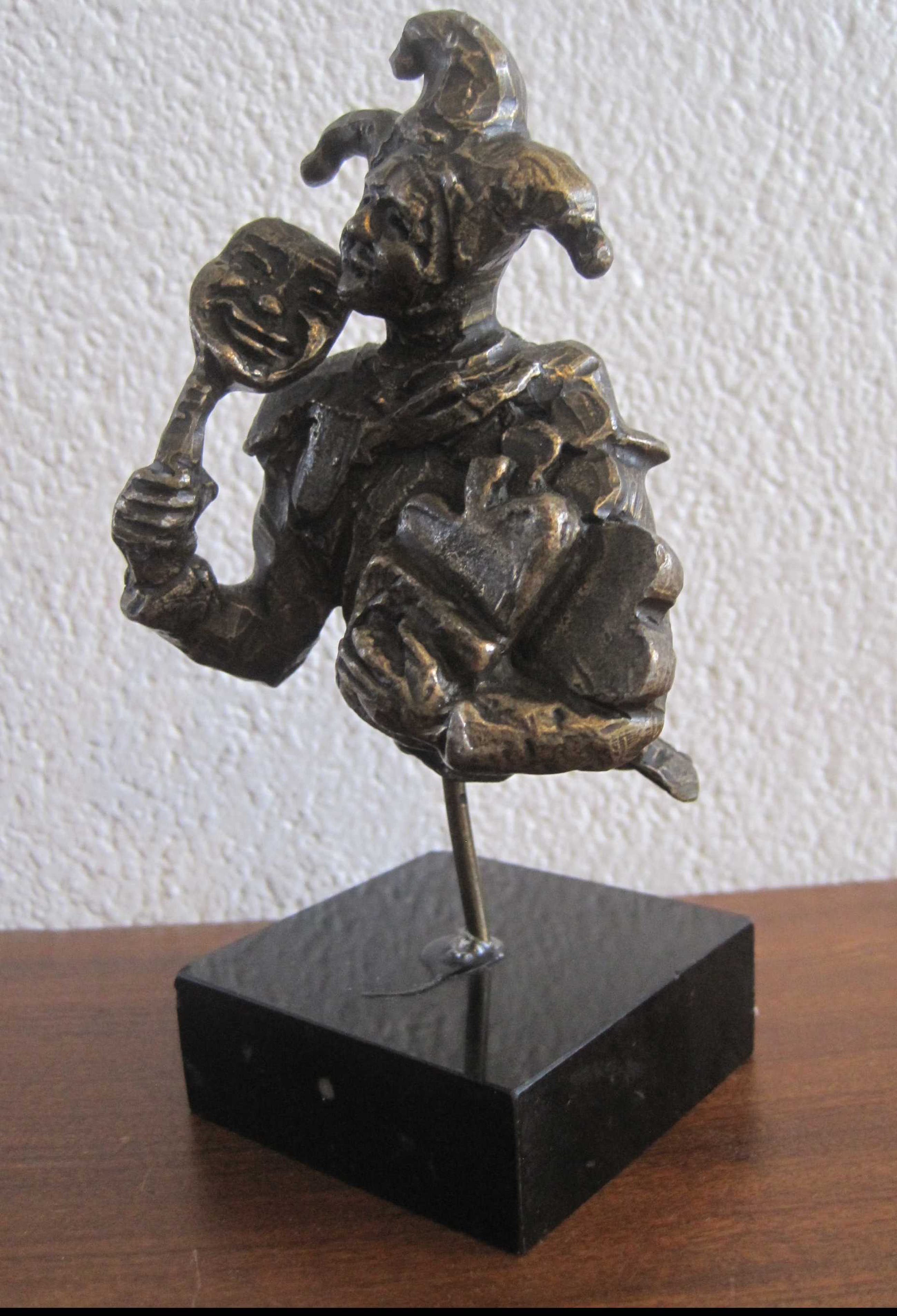 Een pakkend en zelden aangeboden beeldje van een Nar met een dubbelzijdig masker. De ene kant lacht, de andere kant huilt. Dit beeldje is erg zwaar voor het formaat en gemaakt van metaal dat bronskleurig is gepatineerd. Gesigneerd op de achterkant BL. Naar mijn idee is het beeldje ooit gevallen, daardoor zit het masker dicht bij het gezicht van de nar. Het beeldje is bevestigd op een dun koperen staander die is bevestigd in een zwart marmeren sokkel. Er zit enige roterende speling op het beeldje ( heel weinig ) en de staander is duidelijk opnieuw gelijmd. 2 chips van de sokkel. Kijkt u goed naar de foto's.