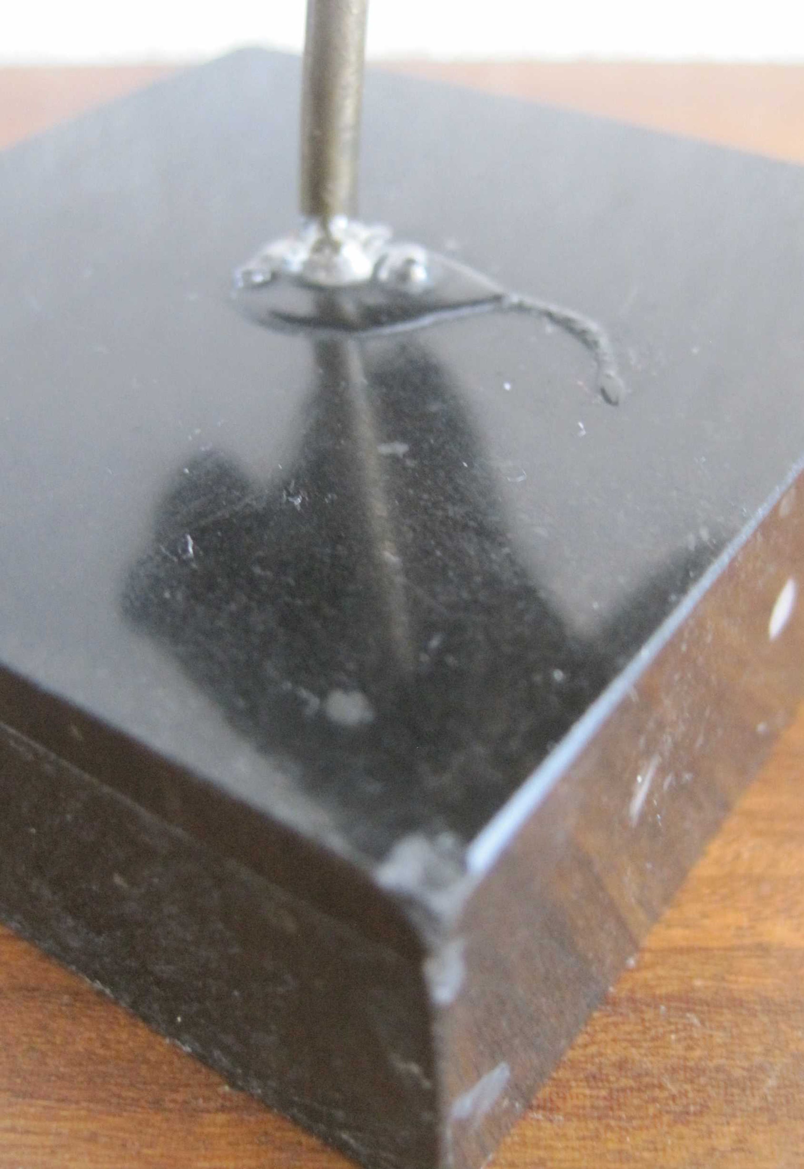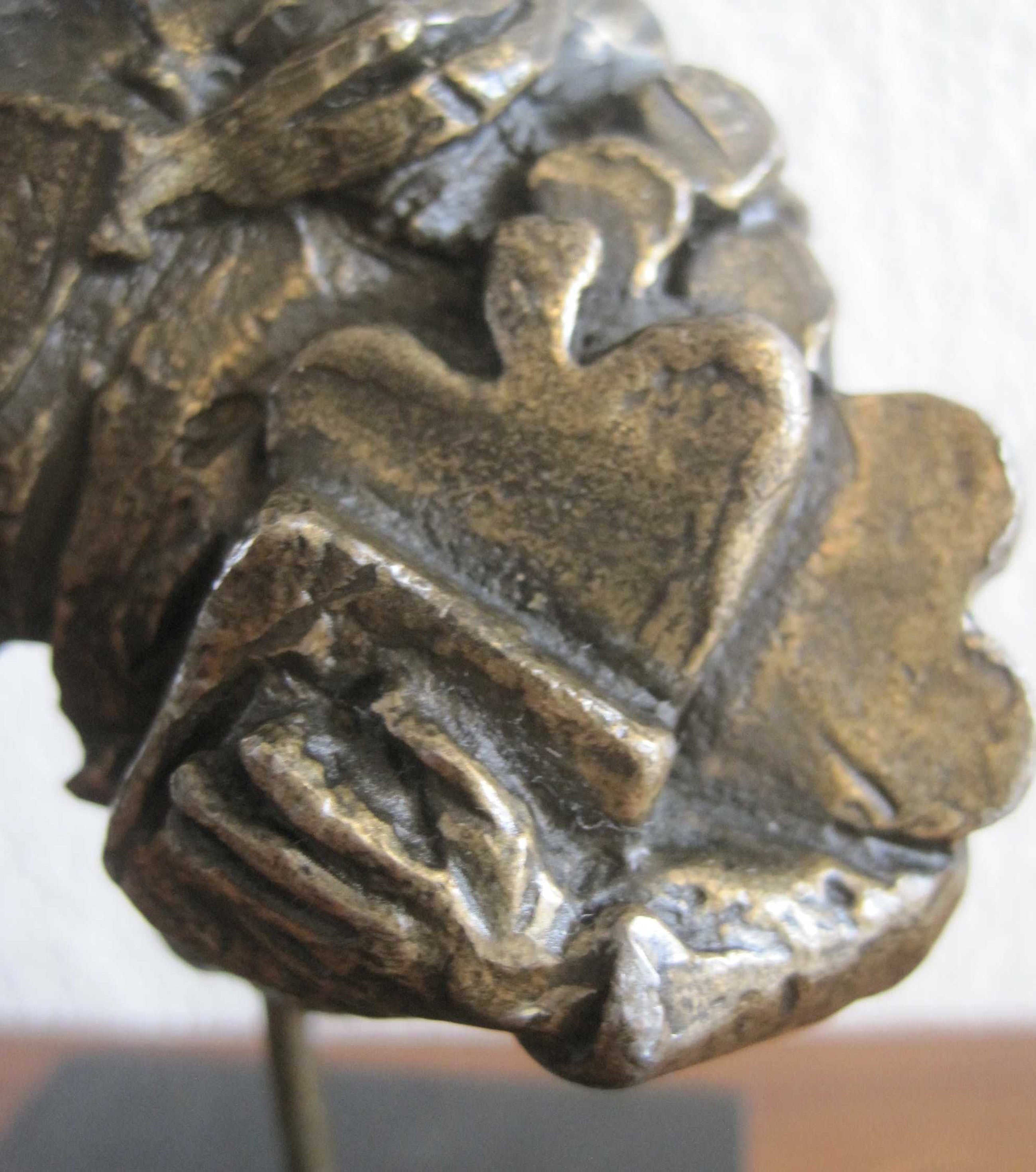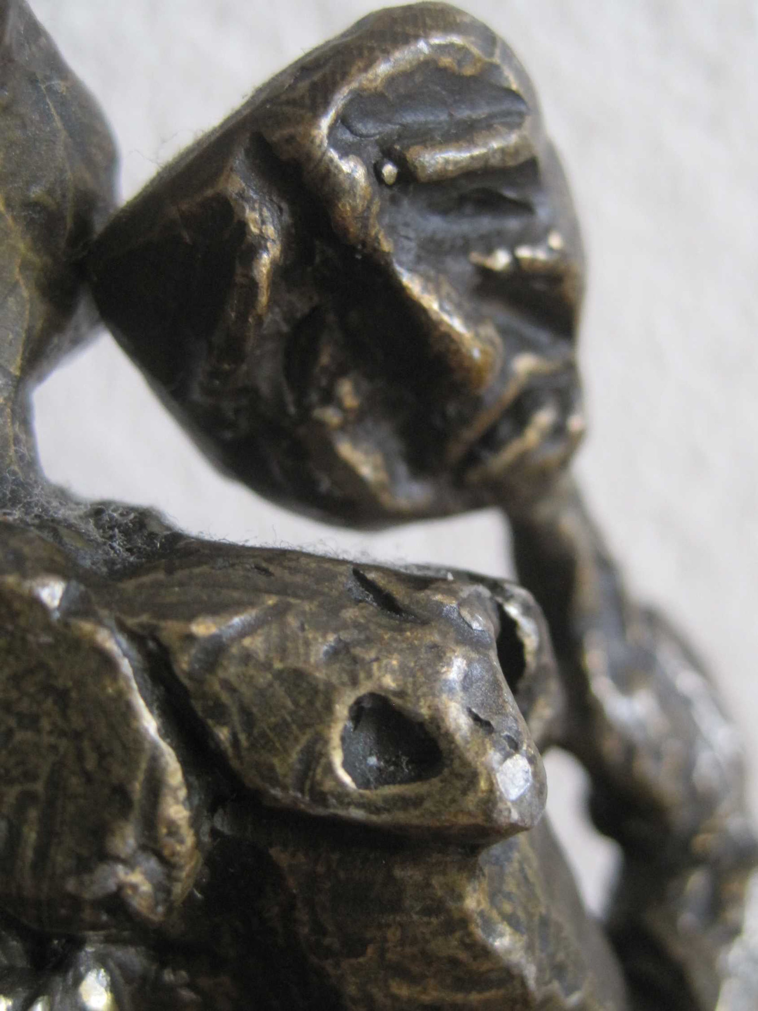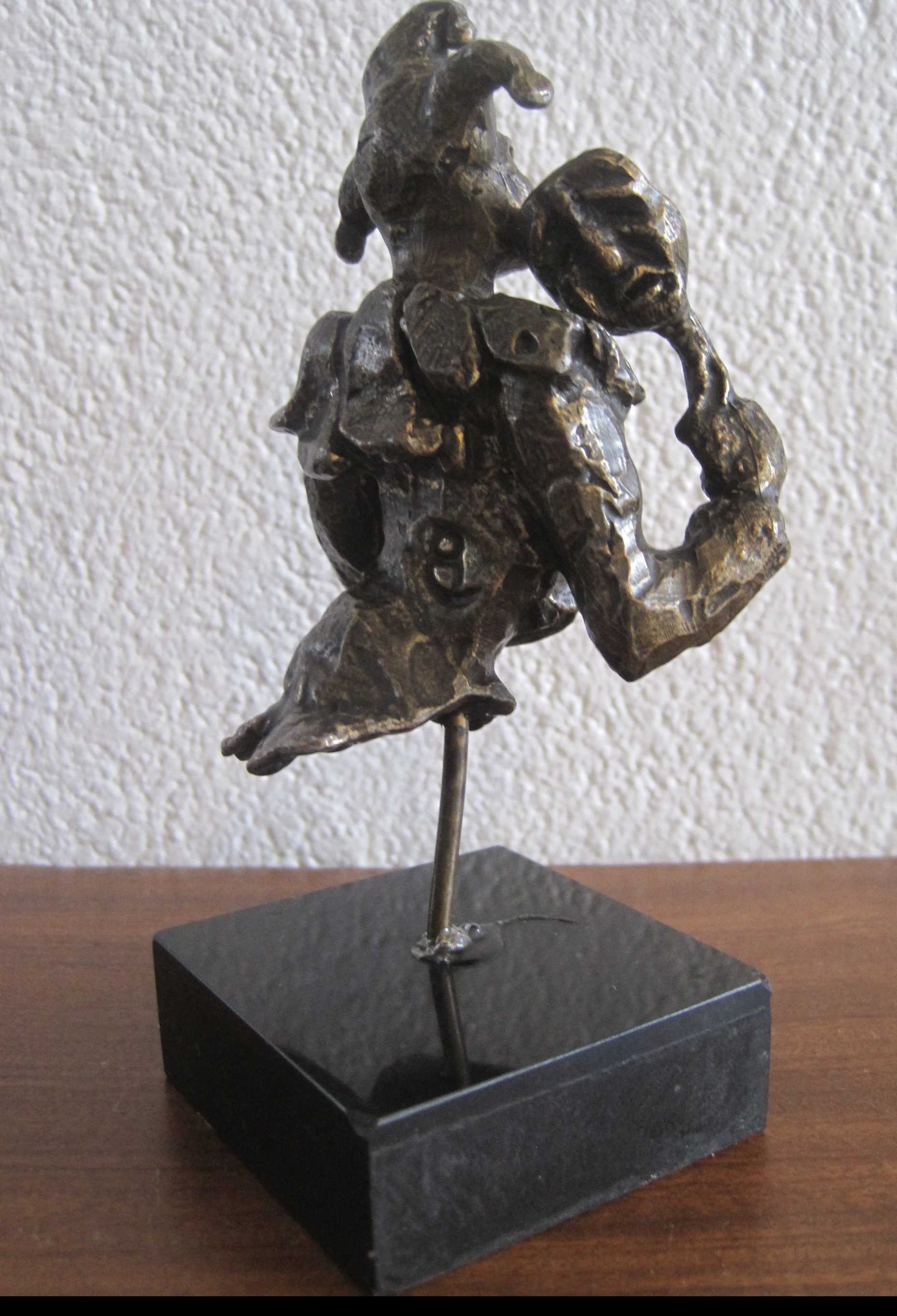 Een pakkend en zelden aangeboden beeldje van een Nar met een dubbelzijdig masker. De ene kant lacht, de andere kant huilt. Dit beeldje is erg zwaar voor het formaat en gemaakt van metaal dat bronskleurig is gepatineerd. Gesigneerd op de achterkant BL. Naar mijn idee is het beeldje ooit gevallen, daardoor zit het masker dicht bij het gezicht van de nar. Het beeldje is bevestigd op een dun koperen staander die is bevestigd in een zwart marmeren sokkel. Er zit enige roterende speling op het beeldje ( heel weinig ) en de staander is duidelijk opnieuw gelijmd. 2 chips van de sokkel. Kijkt u goed naar de foto's.