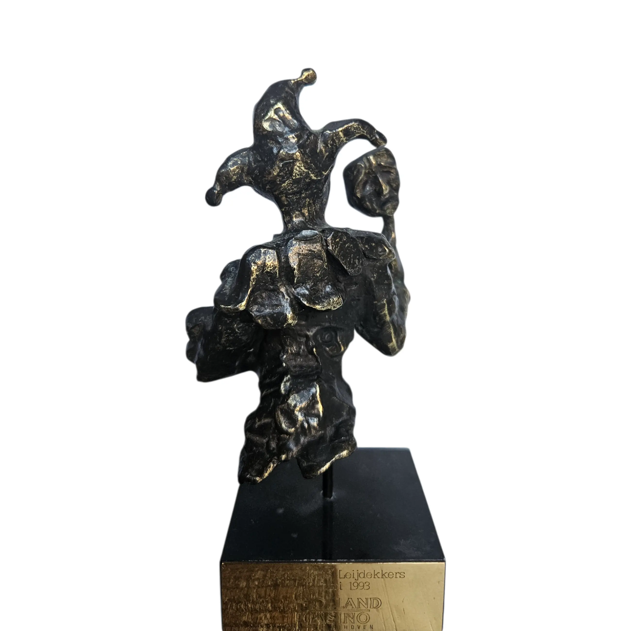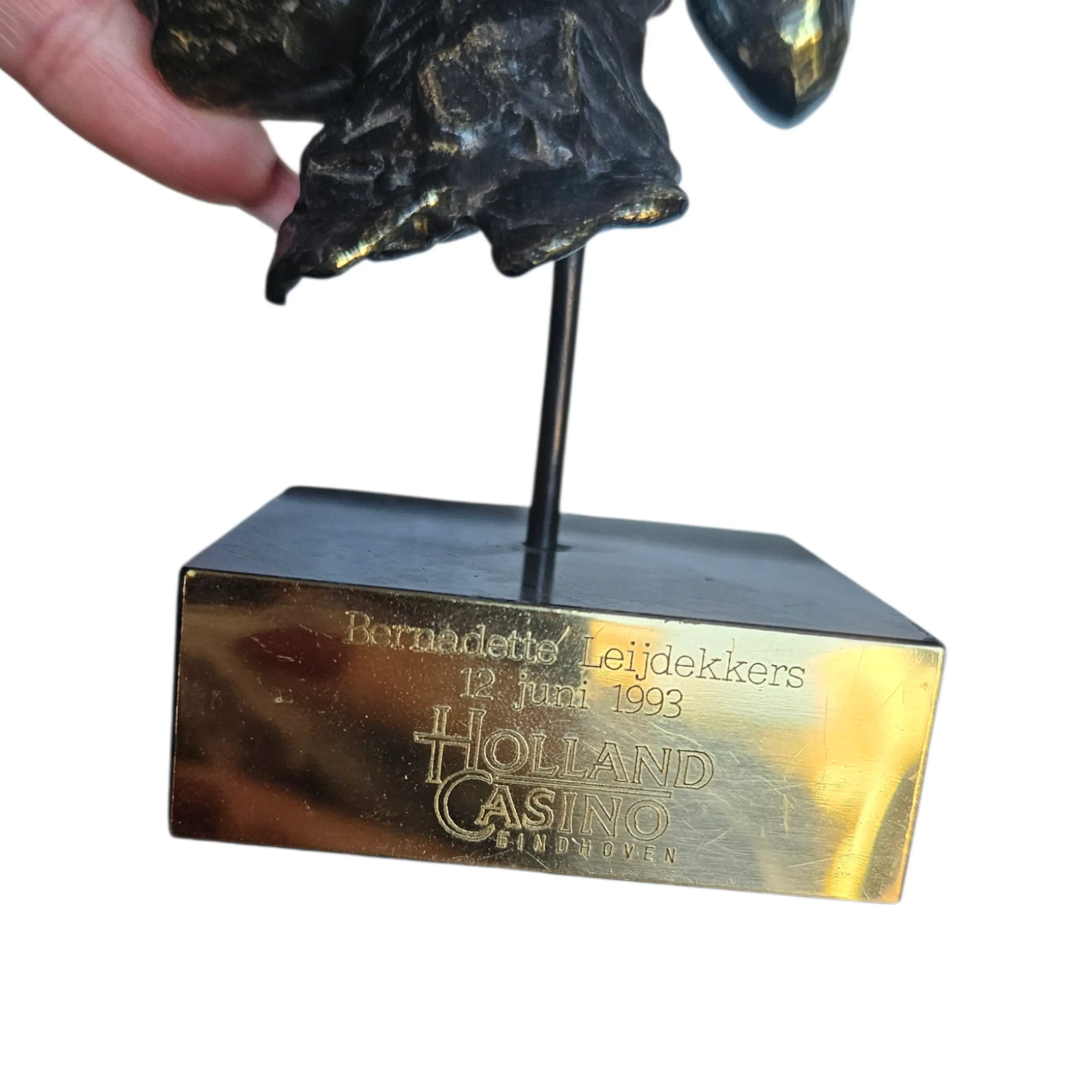Een beeldschoon zwaar beeldje op een pin, in een zwart marmeren sokkel.