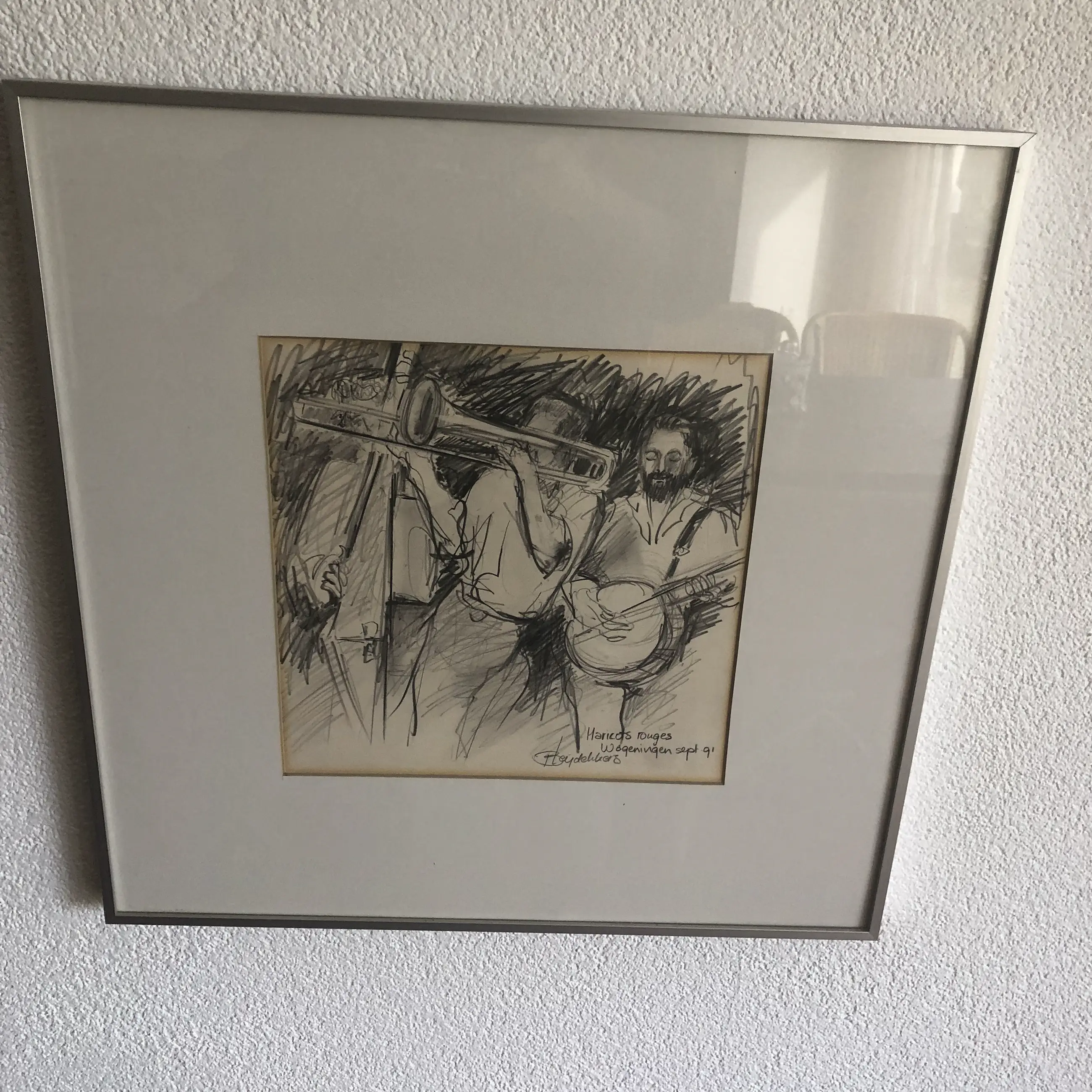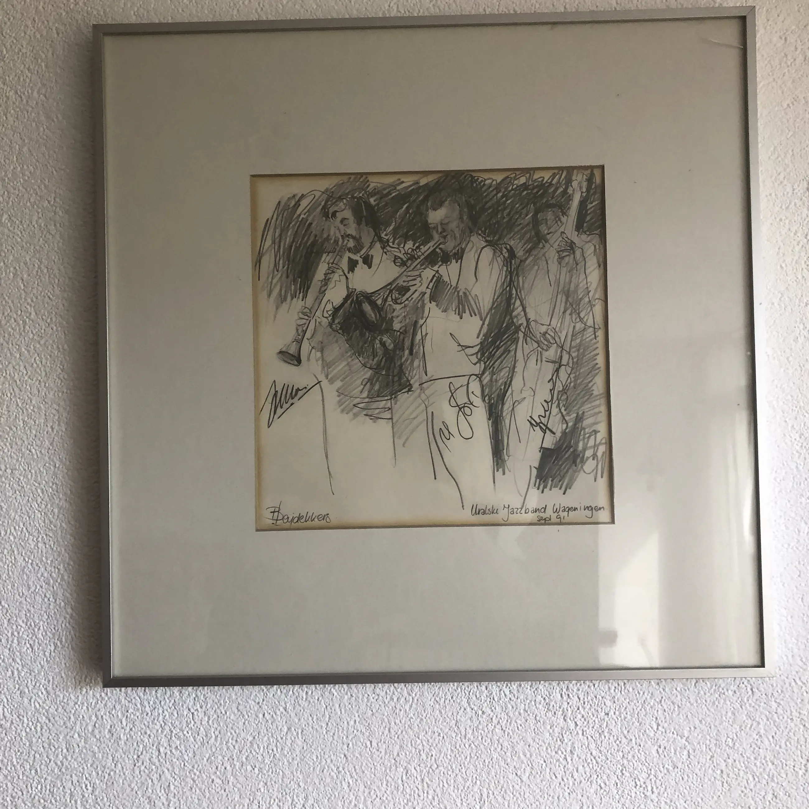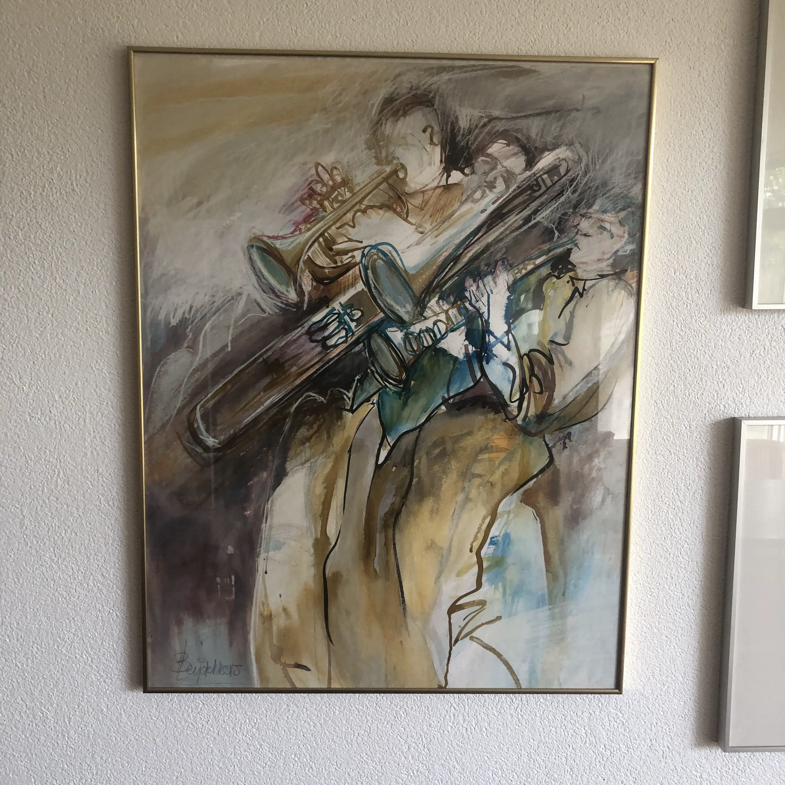 Prachtig mooi ingelijst werk van Bernadette Leijendekkers uit 1991. Dit werk is geïnspireerd en een impressie van het Wageningse Jazzfestival.